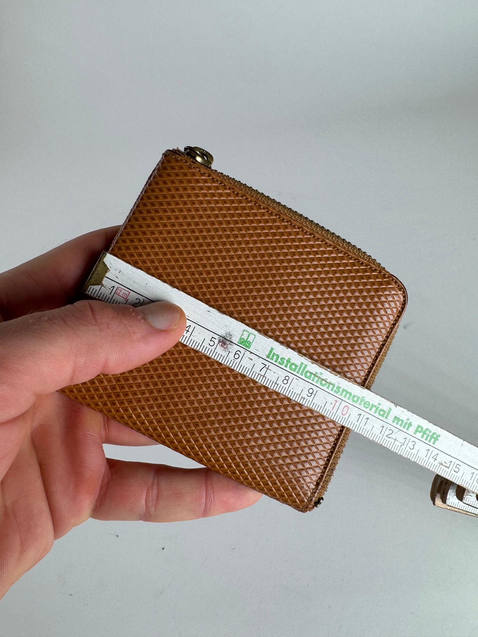 This chic cardholder is finely crafted of orange-brown patterned leather. The piece features a smooth zip closure that runs almost across the entire cardholder. The interior opens to a black and brown leather interior.