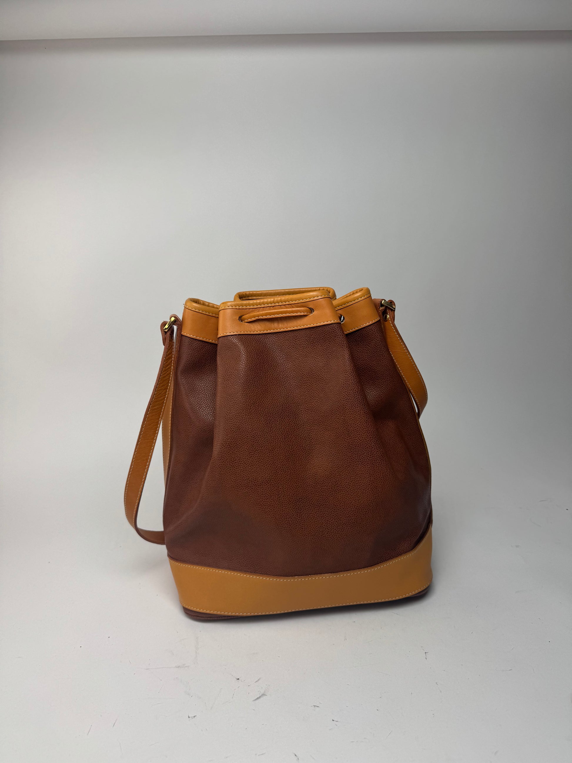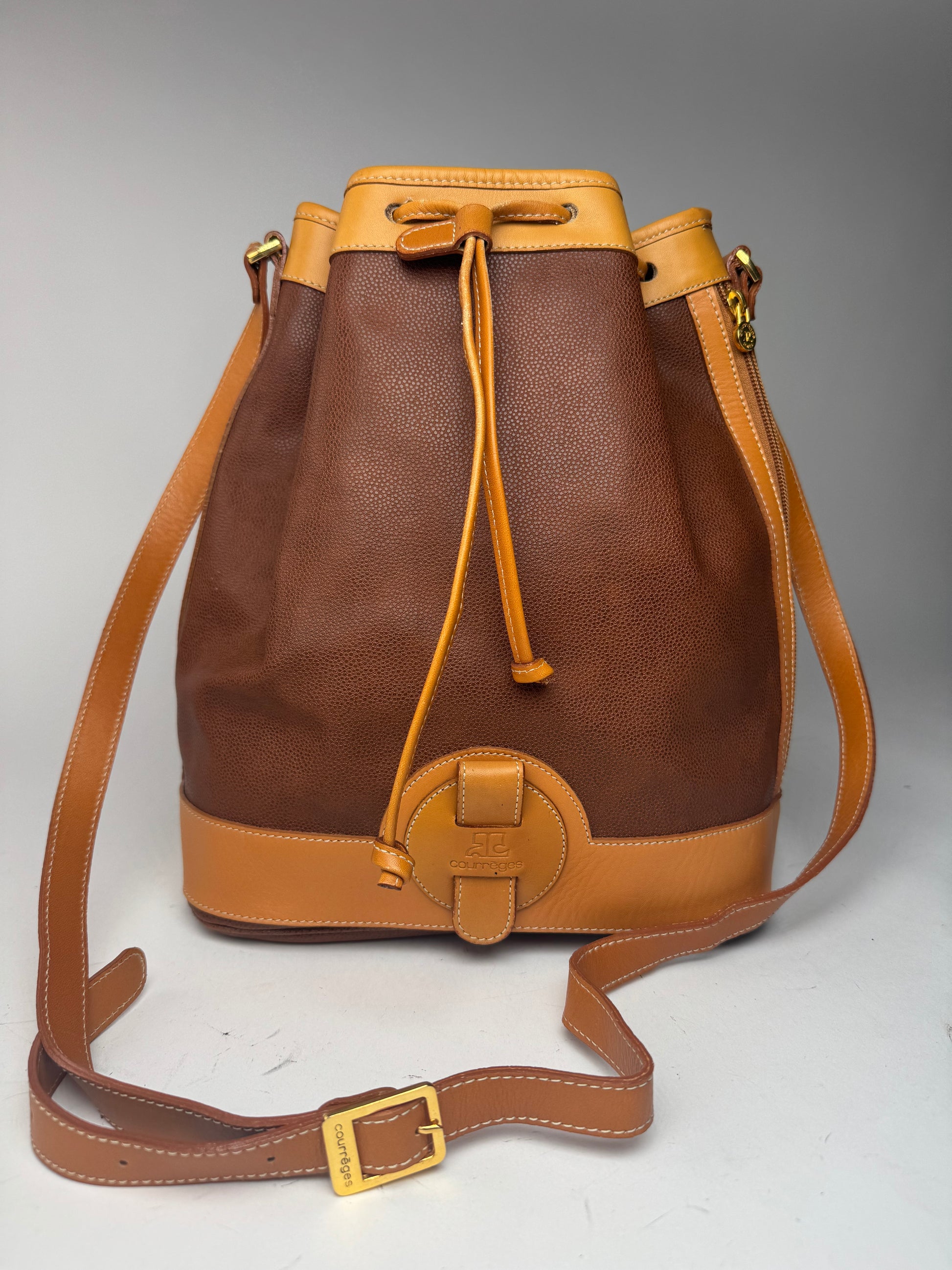 Sac seau en cuir vintage COURRÈGES PARIS. Ce sac seau élégant est finement confectionné en cuir marron orangé et marron. Il est doté d'un cordon de serrage, d'accessoires en acier doré et d'une bandoulière réglable.