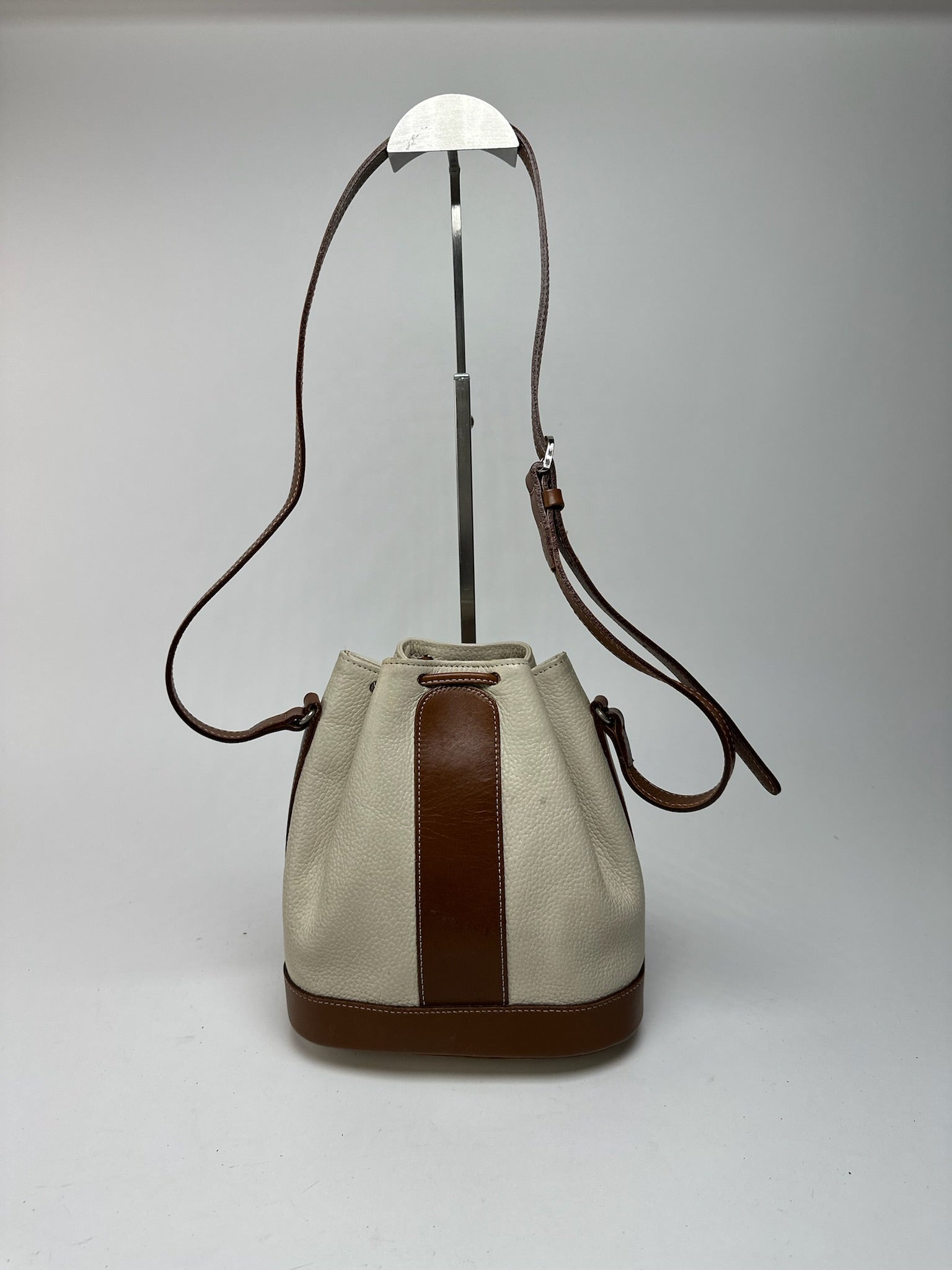 Ce sac seau chic est confectionné en cuir blanc et marron et doté d'une fermeture à cordon classique. Sa bandoulière réglable en cuir marron permet un porté confortable en bandoulière ou à l'épaule. L'intérieur est doublé de toile marron imprimée du logo Courrèges.