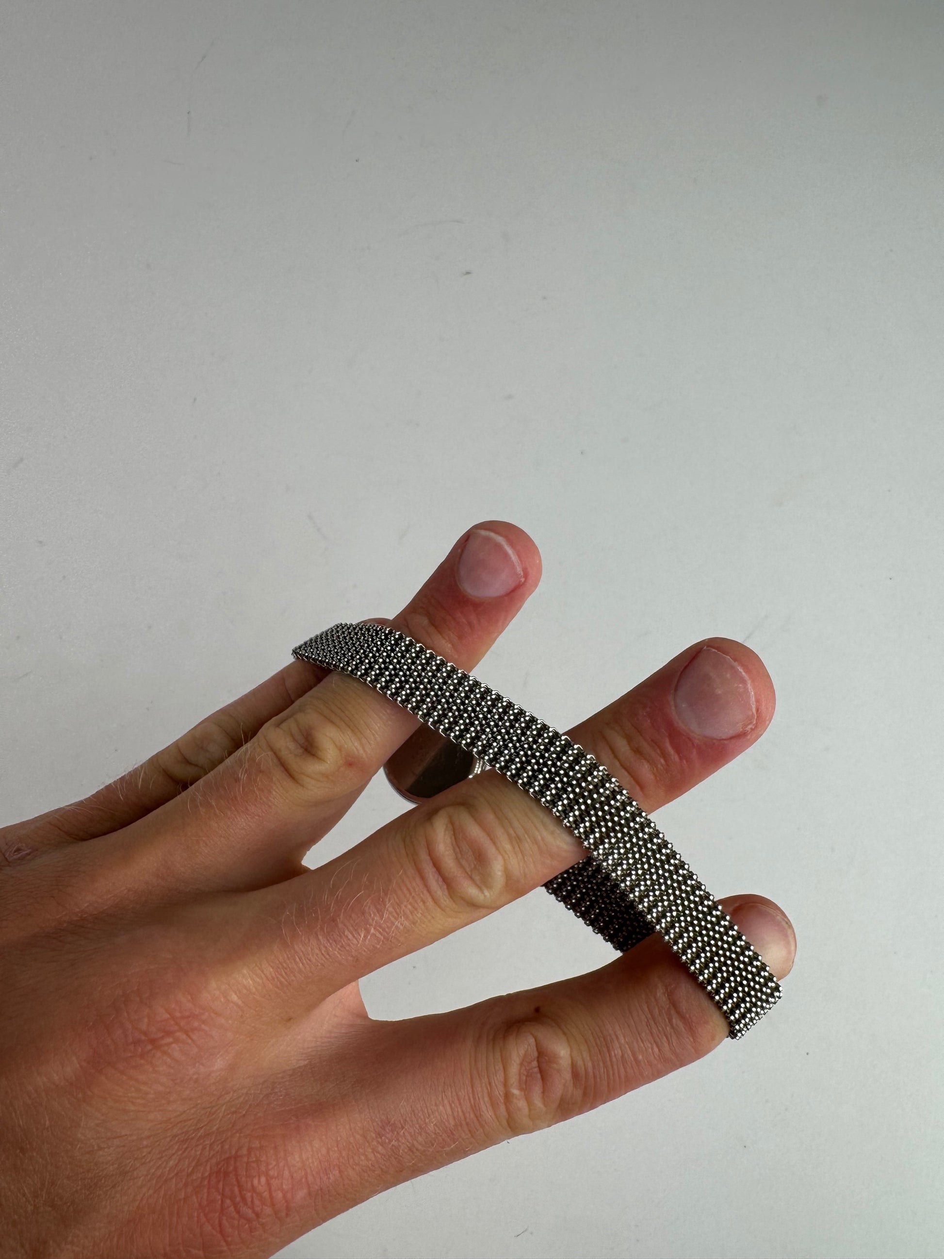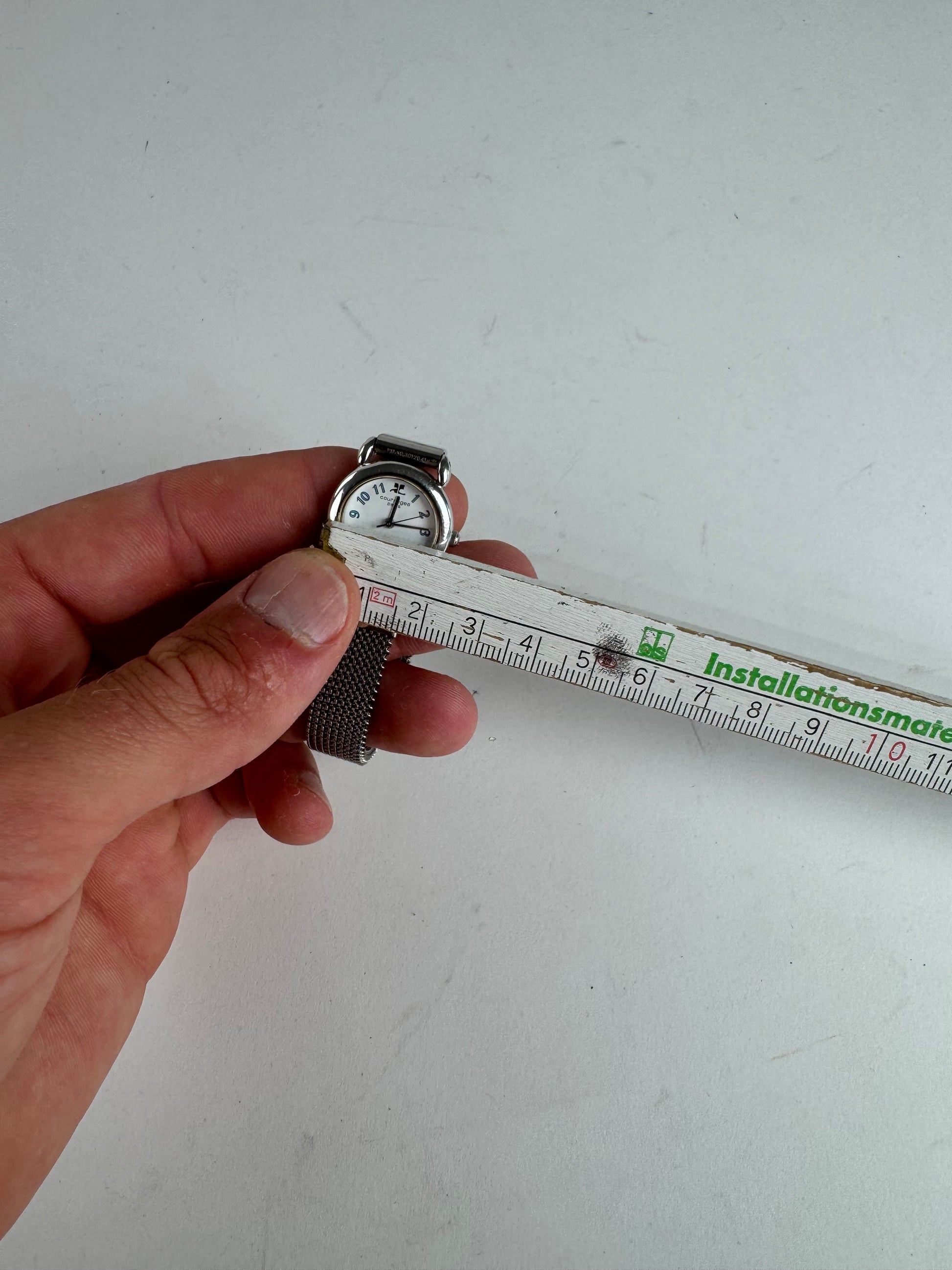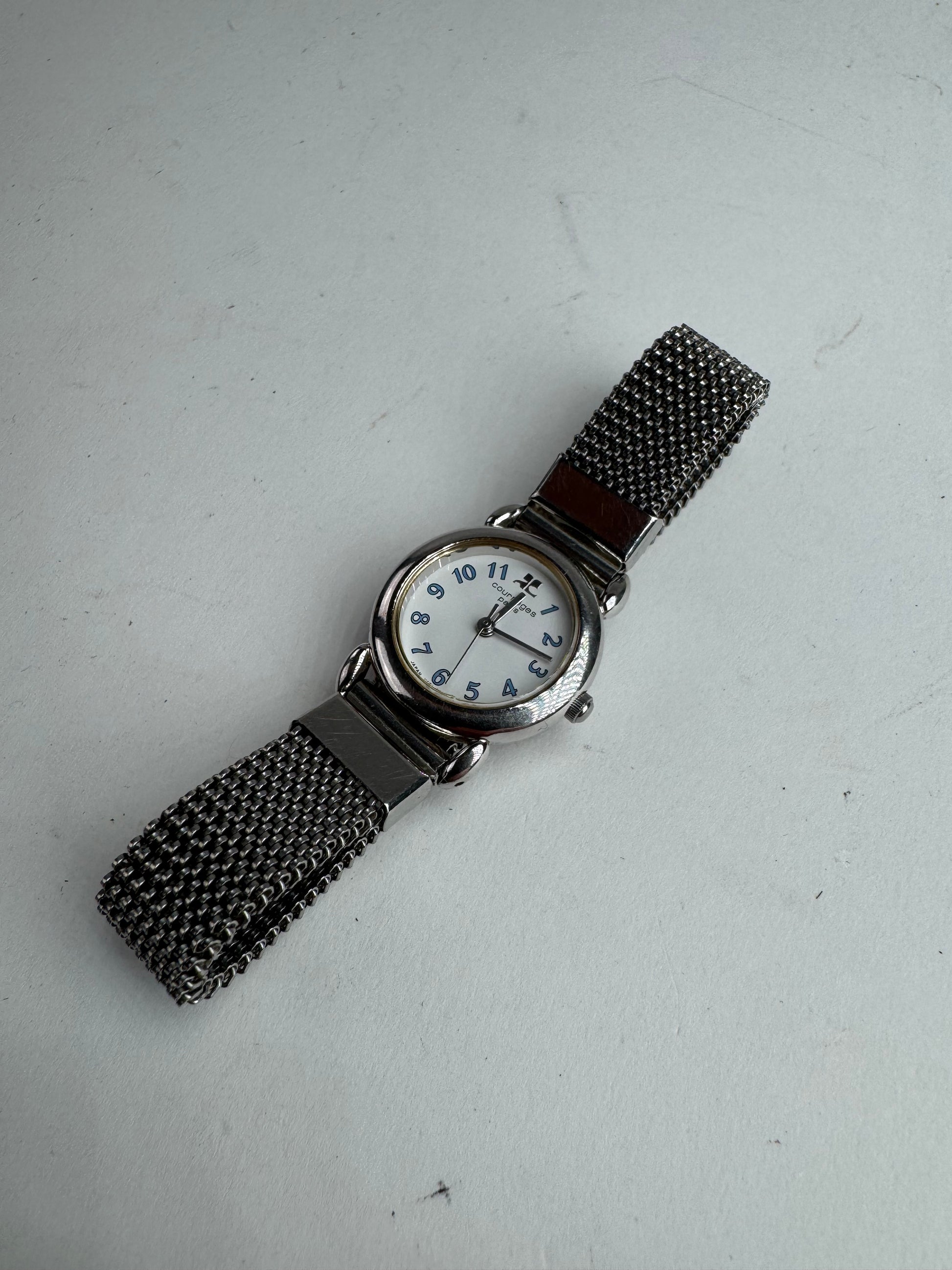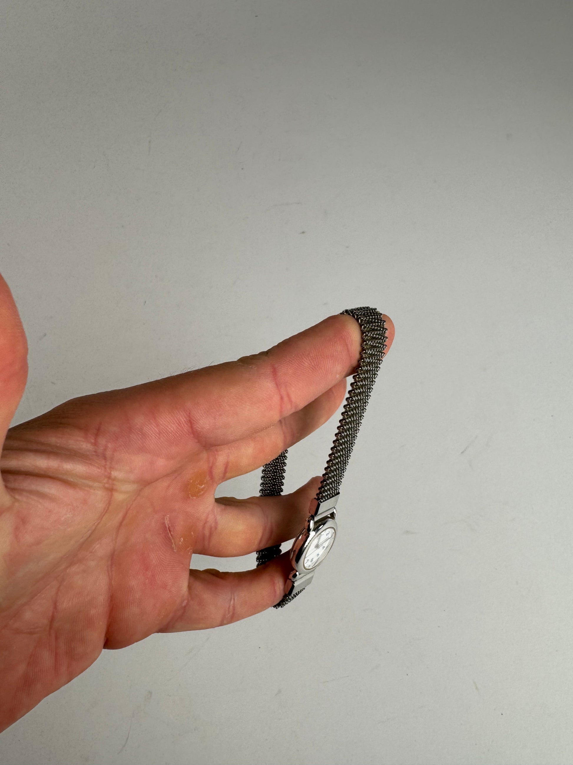 Montre à quartz vintage COURRÈGES PARIS. Cette élégante montre-bracelet en acier argenté est dotée d'un cadran blanc et d'un bracelet en acier unique, style chaîne, remarquablement élastique – un élément de design original et remarquable. Elle est animée par un mouvement à quartz avec une pile récemment remplacée. Fabriquée au Japon.