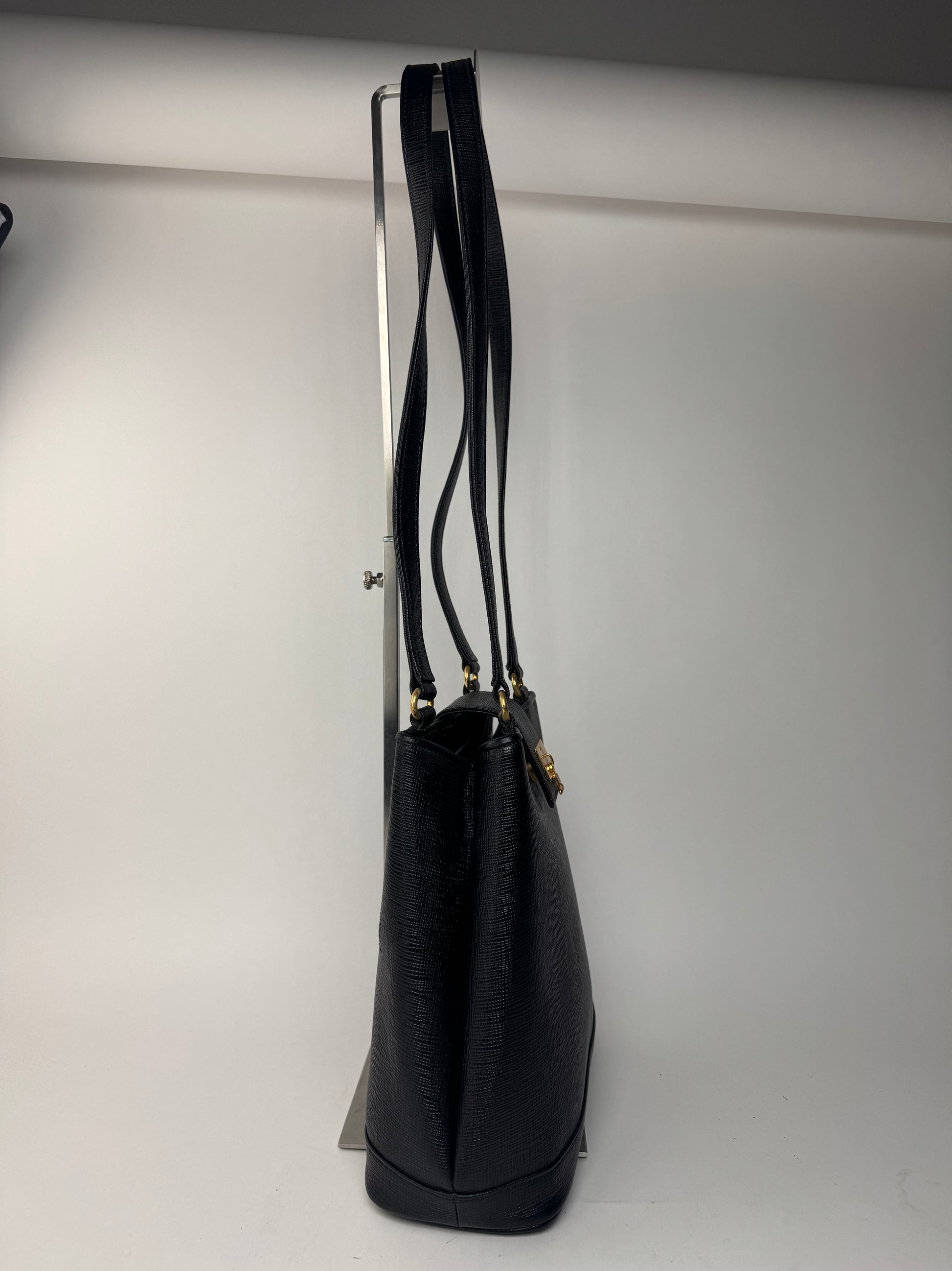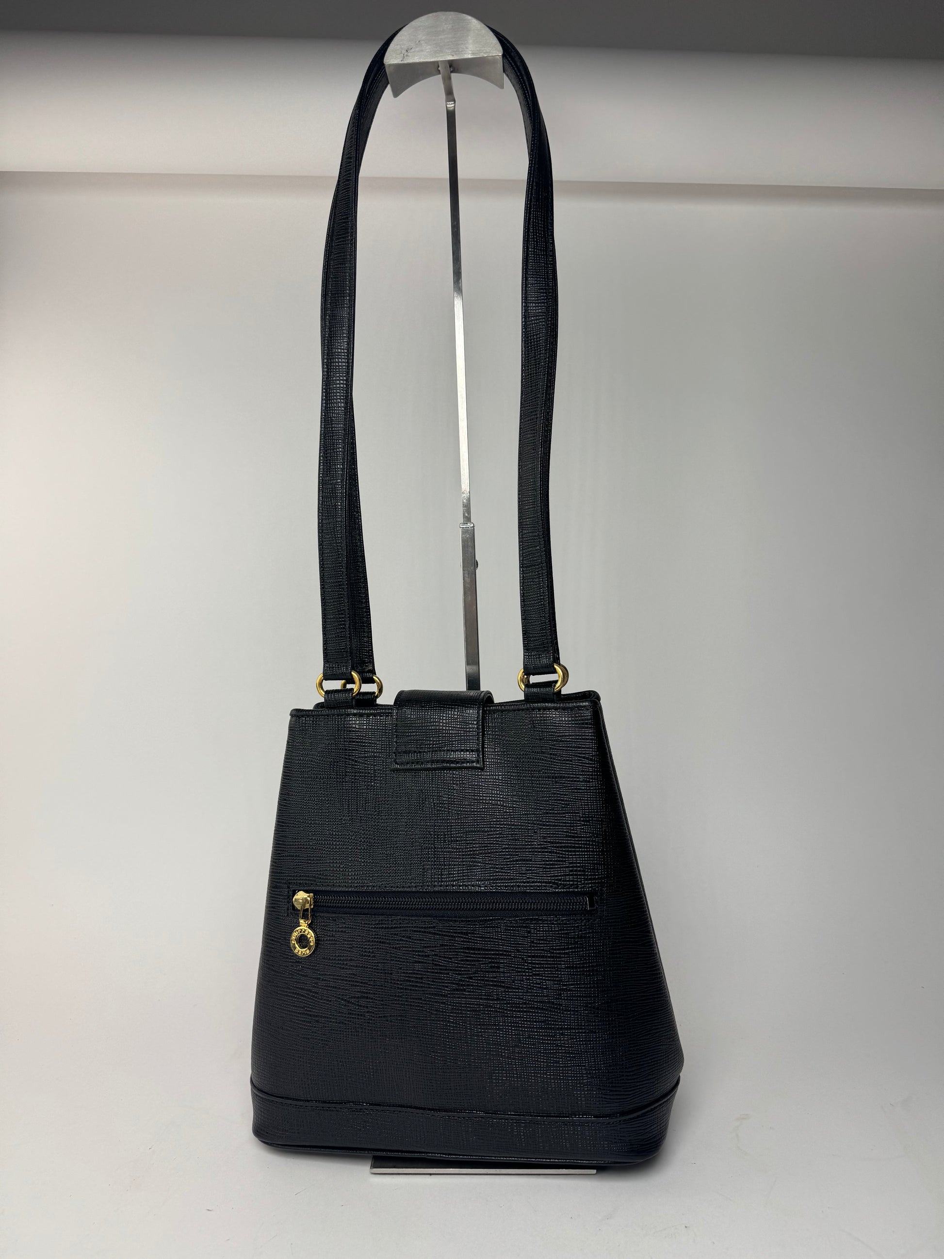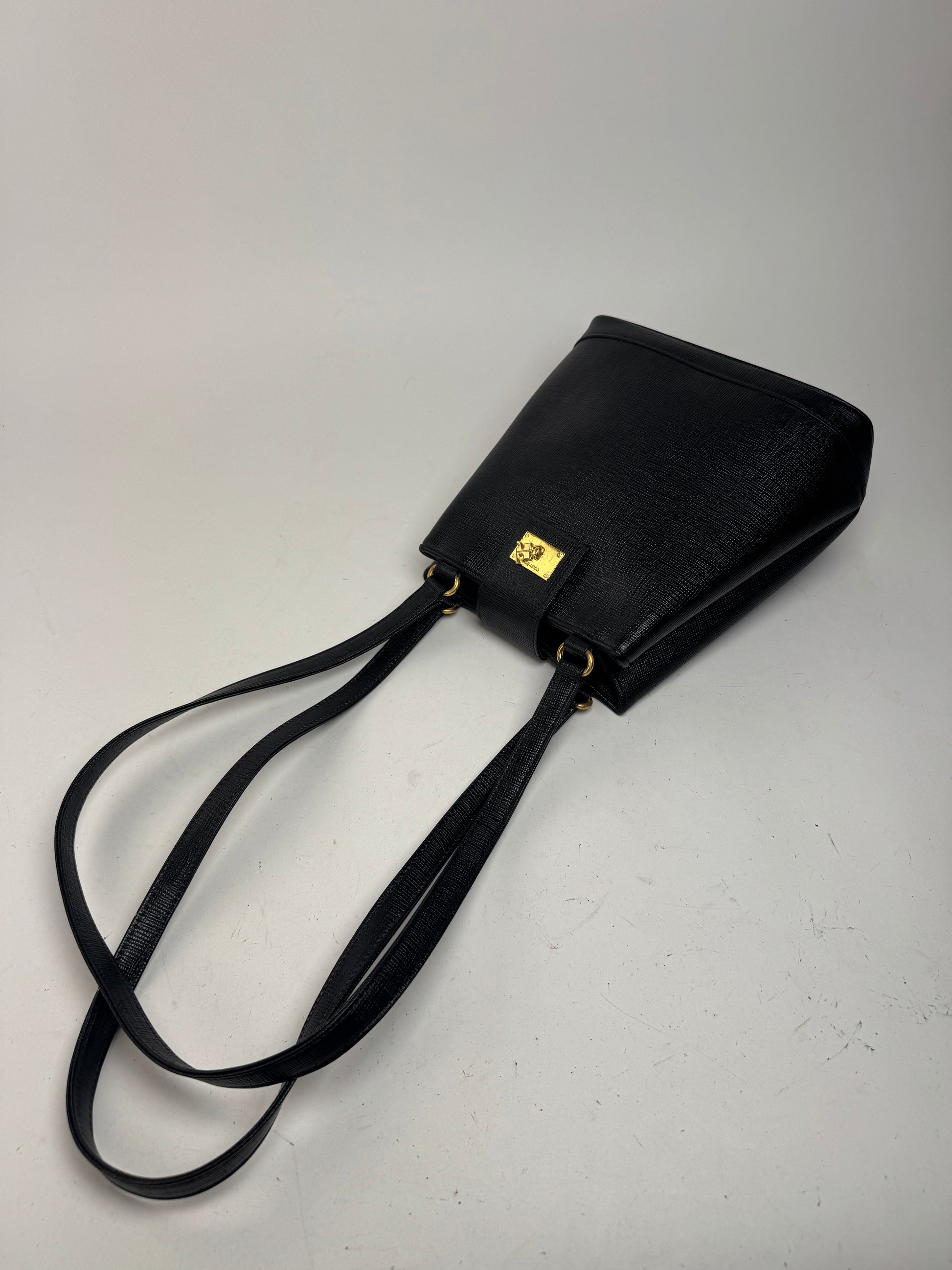 Sac à main vintage COURRÈGES Paris. Ce sac vintage est finement confectionné en cuir noir et arbore un charm logo Courrèges en acier doré sur le devant. Il est doté de deux anses extra-longues, d'une fermeture aimantée et d'une poche arrière zippée. Il s'ouvre sur un intérieur en tissu noir.