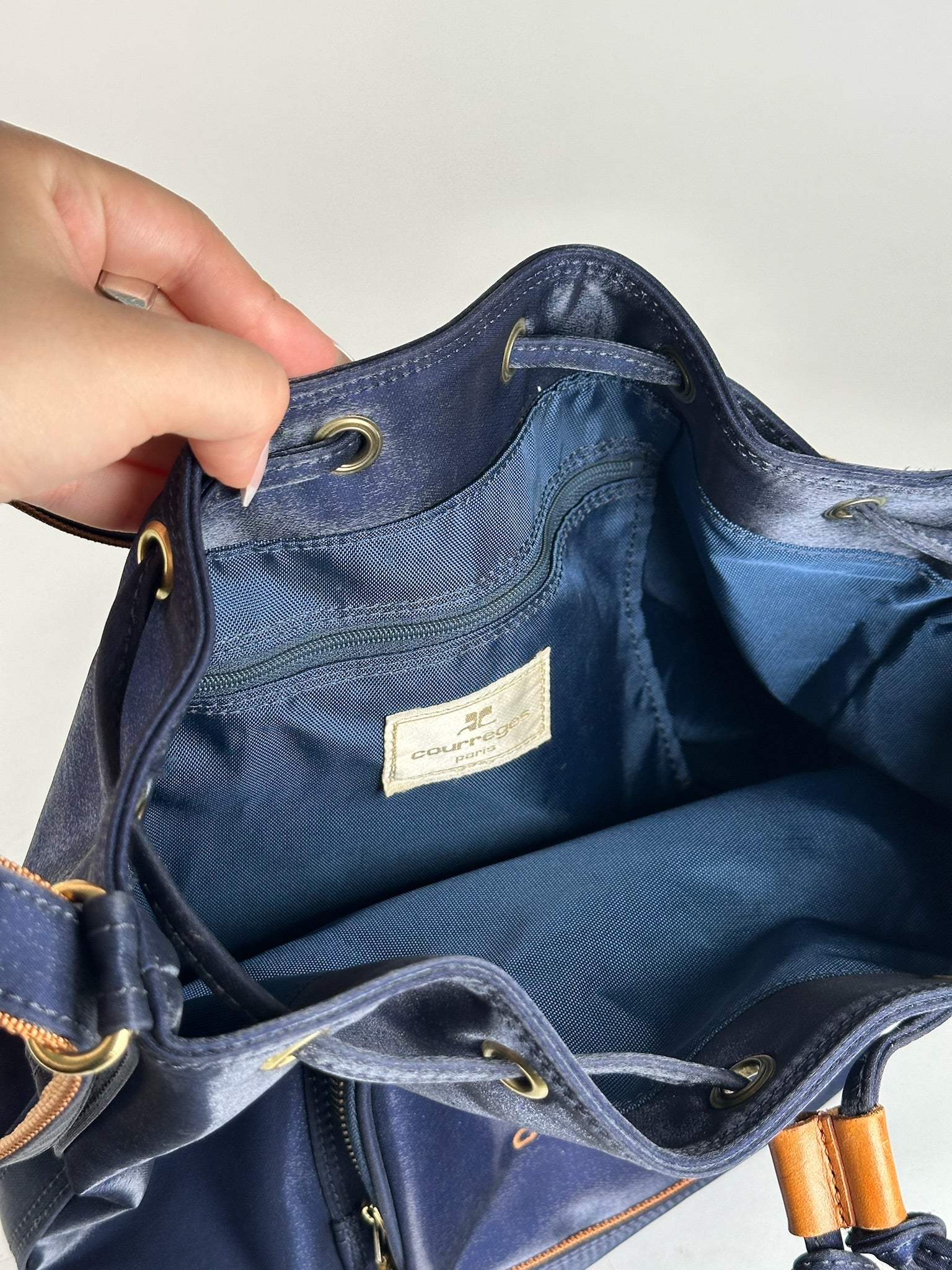 Sac seau vintage en cuir Courreges Paris bleu marine