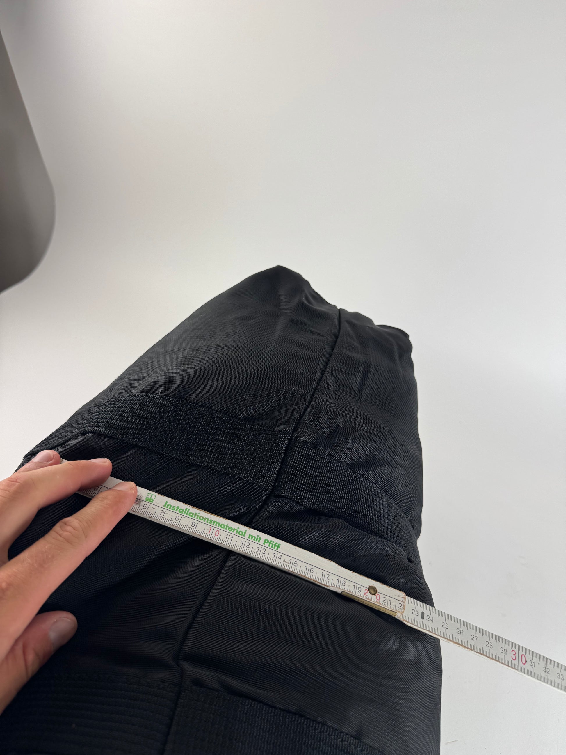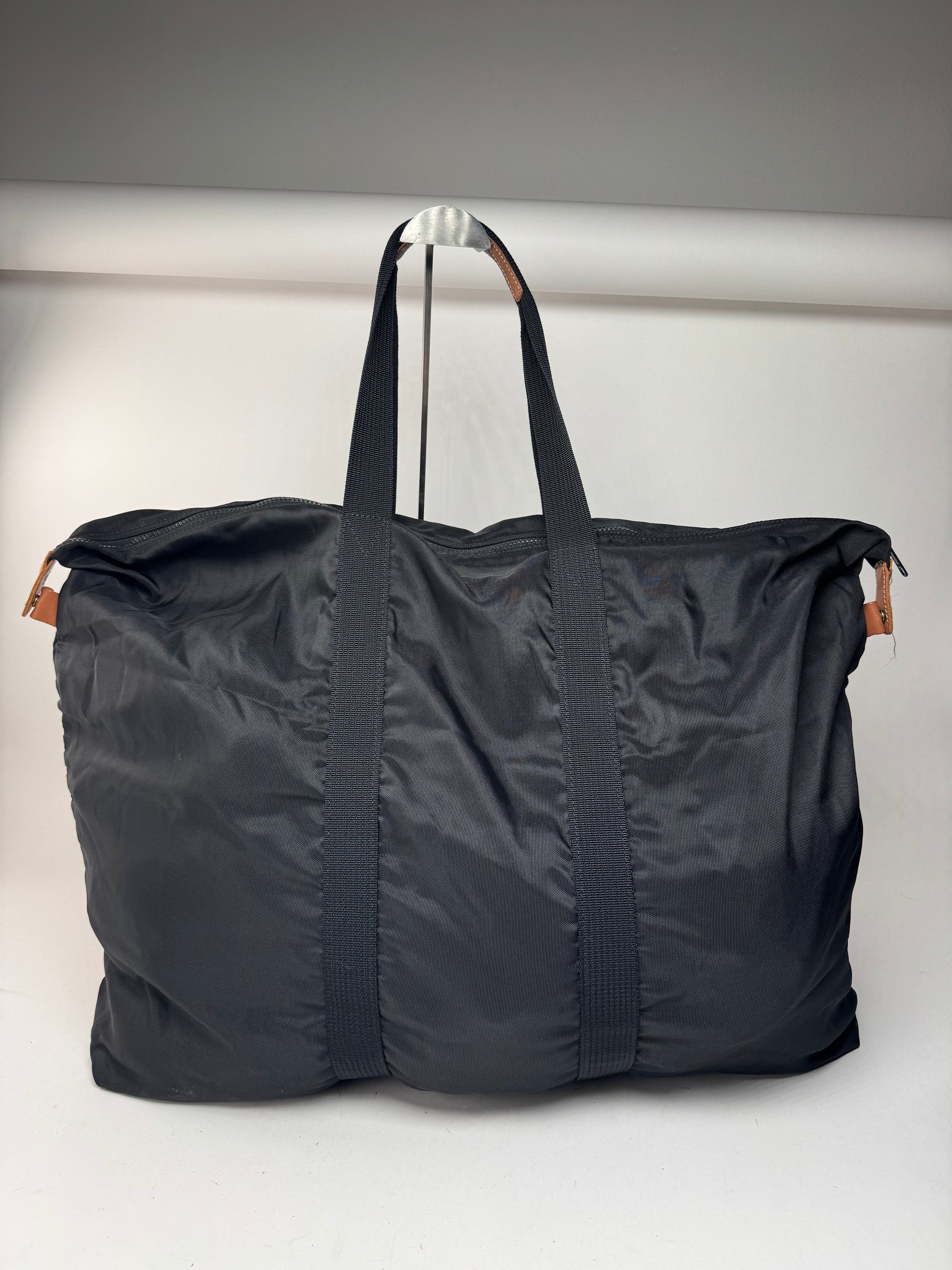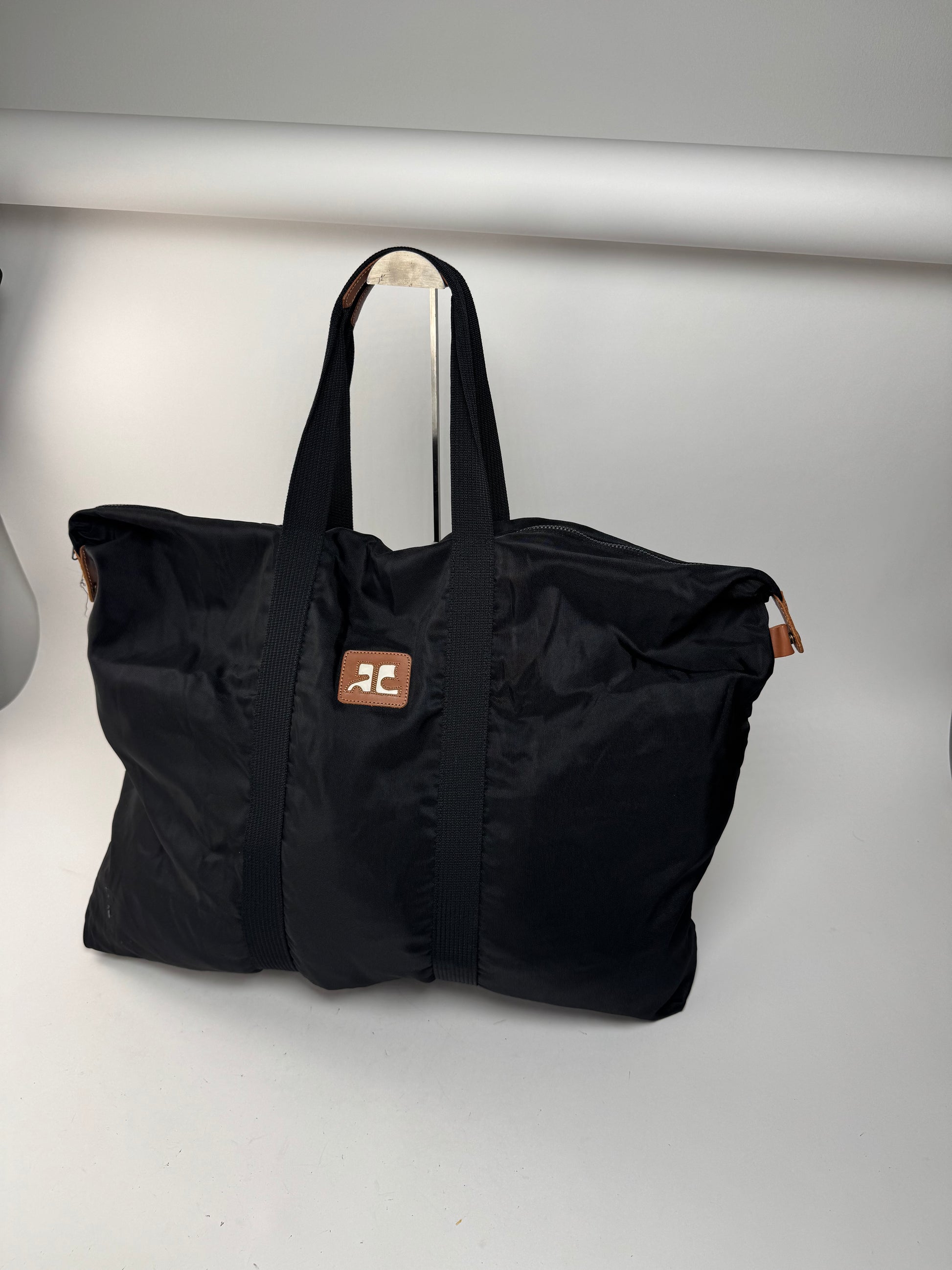 Sac de voyage vintage en polyester noir COURRÈGES PARIS. Ce sac de voyage élégant est confectionné en polyester noir avec des finitions en cuir marron, dont le logo Courrèges sur le devant. Il est doté d'une fermeture zippée sur le dessus et d'accessoires en acier argenté.