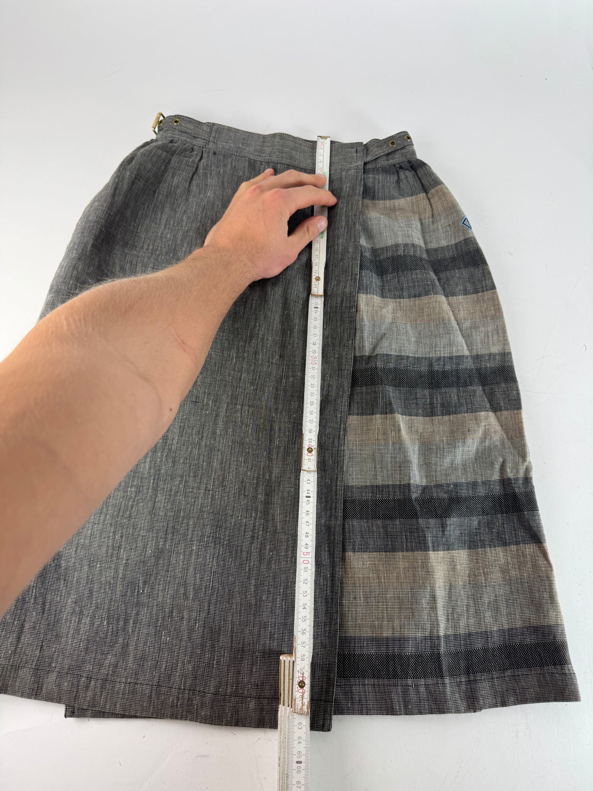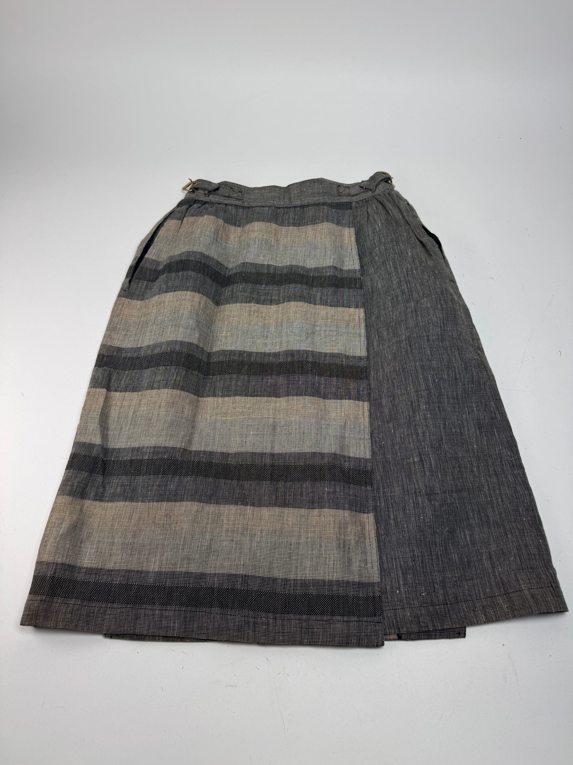 This unique vintage skirt is finely crafted in an asymmetric design combining two contrasting panels — one in solid grey wool and the other in anthracite with grey-black striped patterning. A light and dark blue “CD” logo patch is embedded on the left front side, adding a subtle signature detail. The skirt also features side belt closures for an adjustable fit. The interior is lined with black viscose for comfort and structure. The mannequin on the photo wears size 38/M.