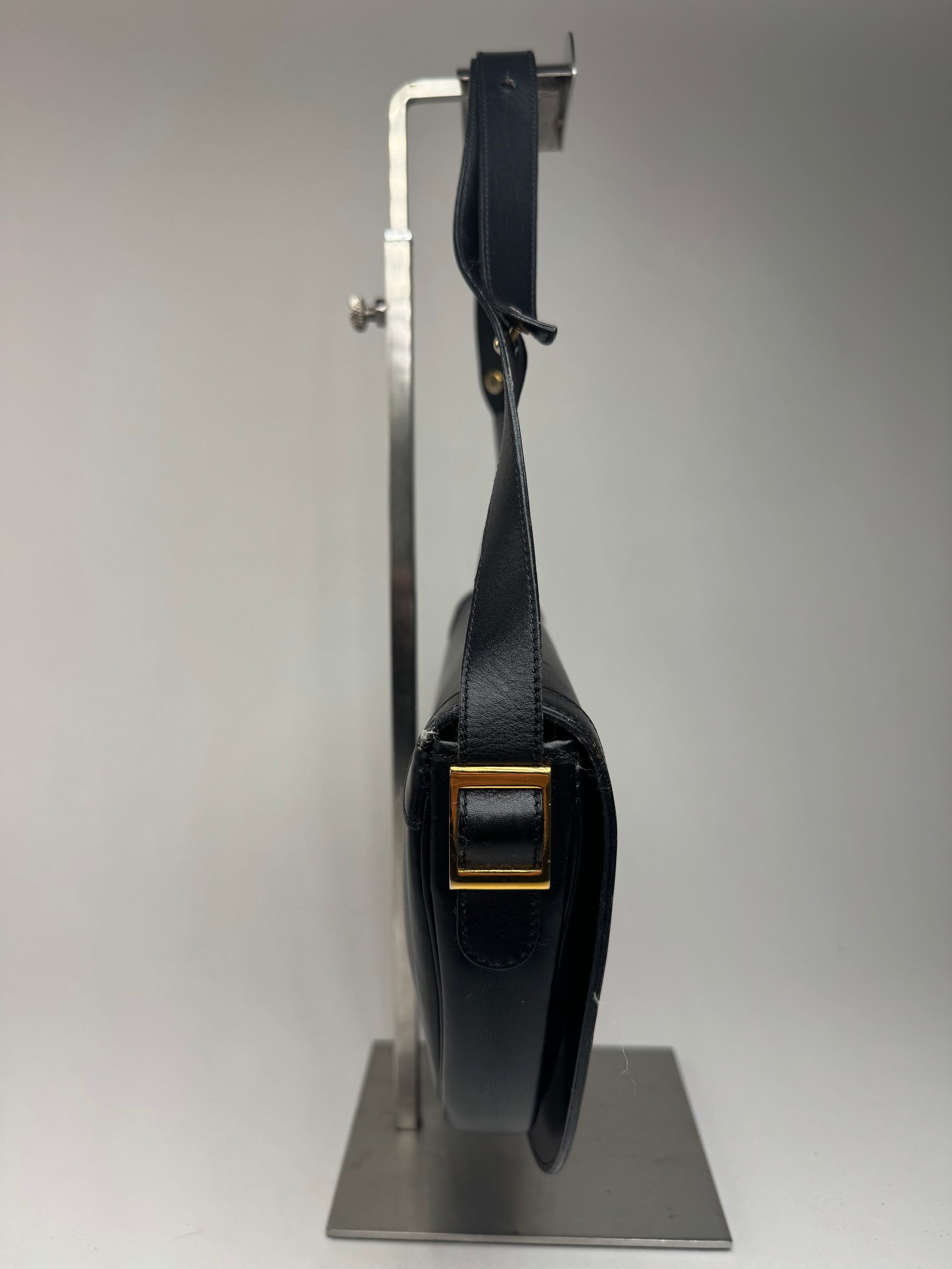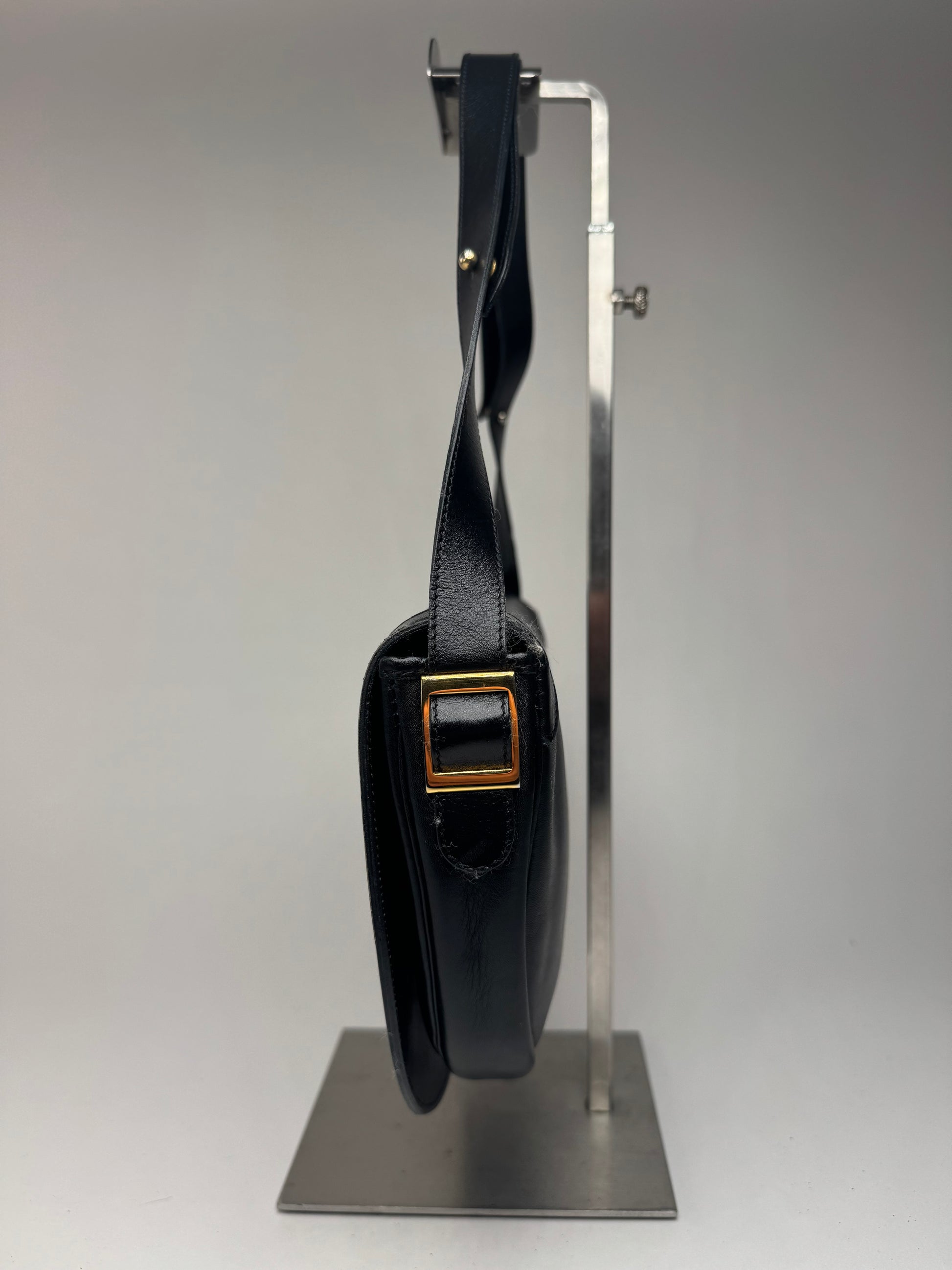 Détails de l'état : La fermeture à bouton-pression est défectueuse et peut nécessiter un remplacement. Le sac est en très bon état, avec de légères rayures superficielles. L'intérieur en cuir noir est propre et bien conservé.