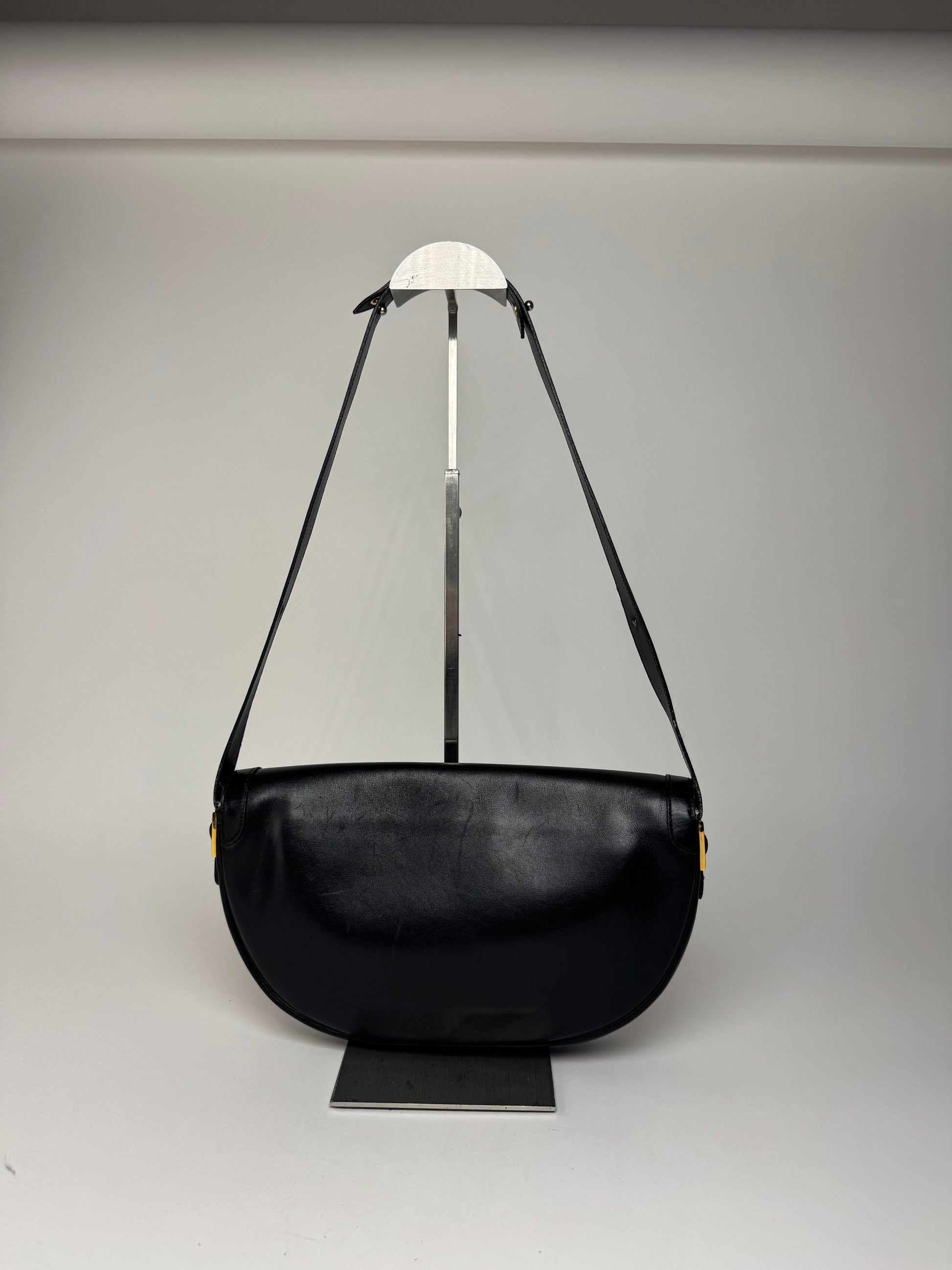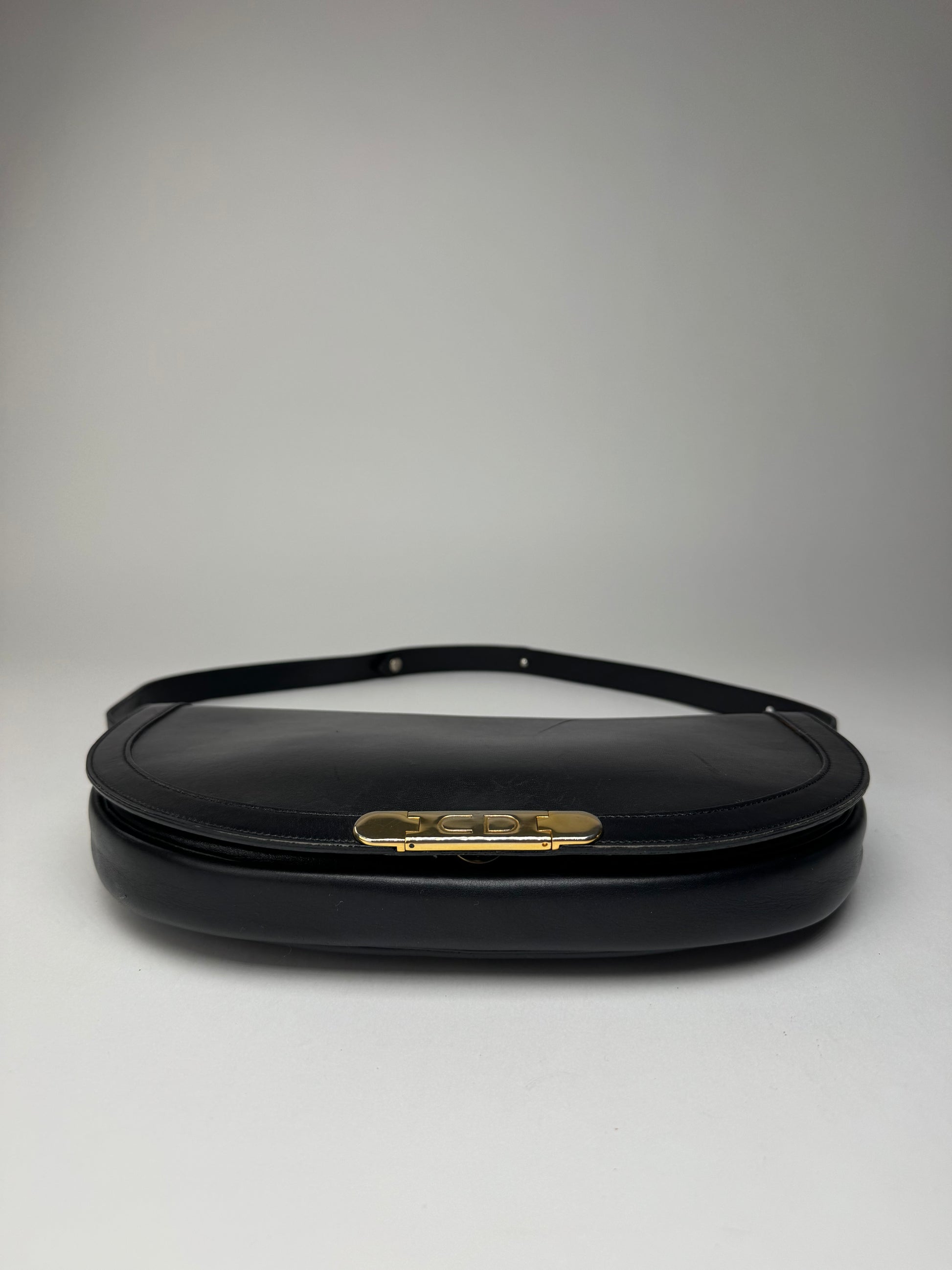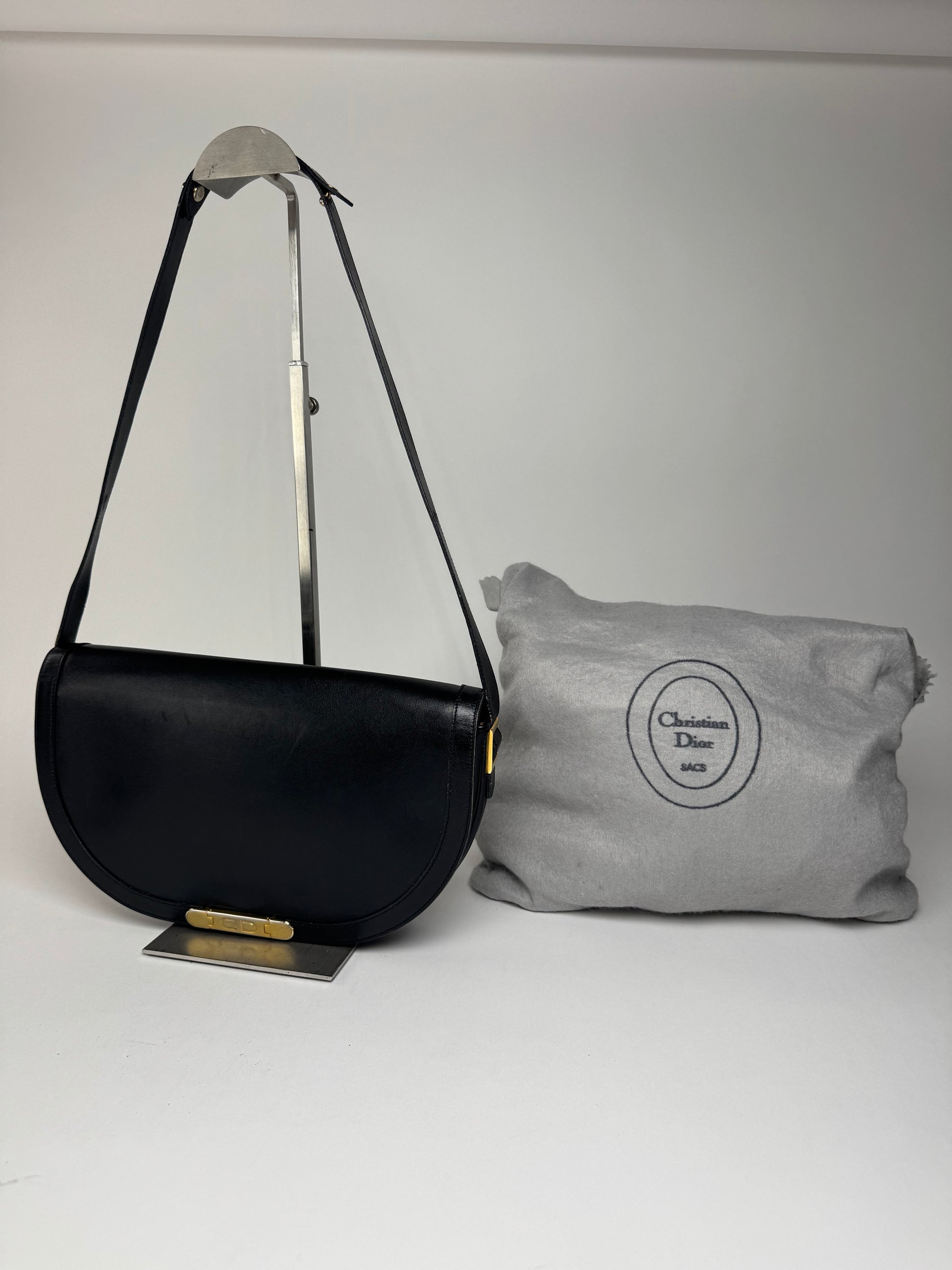 Sac bandoulière vintage DIOR. Cet élégant sac à main est finement confectionné en cuir noir avec des finitions en acier doré. Il est orné d'une application CD en acier doré sur le devant et d'une bandoulière réglable pour un porté épaule. Livré avec une housse de protection Dior.