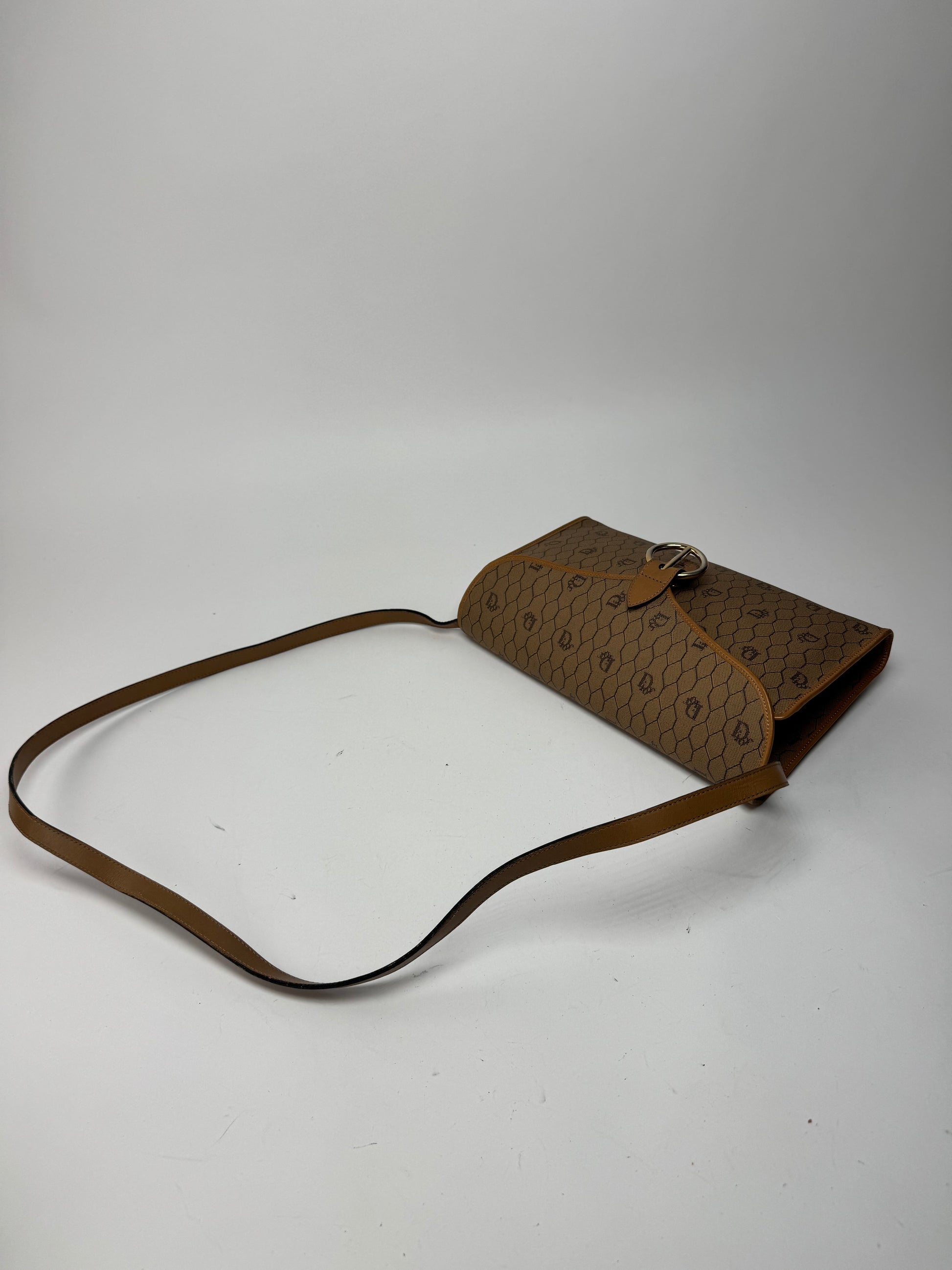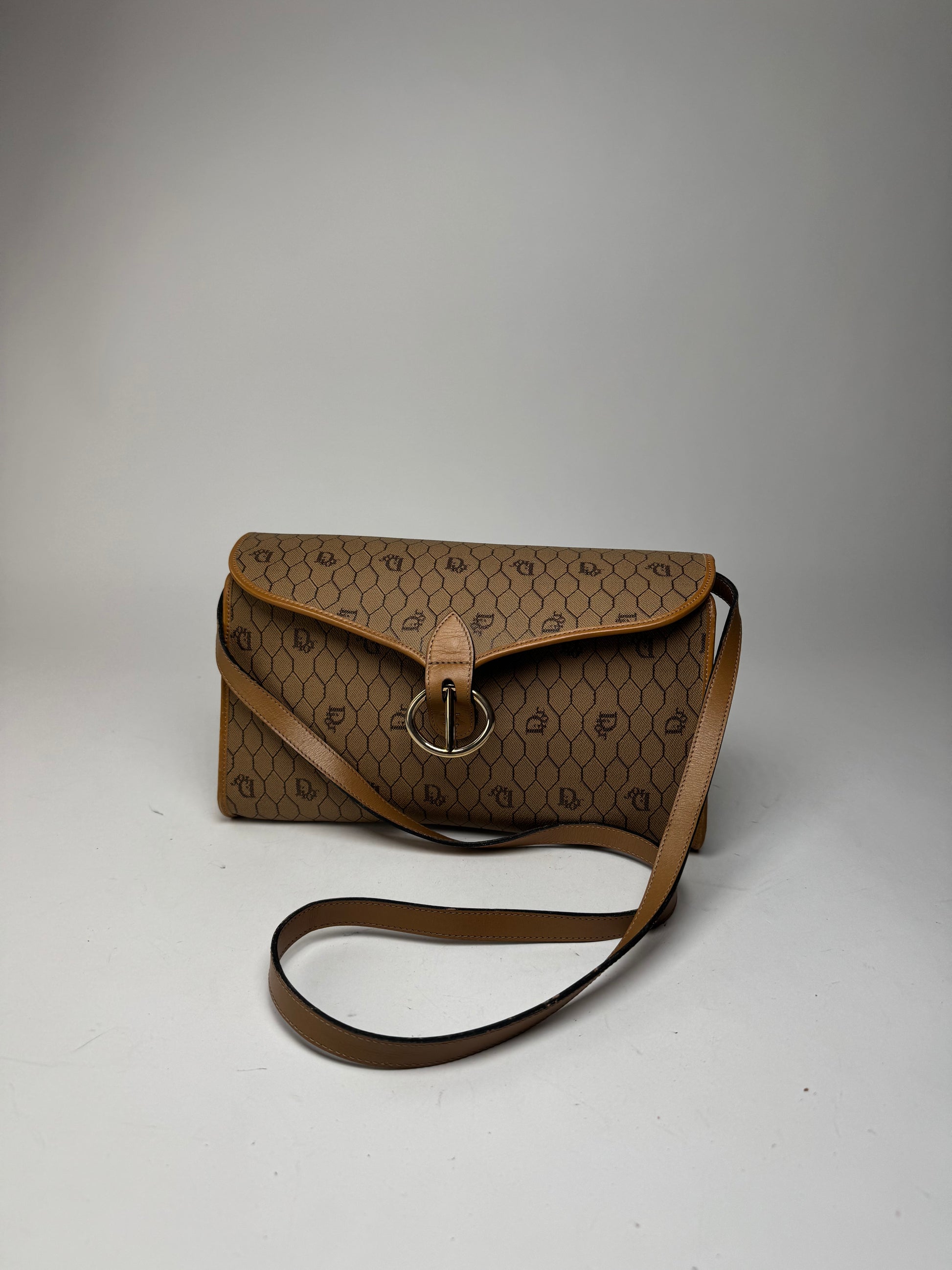 Cet élégant sac vintage est finement confectionné en cuir monogrammé Dior beige et marron. L'intérieur est doublé et comprend deux compartiments, l'un zippé et l'autre ouvert. Le sac se ferme par un bouton-pression.