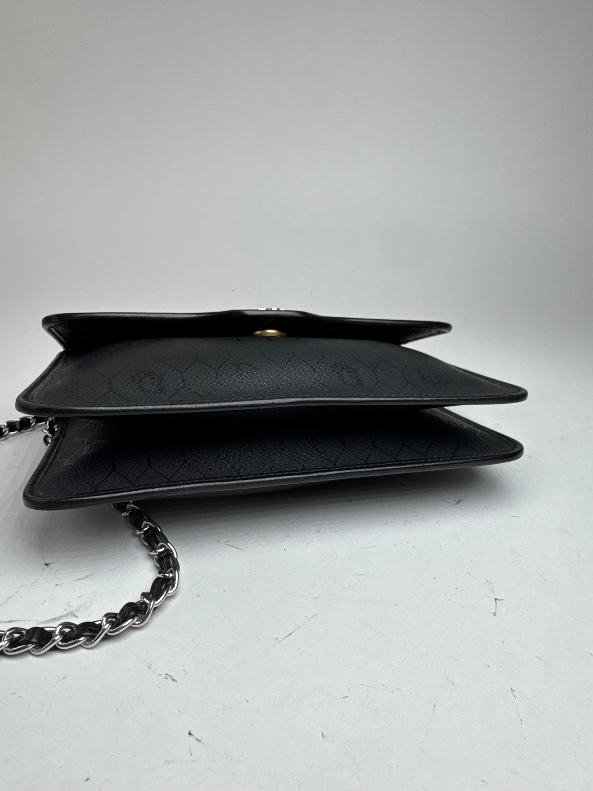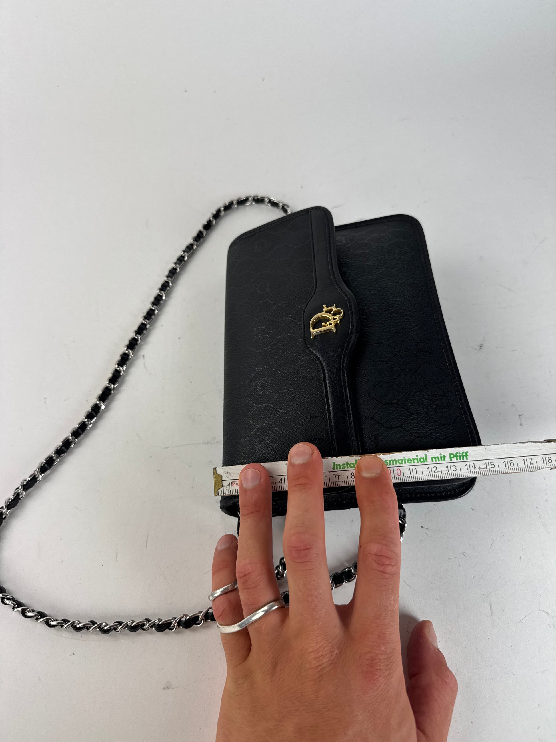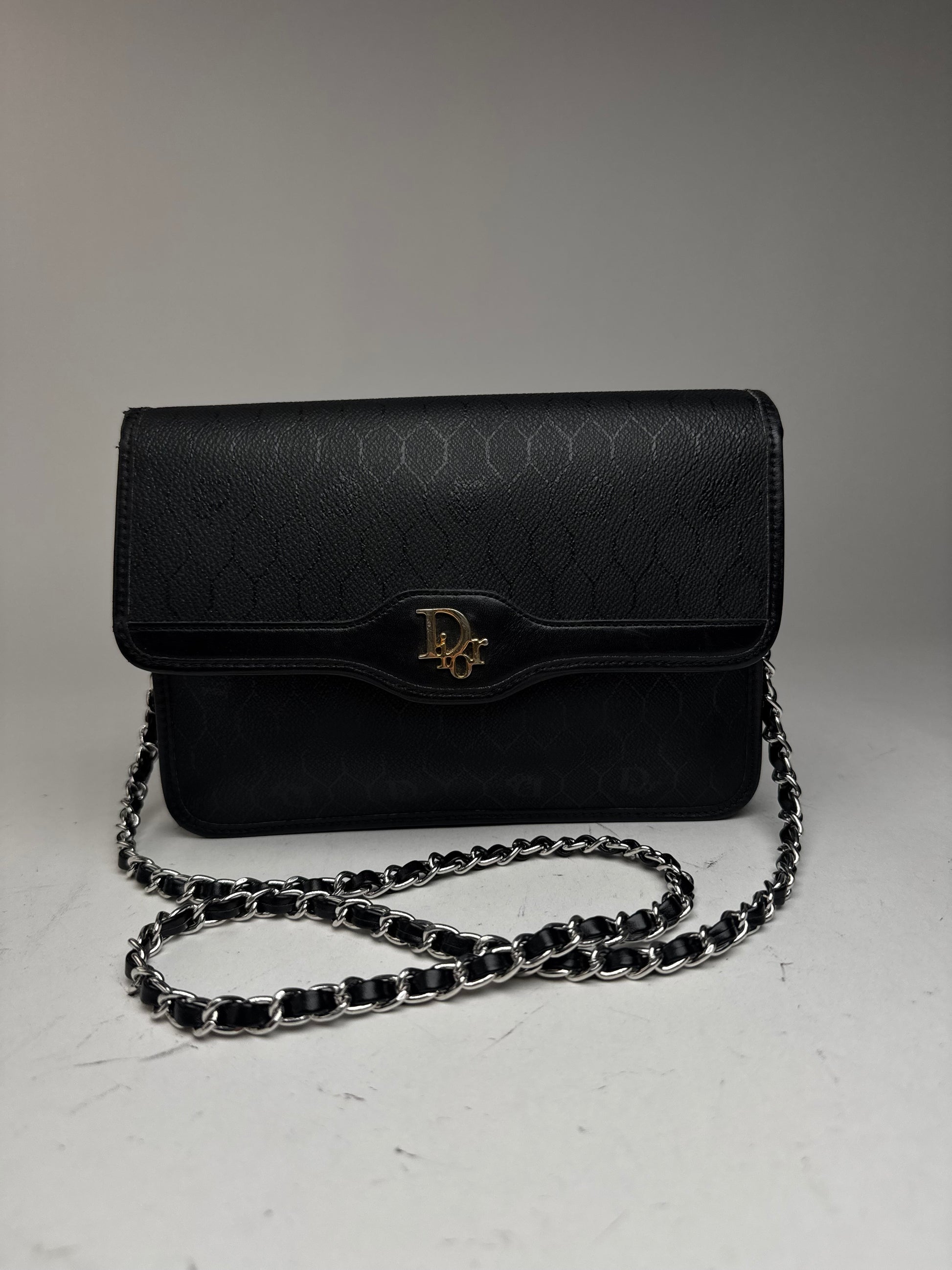 Sac DIOR Vintage en cuir Monogram. Ce sac chic est finement confectionné en cuir noir embossé du monogramme Dior. Il est doté d'accessoires en acier doré et d'une fermeture à bouton-pression. L'intérieur s'ouvre sur deux compartiments.