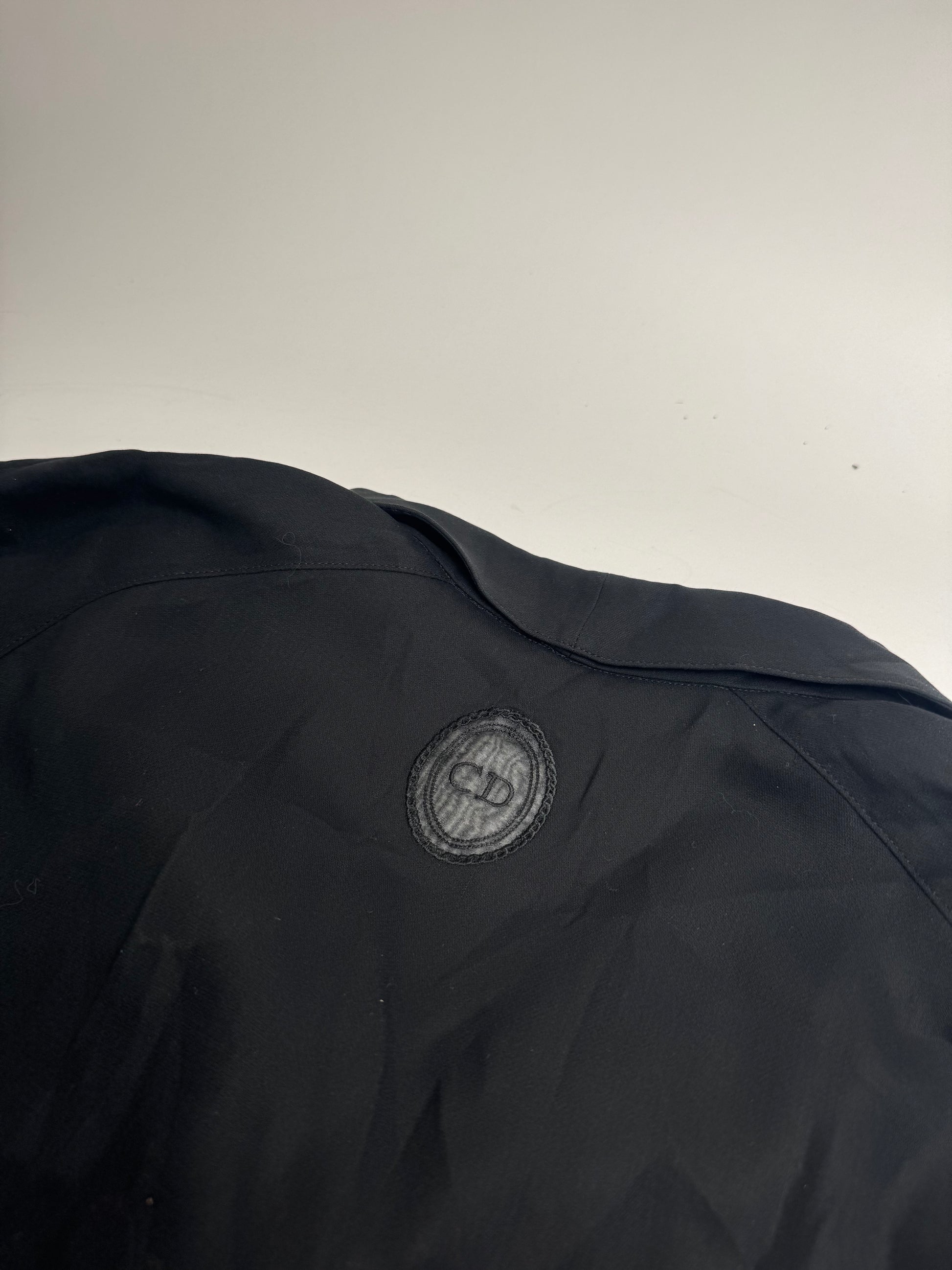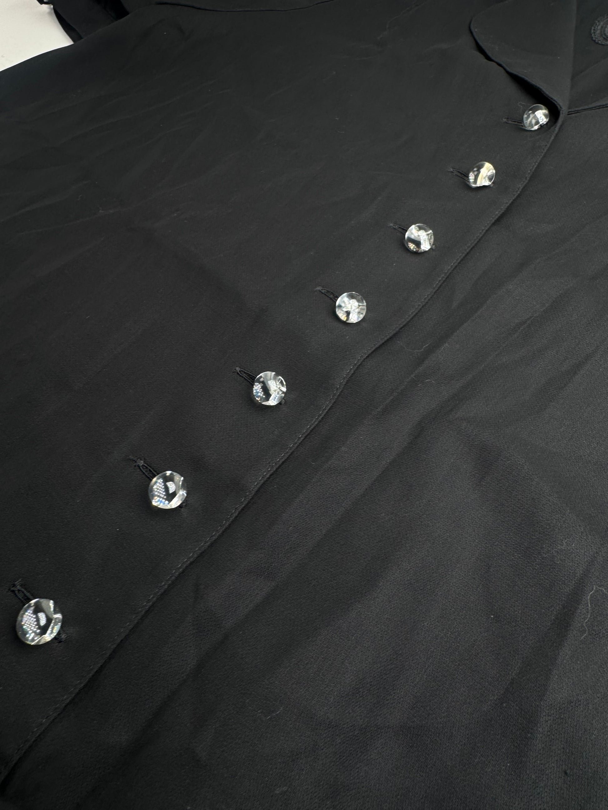 This unique vintage top is finely crafted from lightweight black cotton and features an eye-catching neckline design. The buttons are shaped like crystal-style pearls, adding a delicate and refined touch. The silhouette is oversized, offering a relaxed yet sophisticated look. A subtle “CD” logo detail is placed on the back at collar height. The mannequin on the photo wears size M.