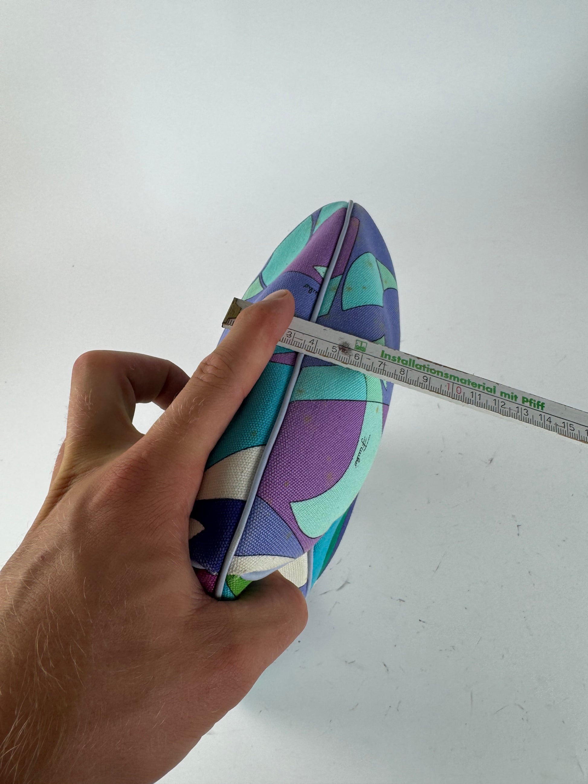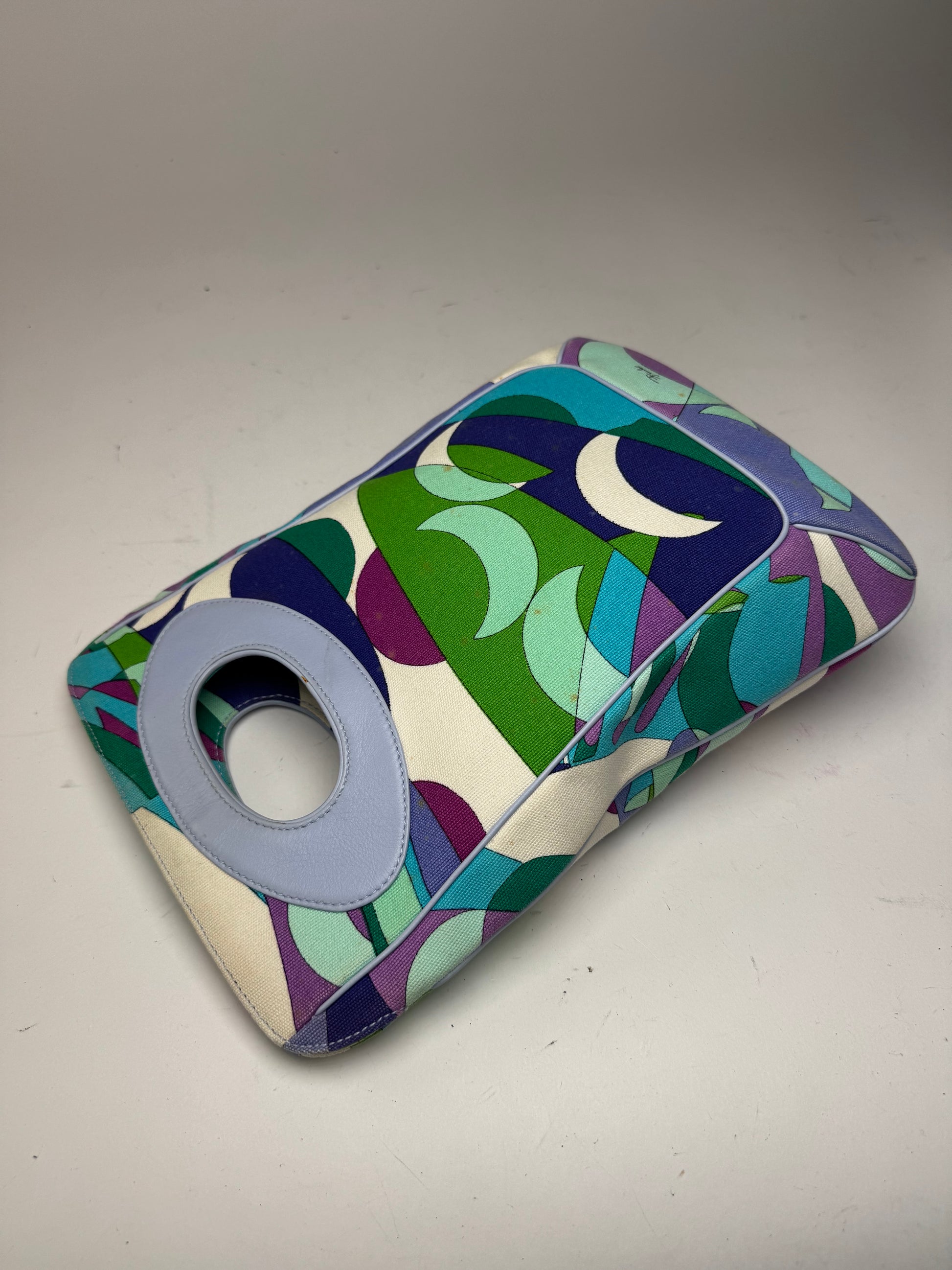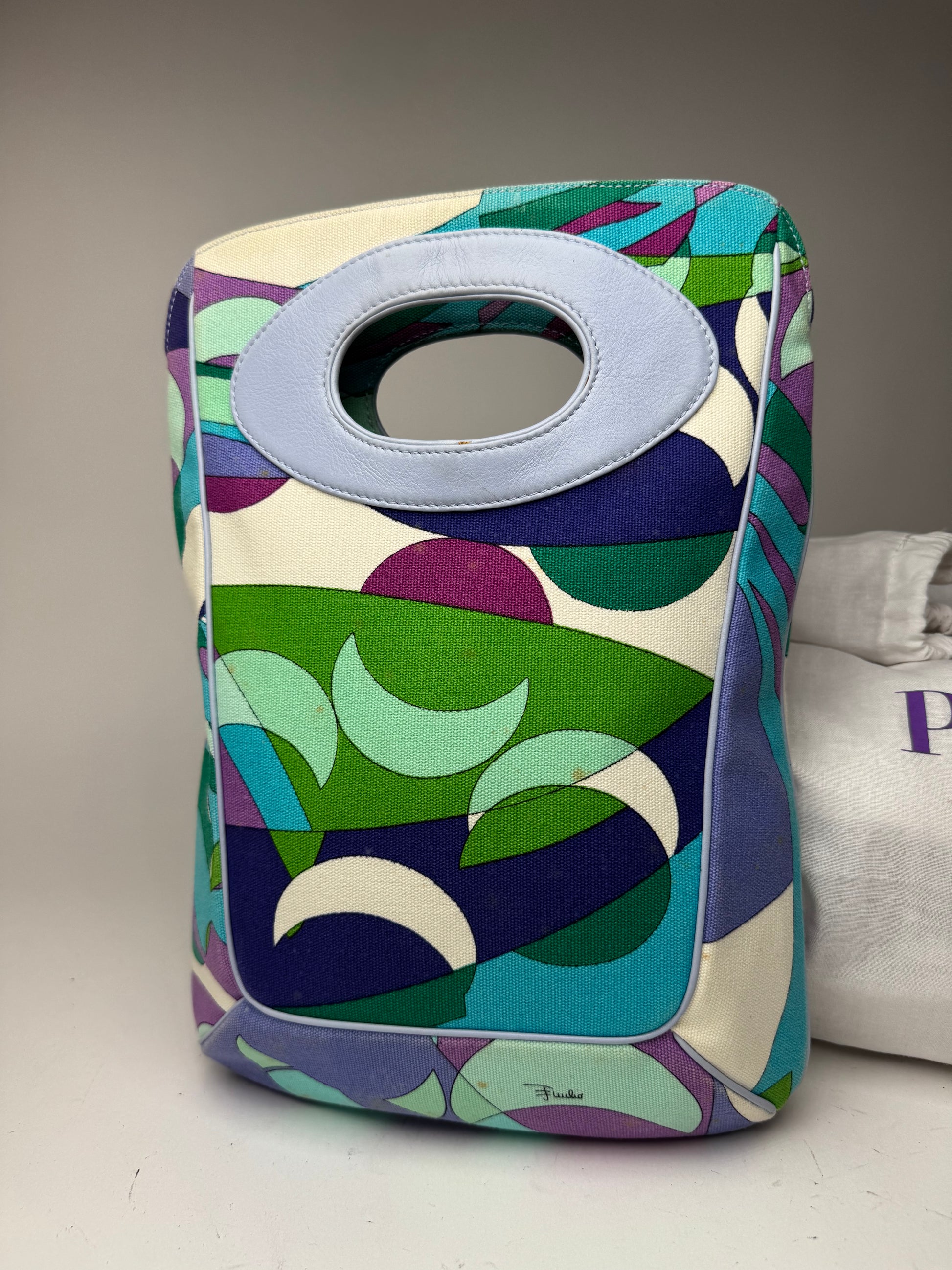Sac à main EMILIO PUCCI imprimé vintage. Ce sac vibrant est finement confectionné dans un imprimé signature Emilio Pucci aux nuances de blanc, lilas, vert, bleu et turquoise. Les poignées creuses sont encadrées de cuir lilas, ajoutant une touche sculpturale à son design audacieux.