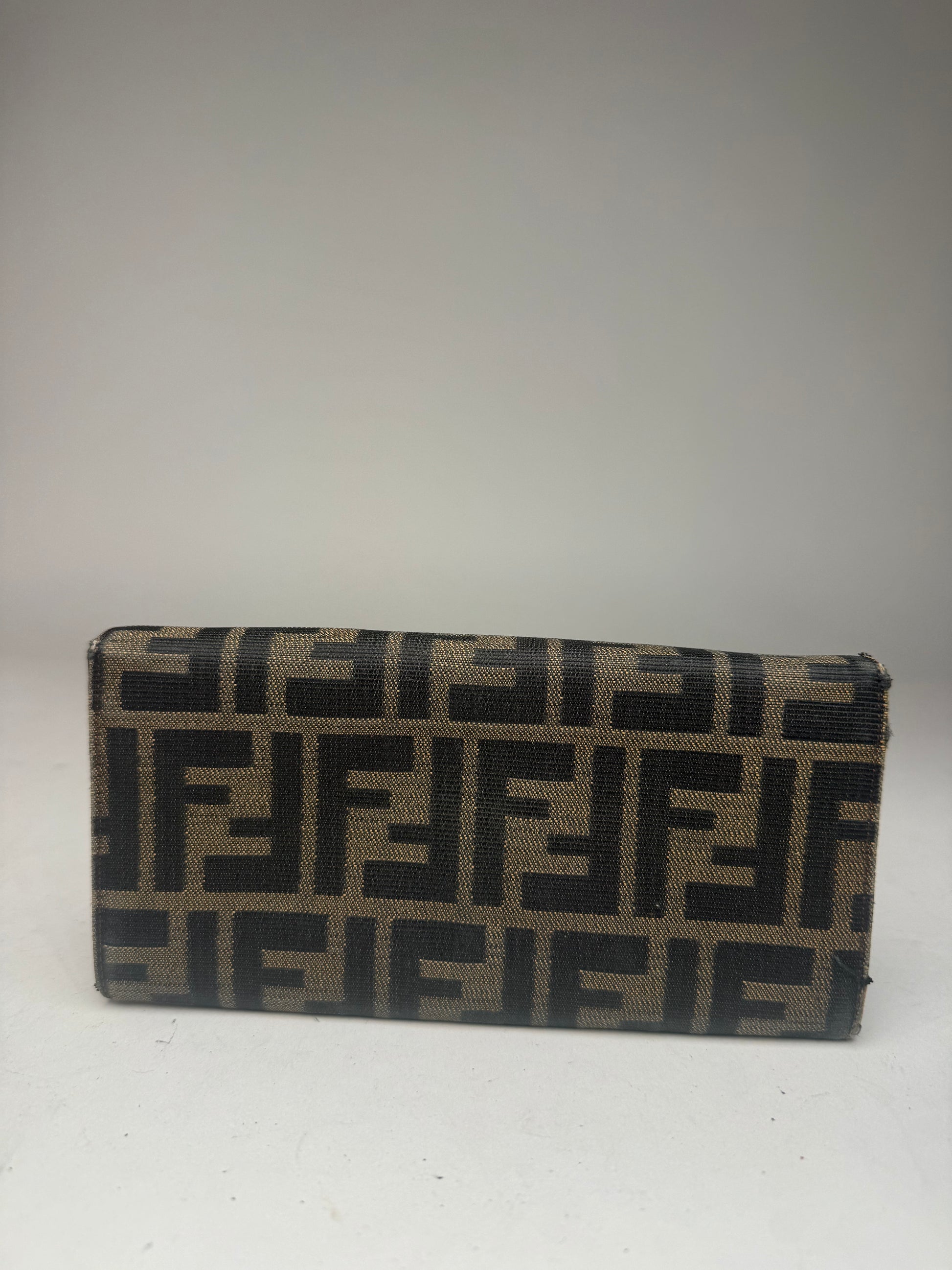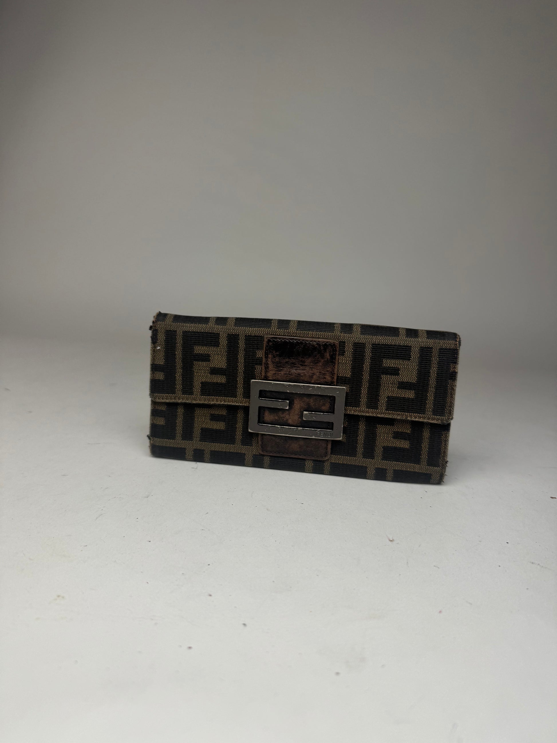 Portefeuille vintage FENDI. Ce portefeuille classique est finement confectionné en toile monogrammée Fendi FF marron avec des finitions en cuir marron. Le devant est orné du logo FF en acier argenté. Il se ferme par un bouton-pression et s'ouvre sur un intérieur en cuir marron.
