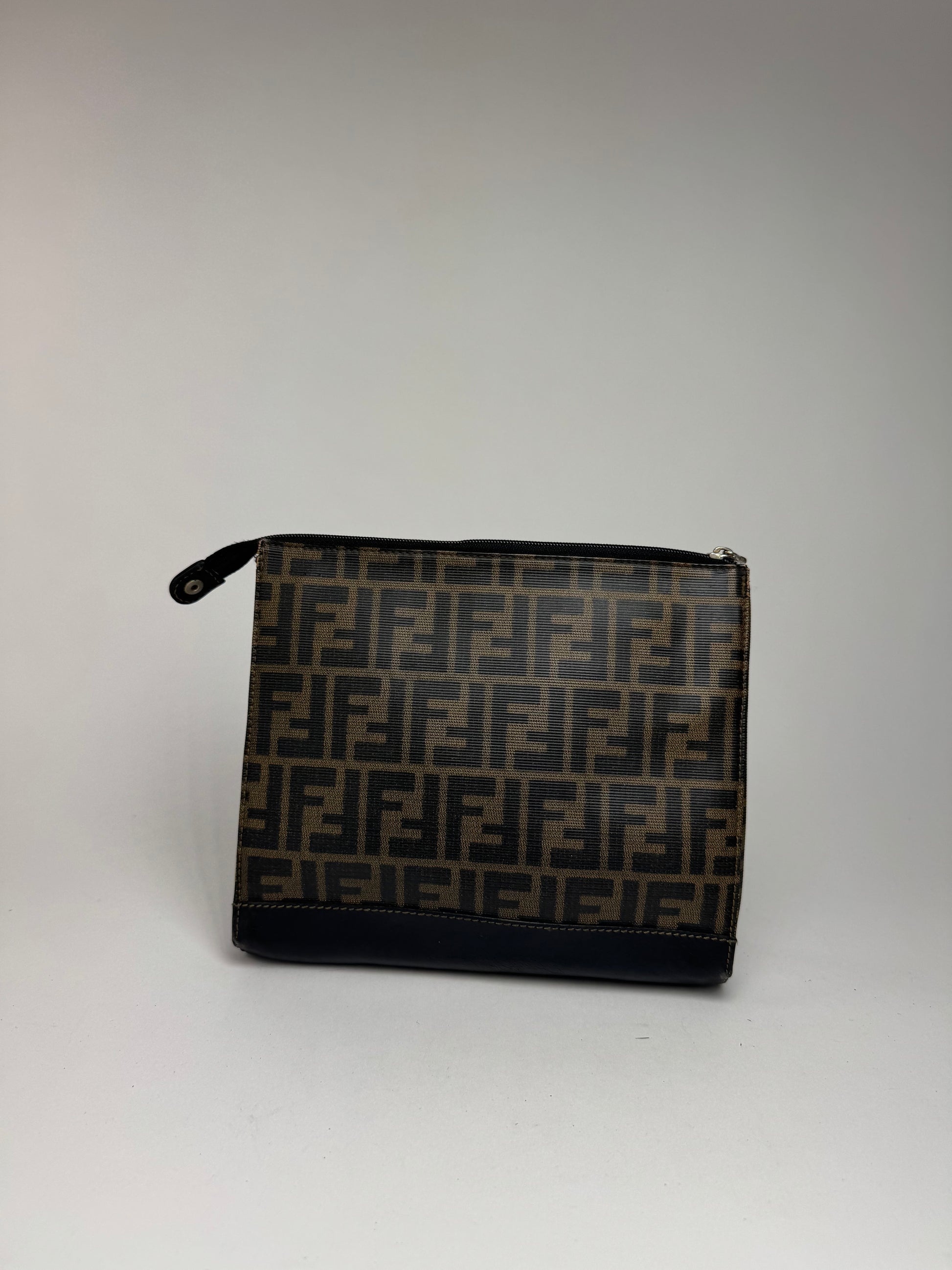 Cette pochette classique est finement confectionnée en cuir marron, ornée de l'emblématique monogramme FF de Fendi. Créé par Karl Lagerfeld en 1965, le logo « Fun Fur » est devenu un symbole durable de l'identité graphique et audacieuse de Fendi et de son héritage en maroquinerie de luxe. Les finitions et les détails structurels sont en cuir marron lisse, sans monogramme. La pochette se ferme par une fermeture éclair sur le dessus.