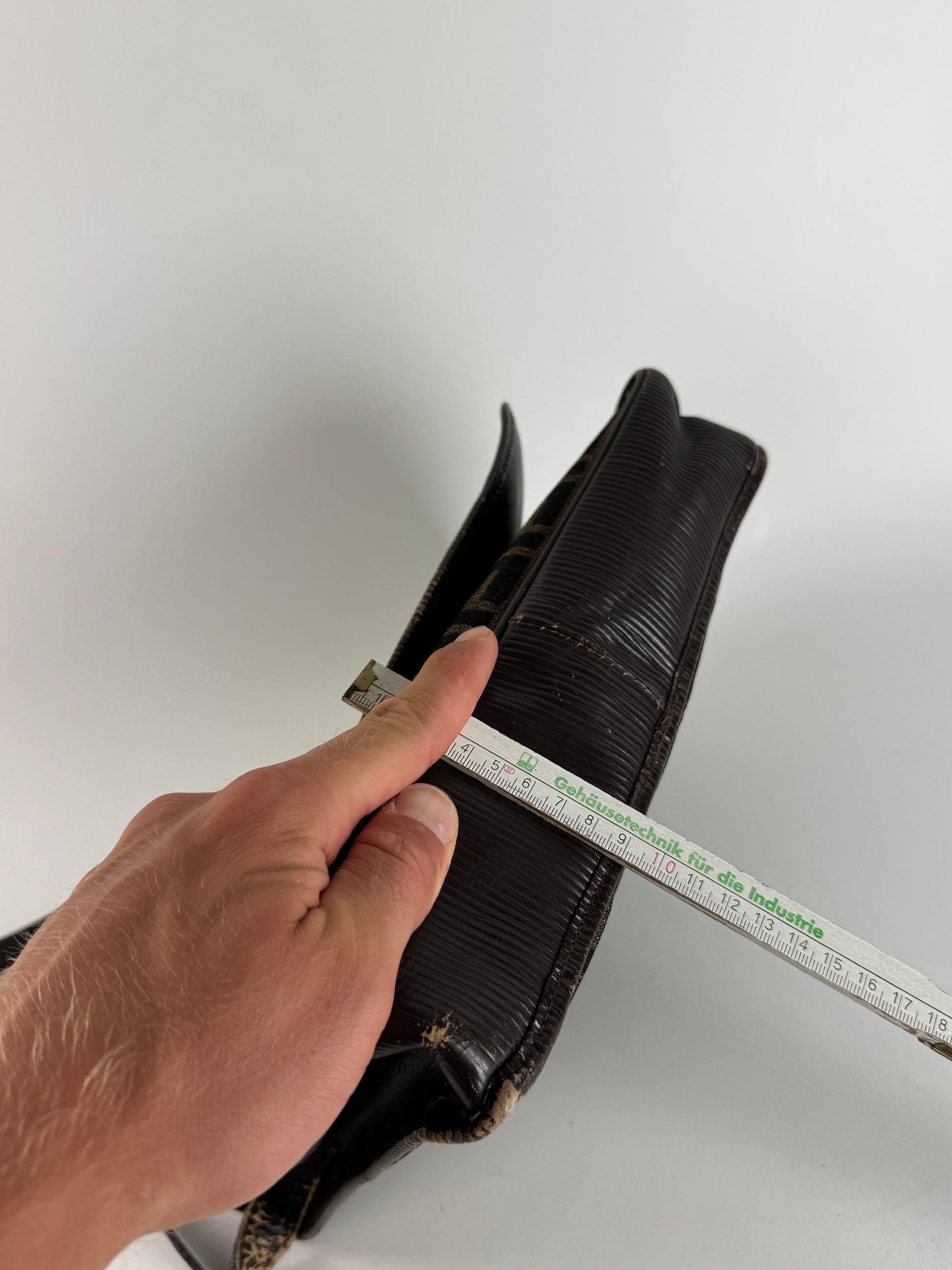 Détails de l'état : Coins endommagés et léger pelage sur la sangle ; dans l'ensemble, très bon état vintage.