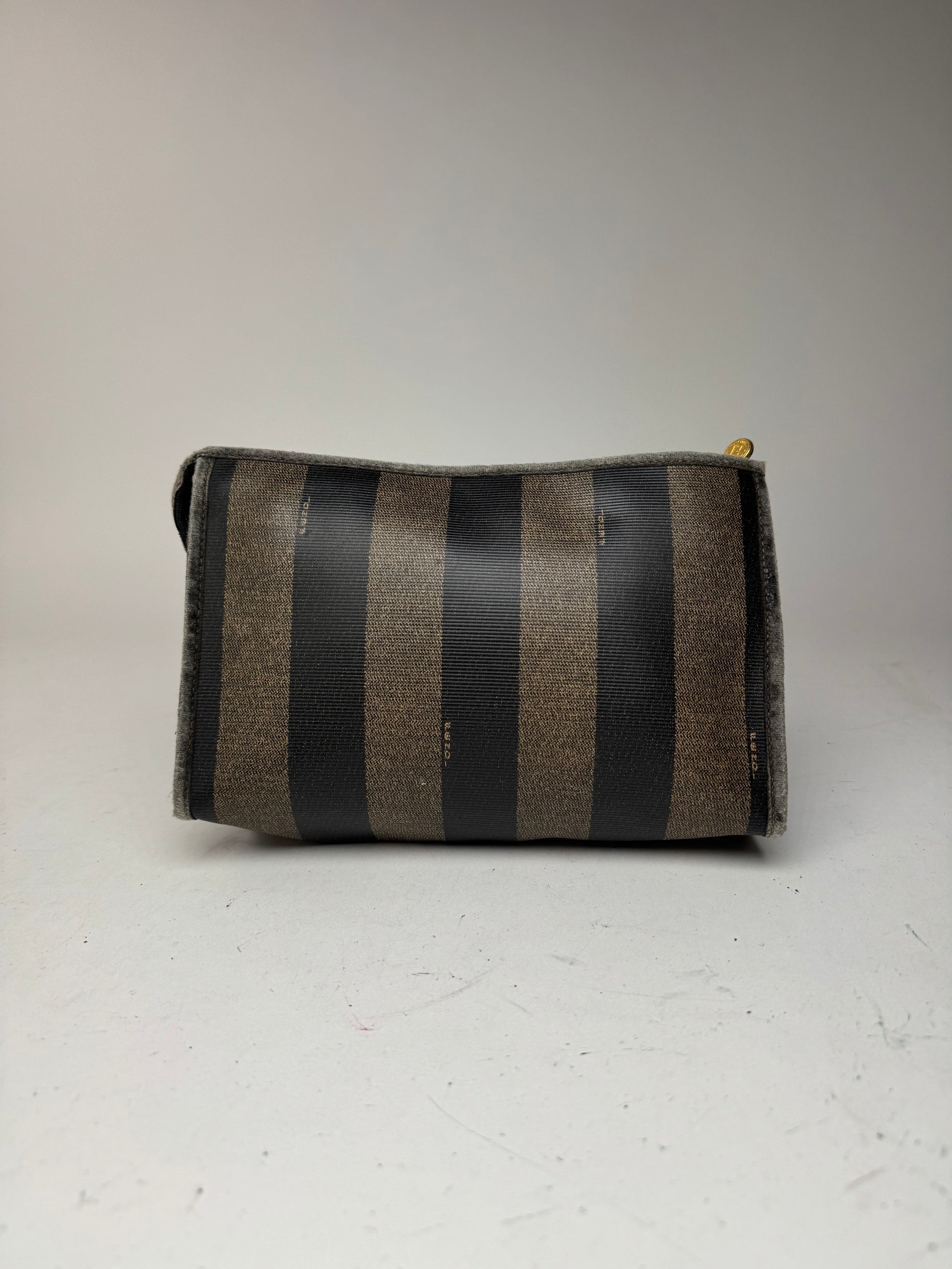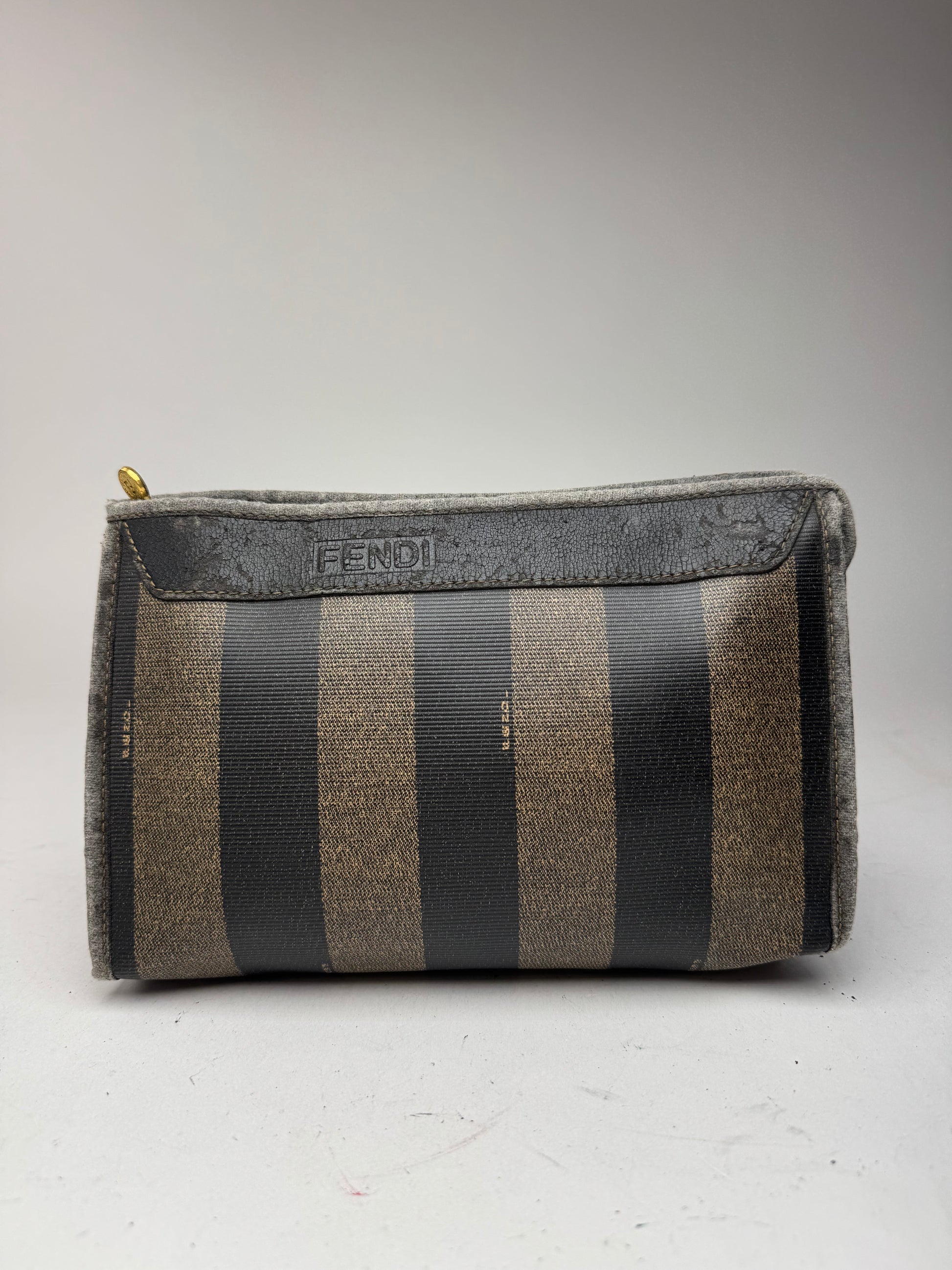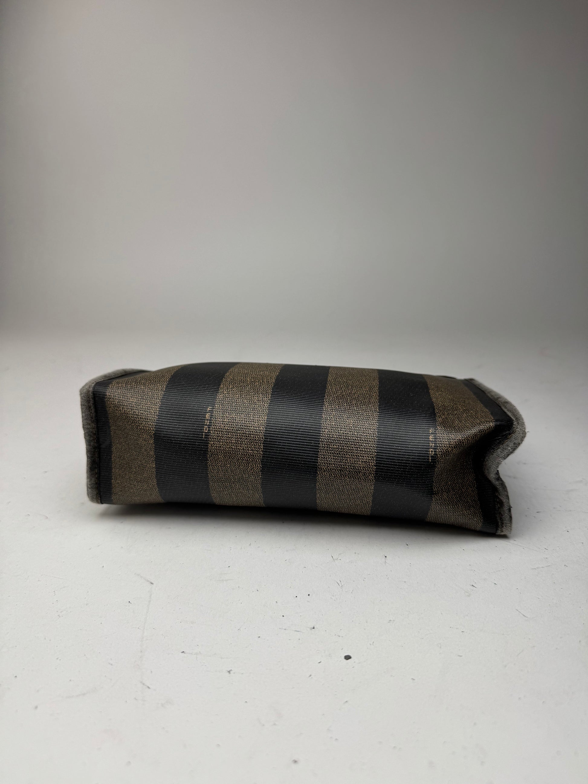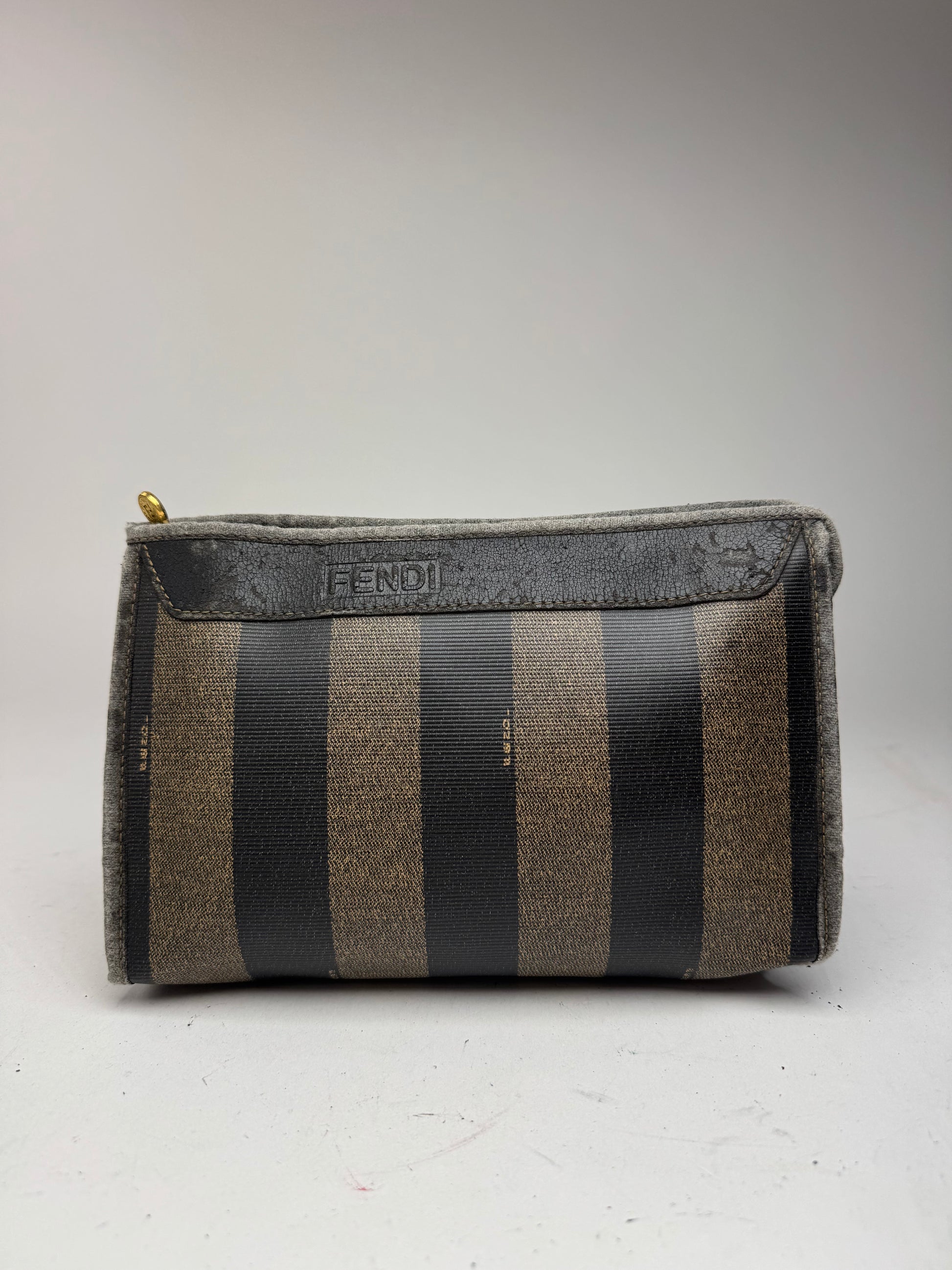 Cette pochette chic est finement confectionnée en cuir rayé marron et noir, avec des finitions en cuir noir. Elle est dotée d'accessoires en acier doré et d'une fermeture éclair sur le dessus qui s'ouvre sur un intérieur en cuir noir.