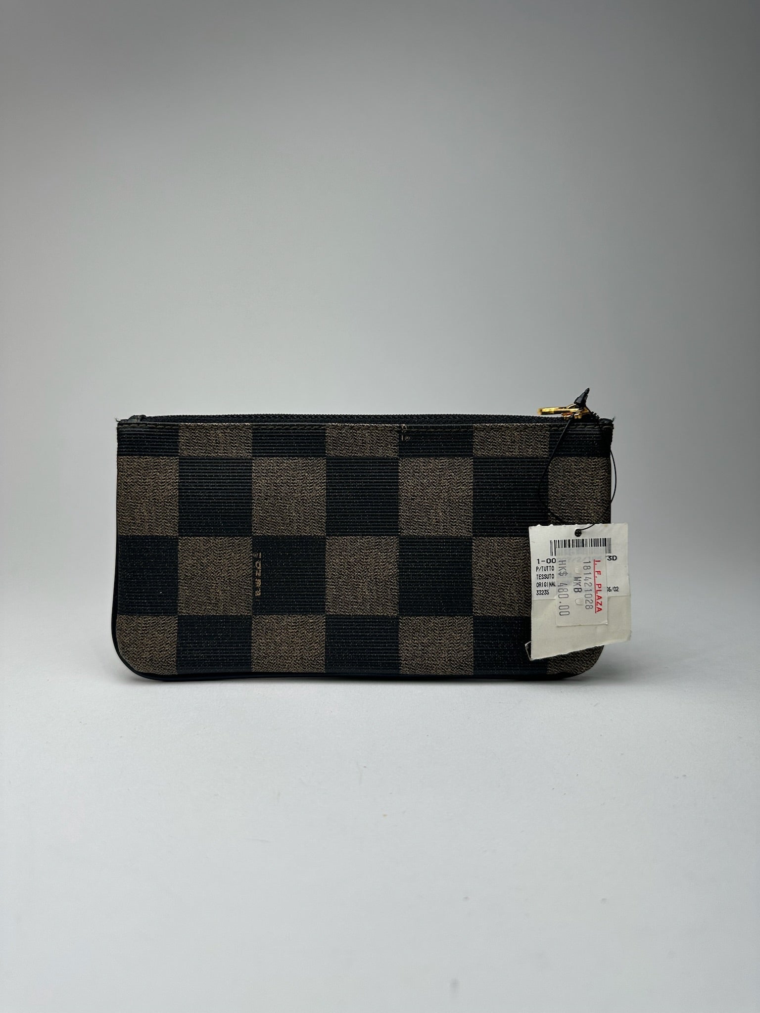 Porte-cartes FENDI en cuir à carreaux vintage. Ce porte-cartes chic est finement confectionné en cuir à carreaux marron et noir. Il est orné de détails en acier doré. L'intérieur est légèrement abîmé.