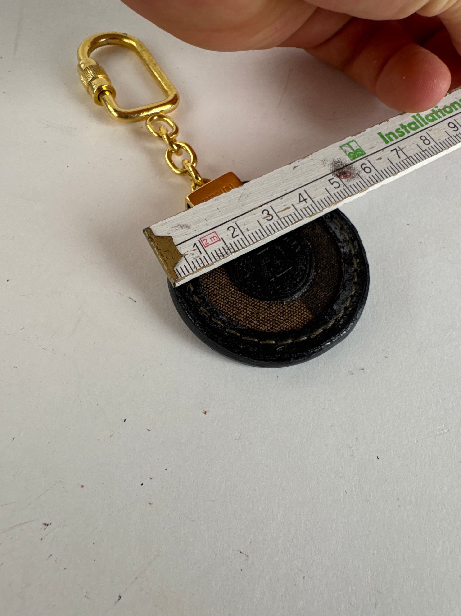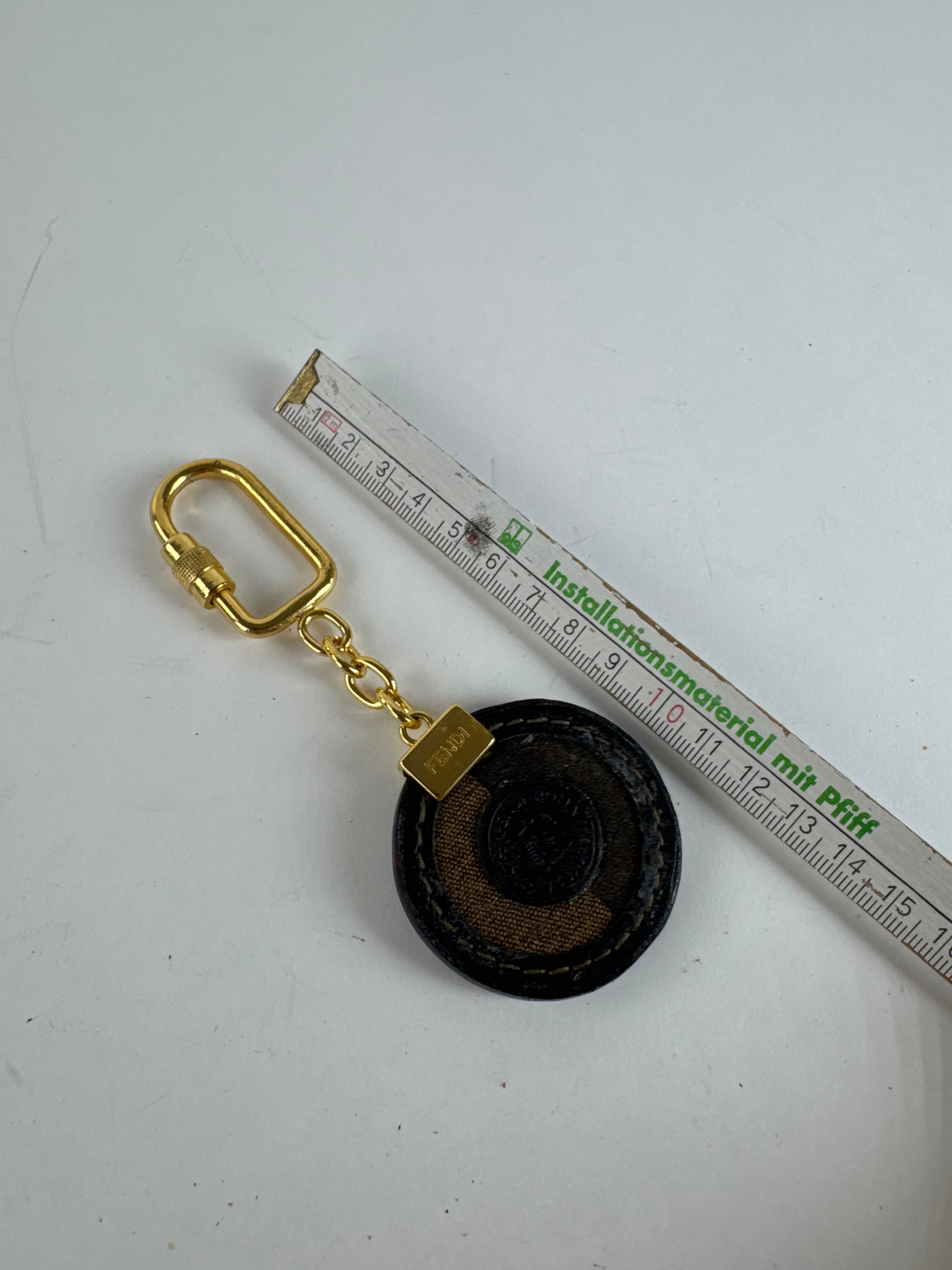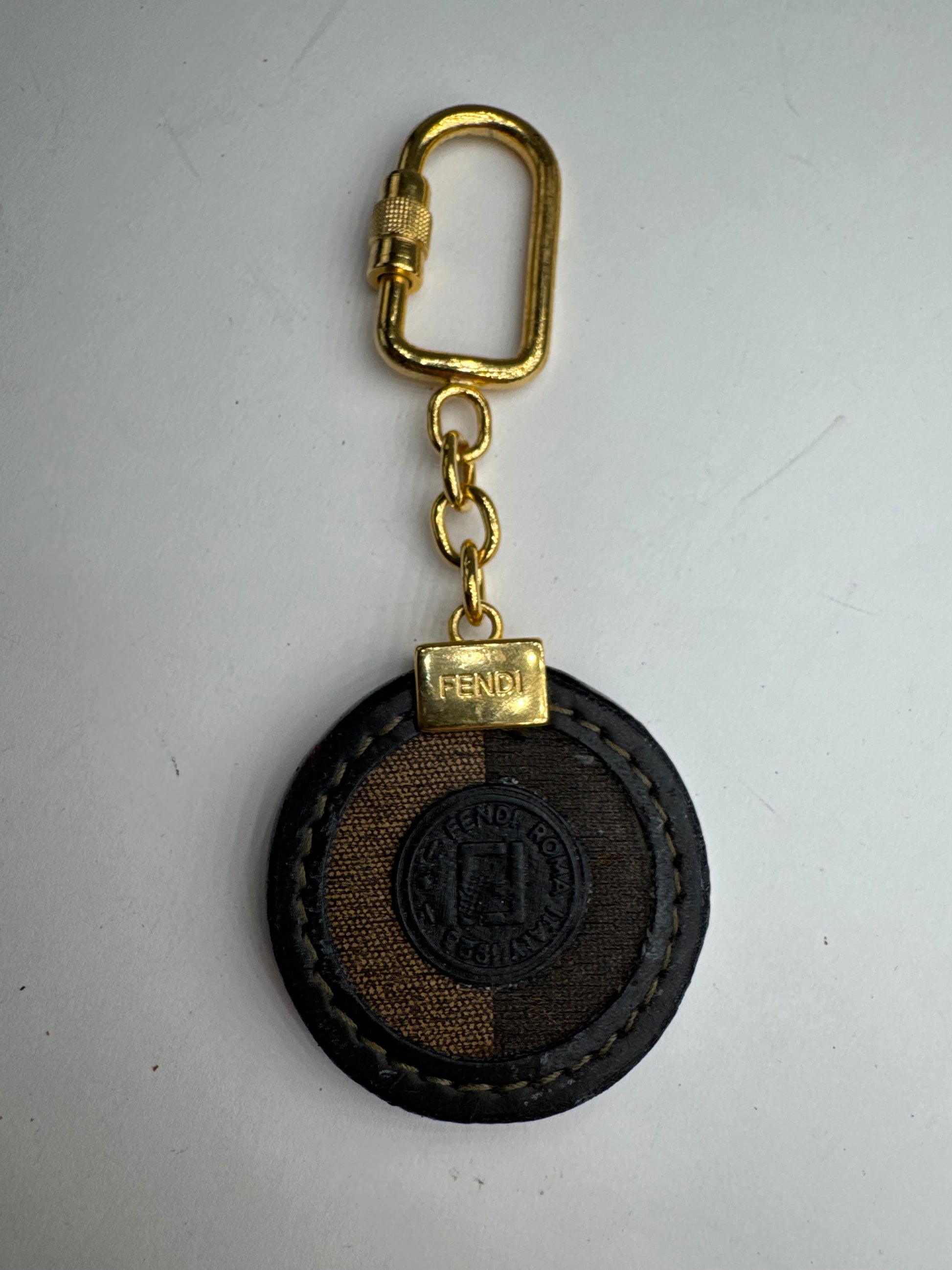 Cet élégant porte-clés vintage est confectionné en cuir marron à motifs et doté d'une chaîne en acier doré avec un fermoir mousqueton assorti. Accessoire à la fois fonctionnel et tendance, il reflète le style emblématique de Fendi.