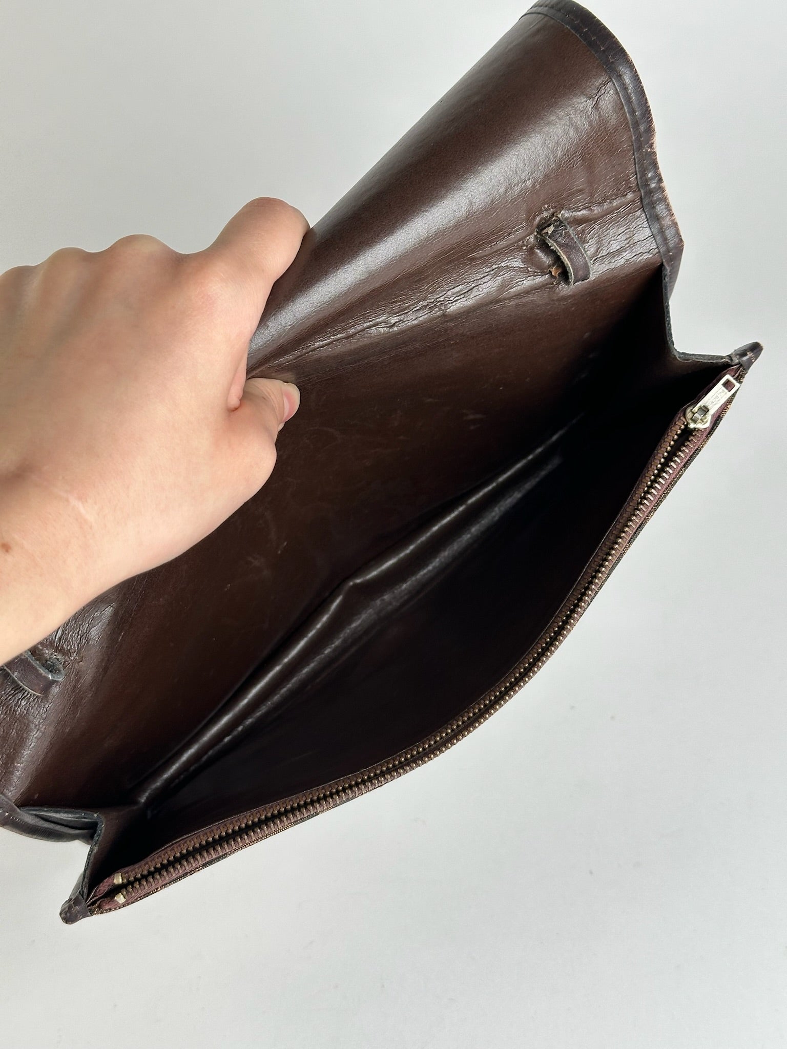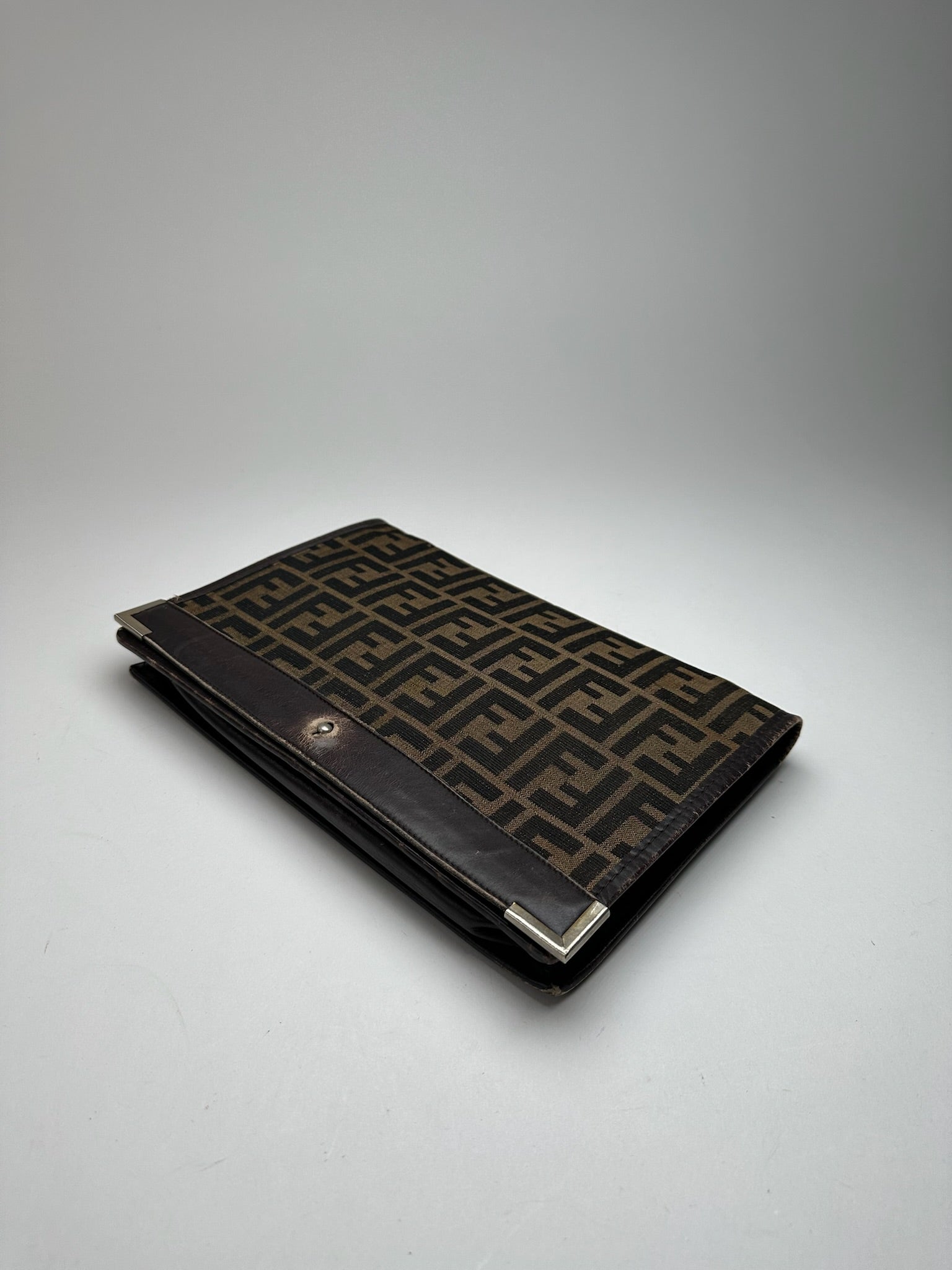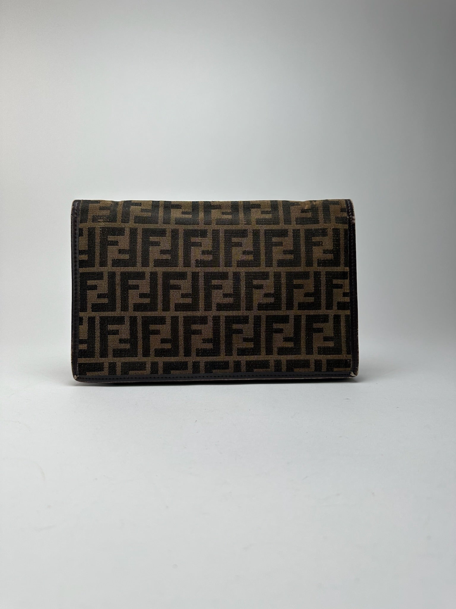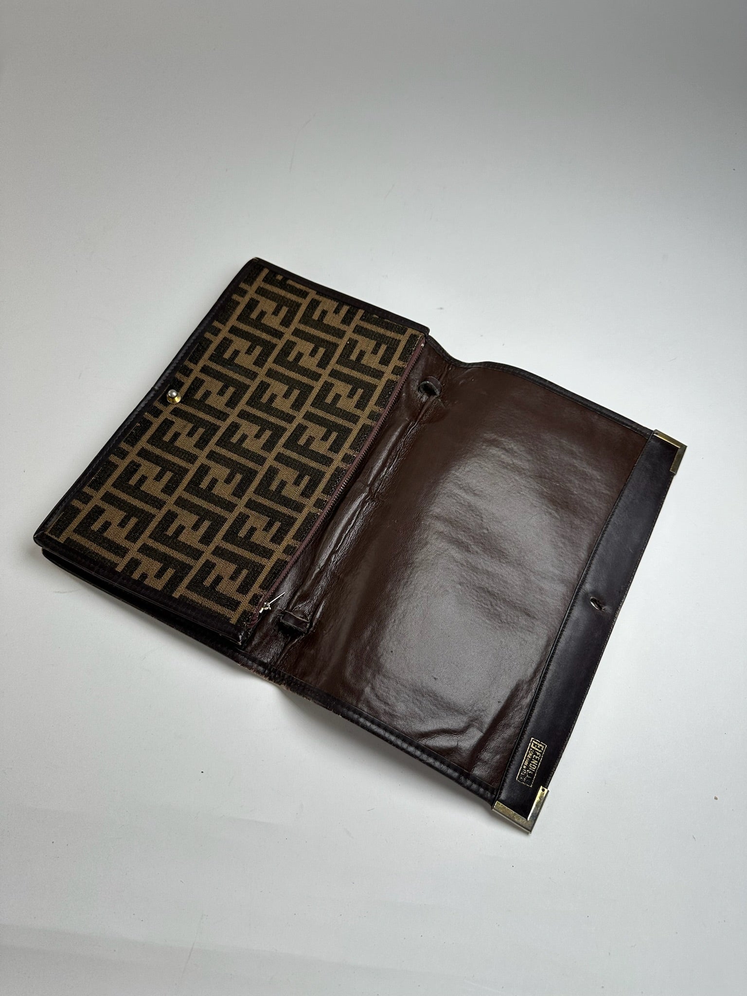 Pochette FENDI Vintage Monogramme FF. Cette pochette chic est finement confectionnée en toile marron, ornée de l'emblématique monogramme Fendi FF, et est ornée d'une bordure en cuir marron foncé. Créé par Karl Lagerfeld en 1965, le logo FF (abréviation de « Fun Fur ») est rapidement devenu un symbole du luxe italien audacieux et reste une signature de la maison. Ce sac est doté d'une bandoulière amovible permettant de le porter à l'épaule. Il s'ouvre par un rabat et des finitions argentées, sur un intérieur en cuir marron.