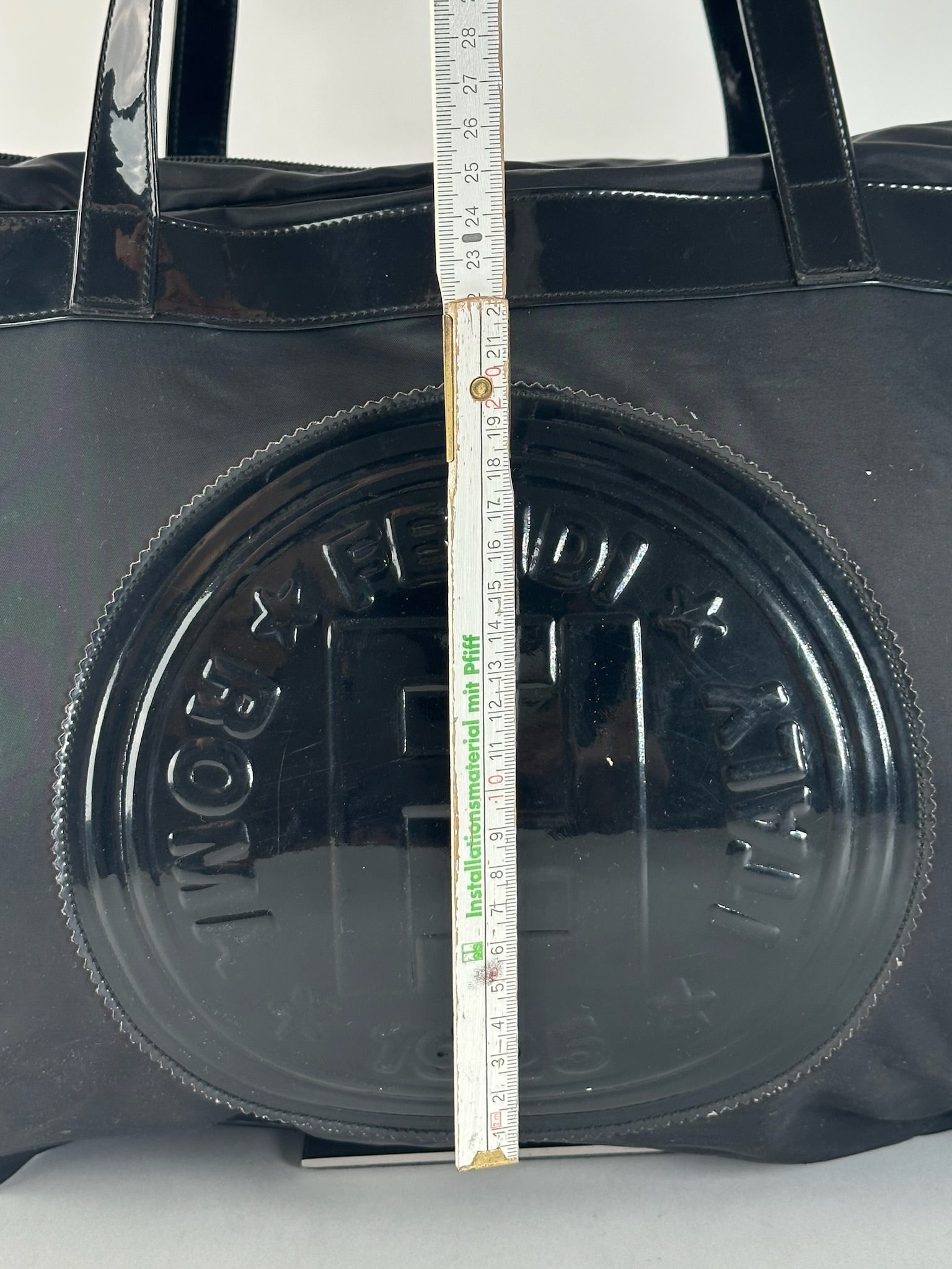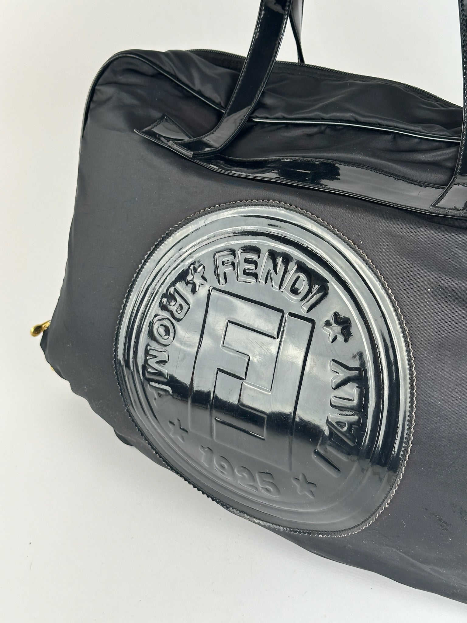Sac de voyage FENDI Vintage avec logo FF. Ce sac de voyage chic est confectionné en toile noire avec des poignées et des finitions en cuir verni. Le devant arbore l'emblématique logo FF Fendi en cuir verni noir. Créé en 1965 par Karl Lagerfeld, le logo FF – abréviation de « Fun Fur » – est devenu un symbole intemporel de la marque Fendi. Ce sac possède une fermeture zippée sur le dessus et s'ouvre sur un intérieur en polyester noir.