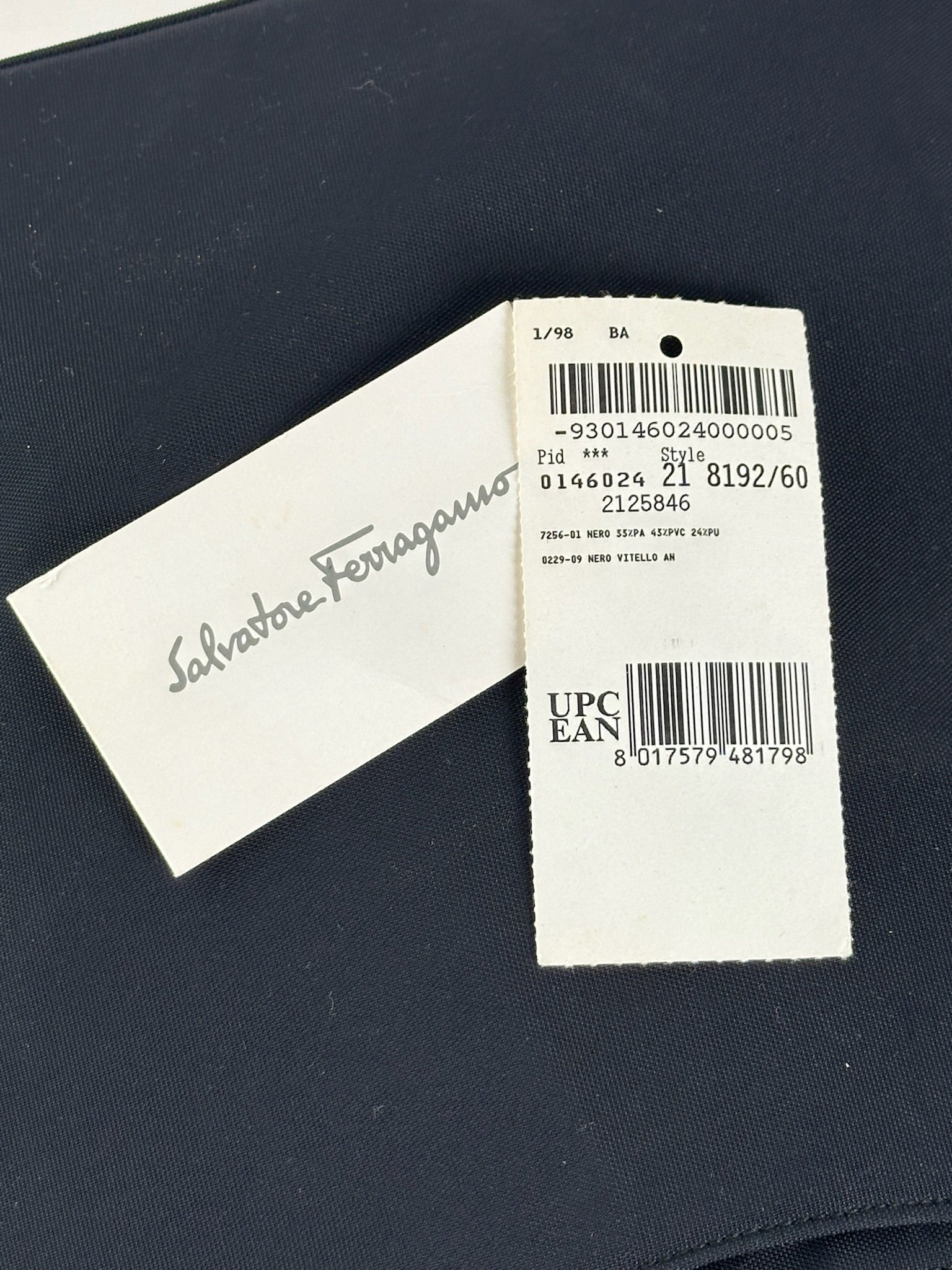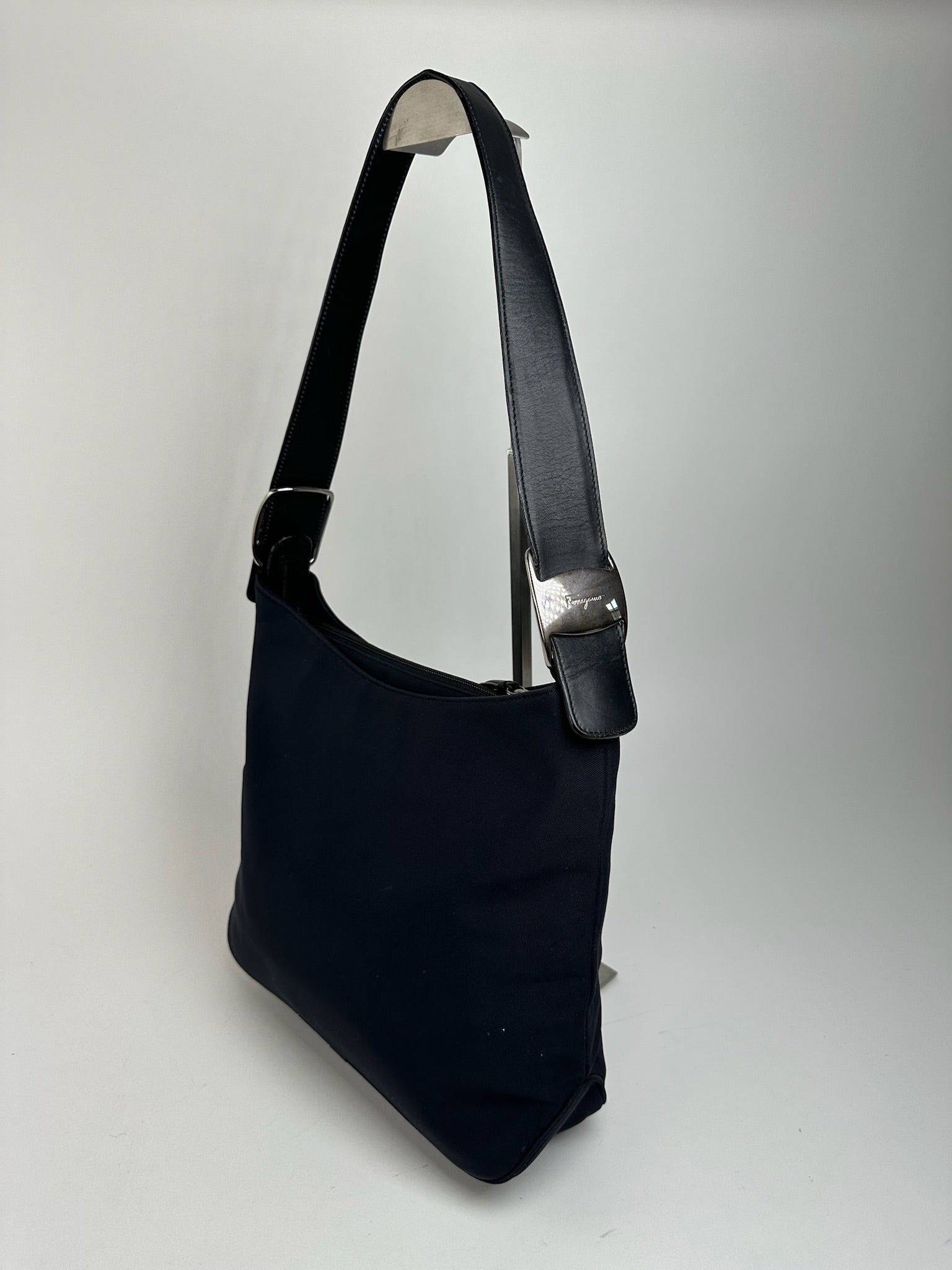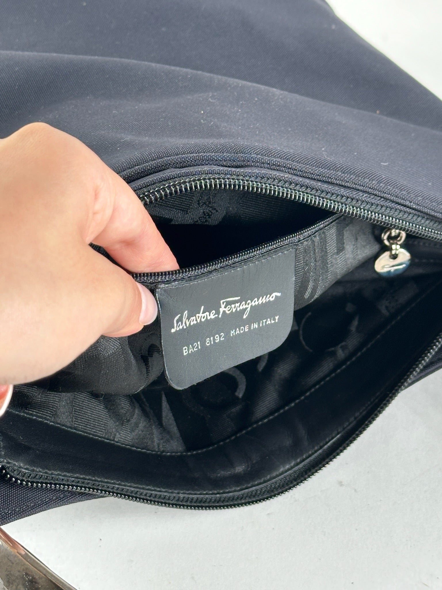 Sac bandoulière vintage SALVATORE FERRAGAMO en toile noire. Cet élégant sac bandoulière vintage est confectionné en toile noire avec une poignée en cuir noir. Il est doté d'accessoires en acier argenté et d'une bandoulière réglable pour un confort optimal. L'intérieur est doublé en polyester noir orné du monogramme Ferragamo. Fabriqué en Italie, ce modèle porte l'étiquette d'origine et le numéro de série BA218192.