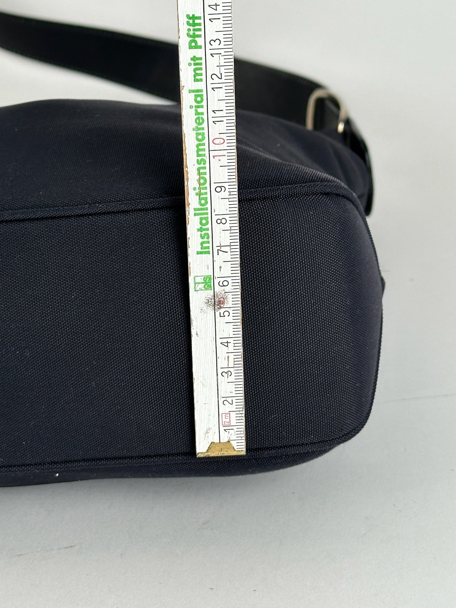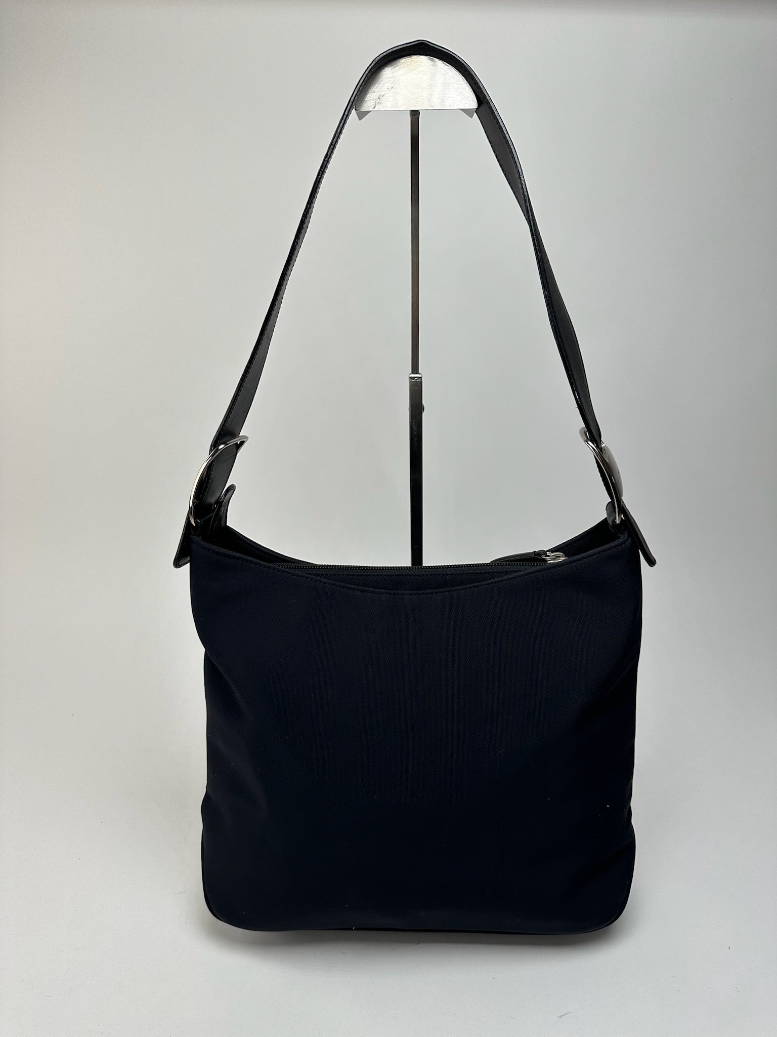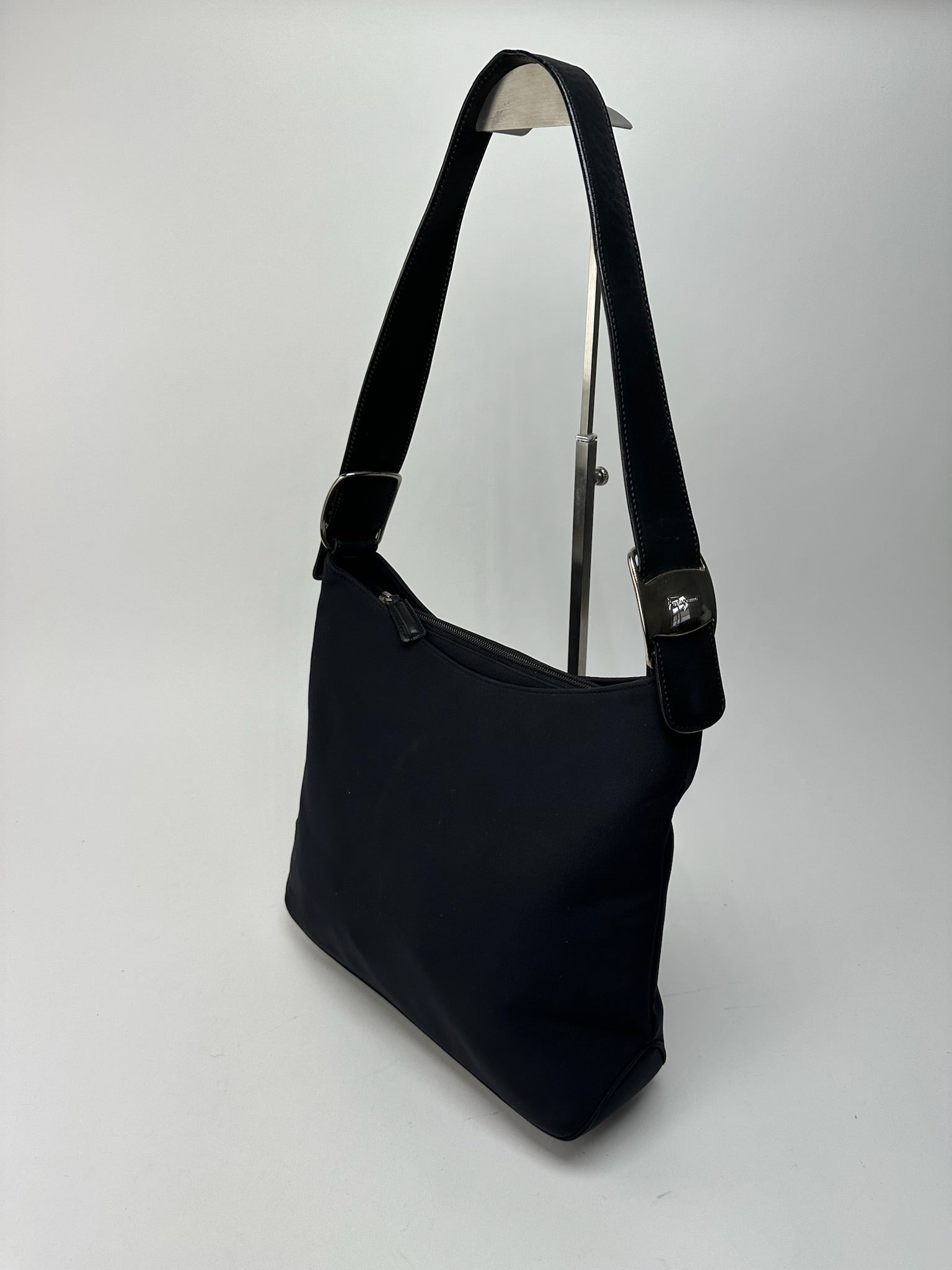 Sac bandoulière vintage SALVATORE FERRAGAMO en toile noire. Cet élégant sac bandoulière vintage est confectionné en toile noire avec une poignée en cuir noir. Il est doté d'accessoires en acier argenté et d'une bandoulière réglable pour un confort optimal. L'intérieur est doublé en polyester noir orné du monogramme Ferragamo. Fabriqué en Italie, ce modèle porte l'étiquette d'origine et le numéro de série BA218192.