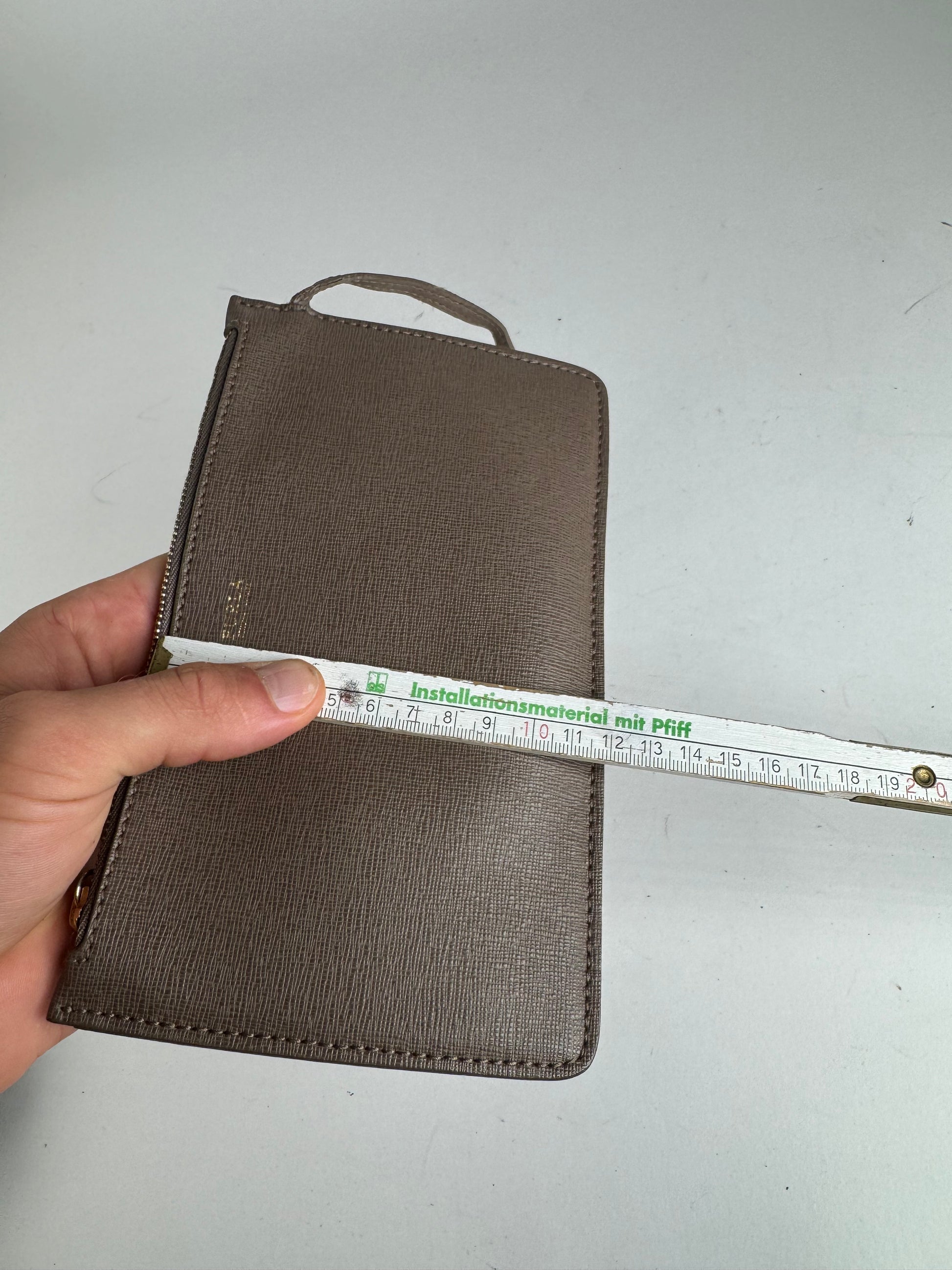 Cette élégante pochette vintage est finement confectionnée en cuir marron texturé et arbore un logo Furla central en or poli. Elle est agrémentée d'une dragonne en cuir fermée par un fermoir en acier doré. L'intérieur est doublé d'un doux tissu gris effet laine, alliant fonctionnalité et élégance discrète.