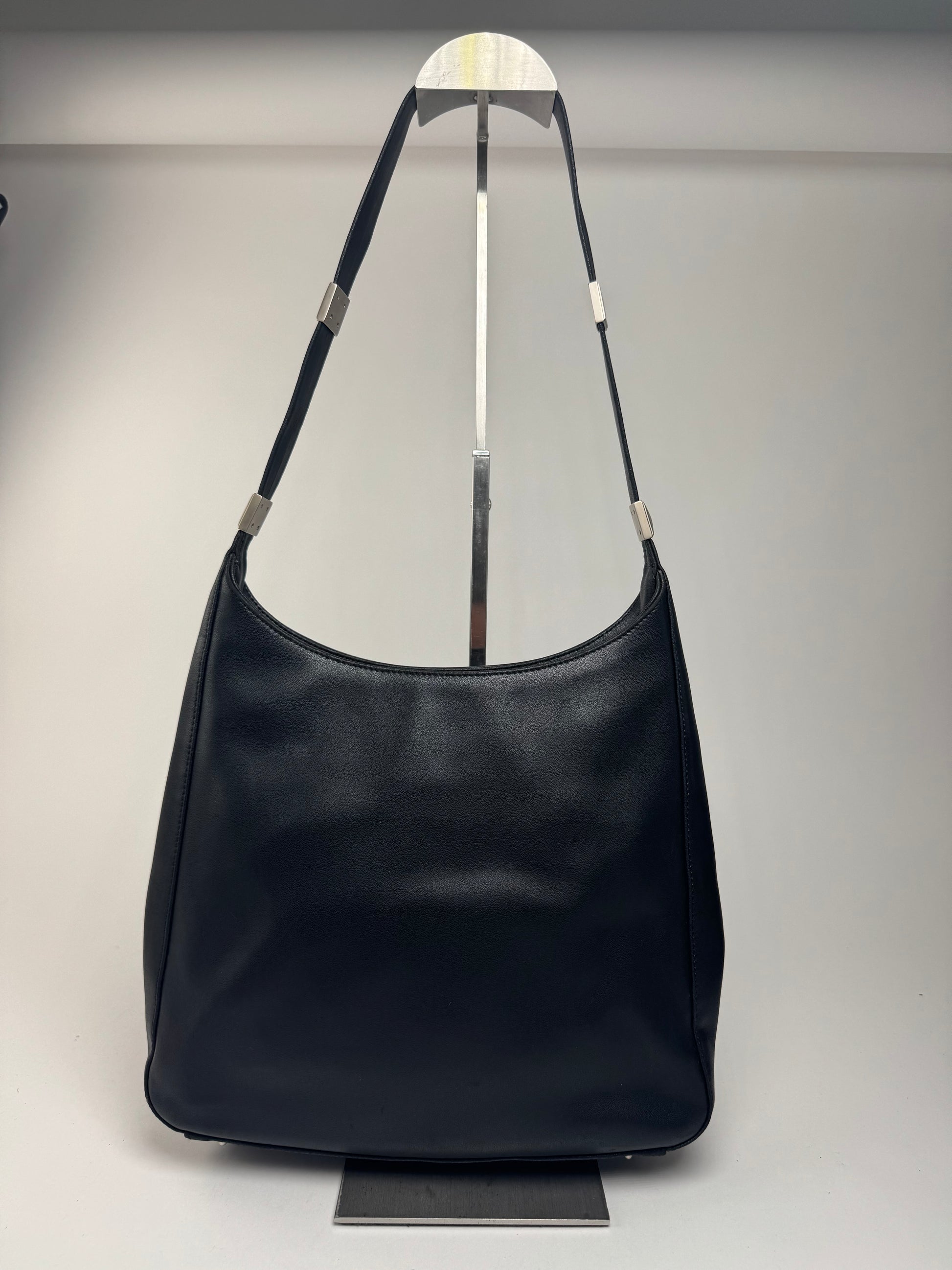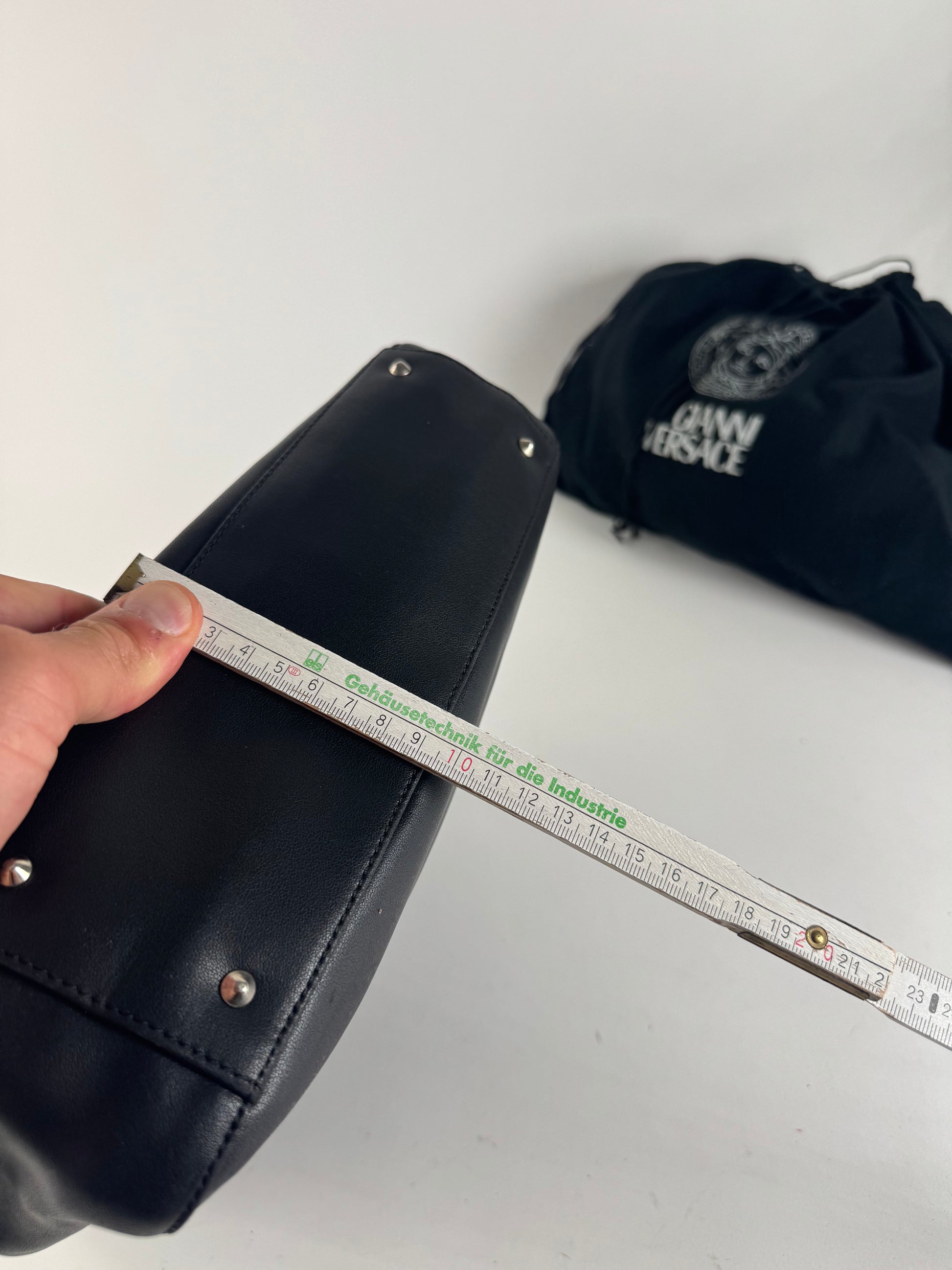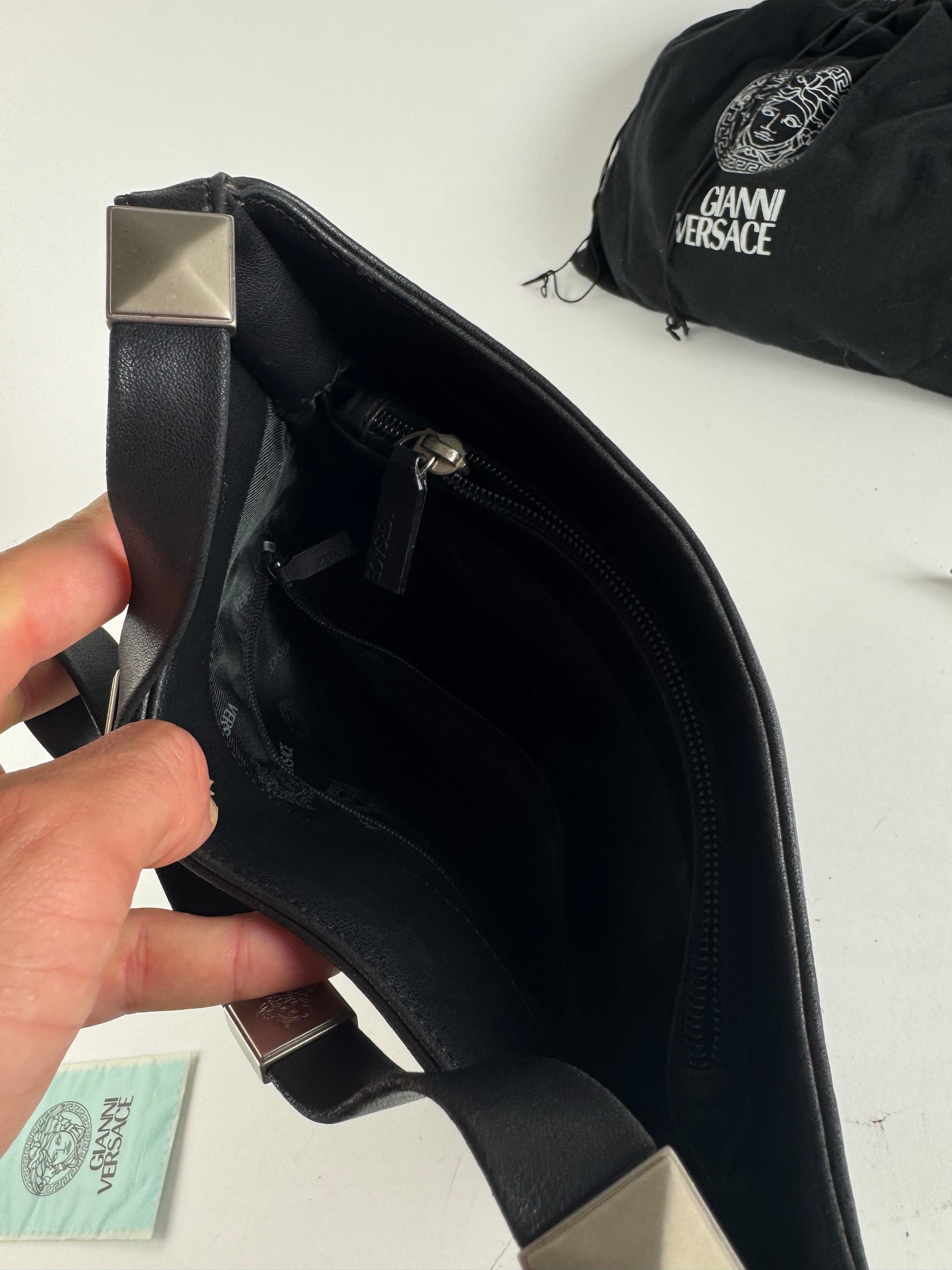 Sac bandoulière vintage en cuir GIANNI VERSACE. Ce sac bandoulière vintage des années 1990 est finement confectionné en cuir noir et doté de finitions en acier argenté. Il possède une anse unique, suffisamment longue pour être porté à l'épaule. L'intérieur comprend trois compartiments pour un rangement organisé.