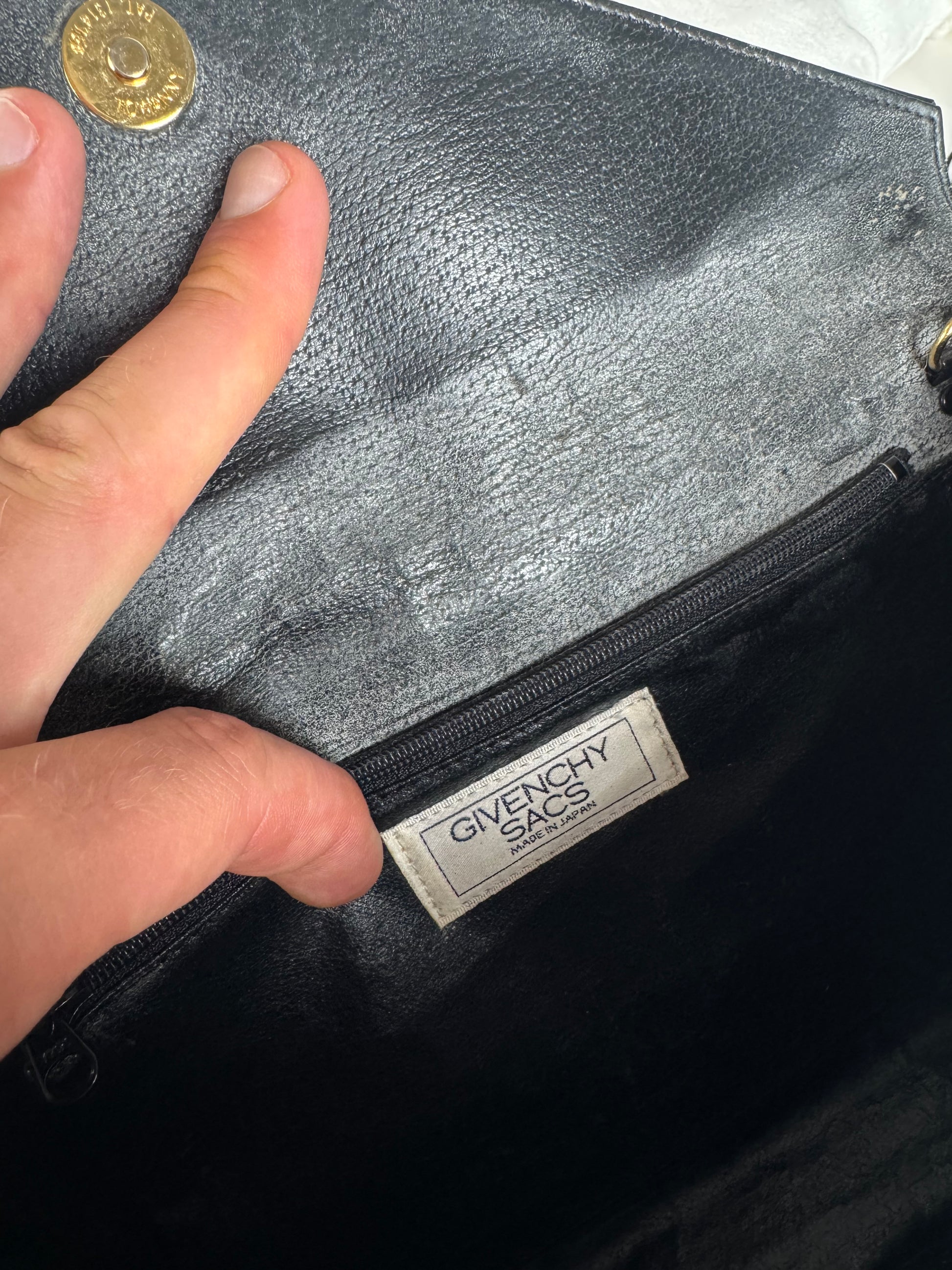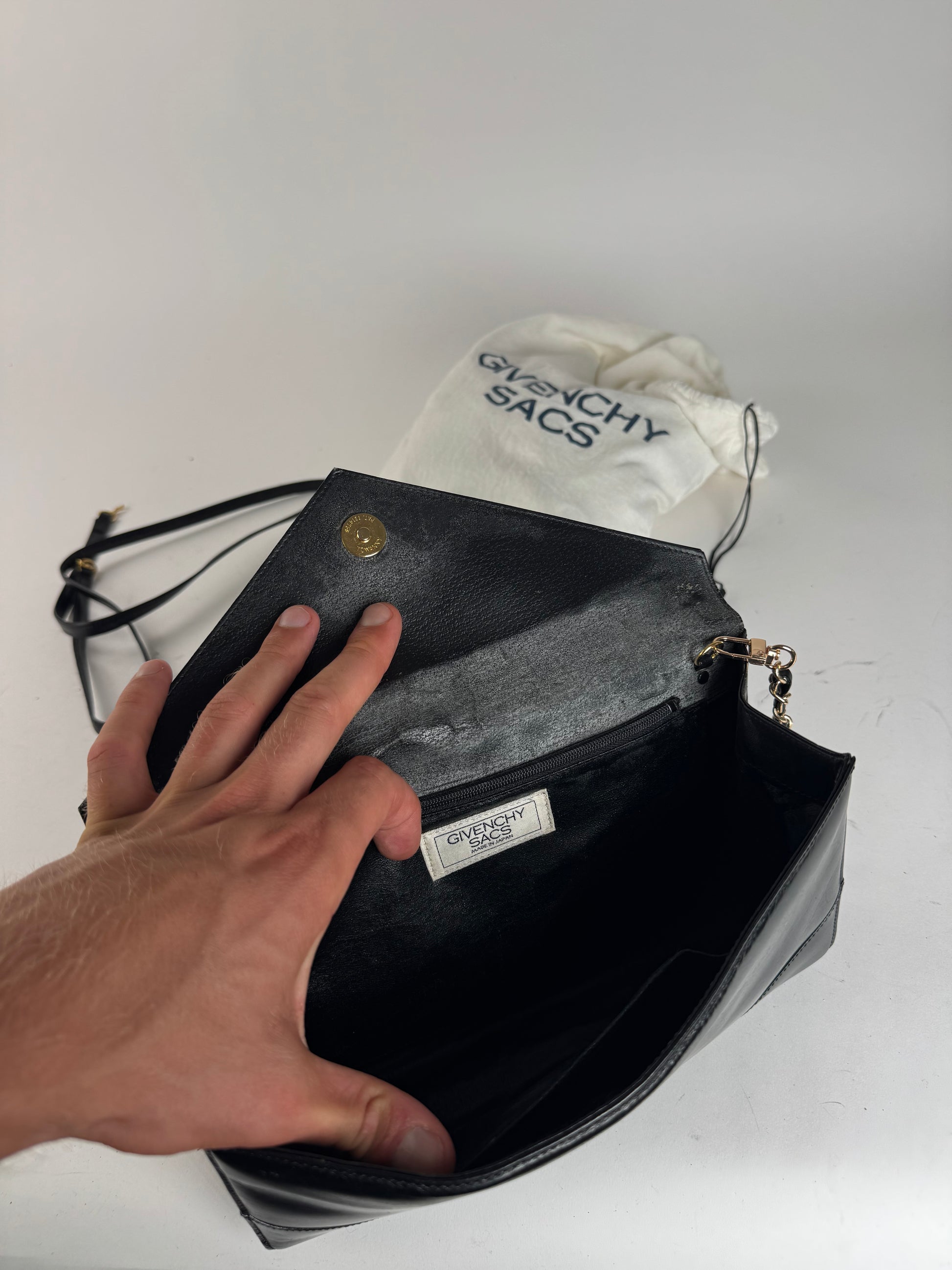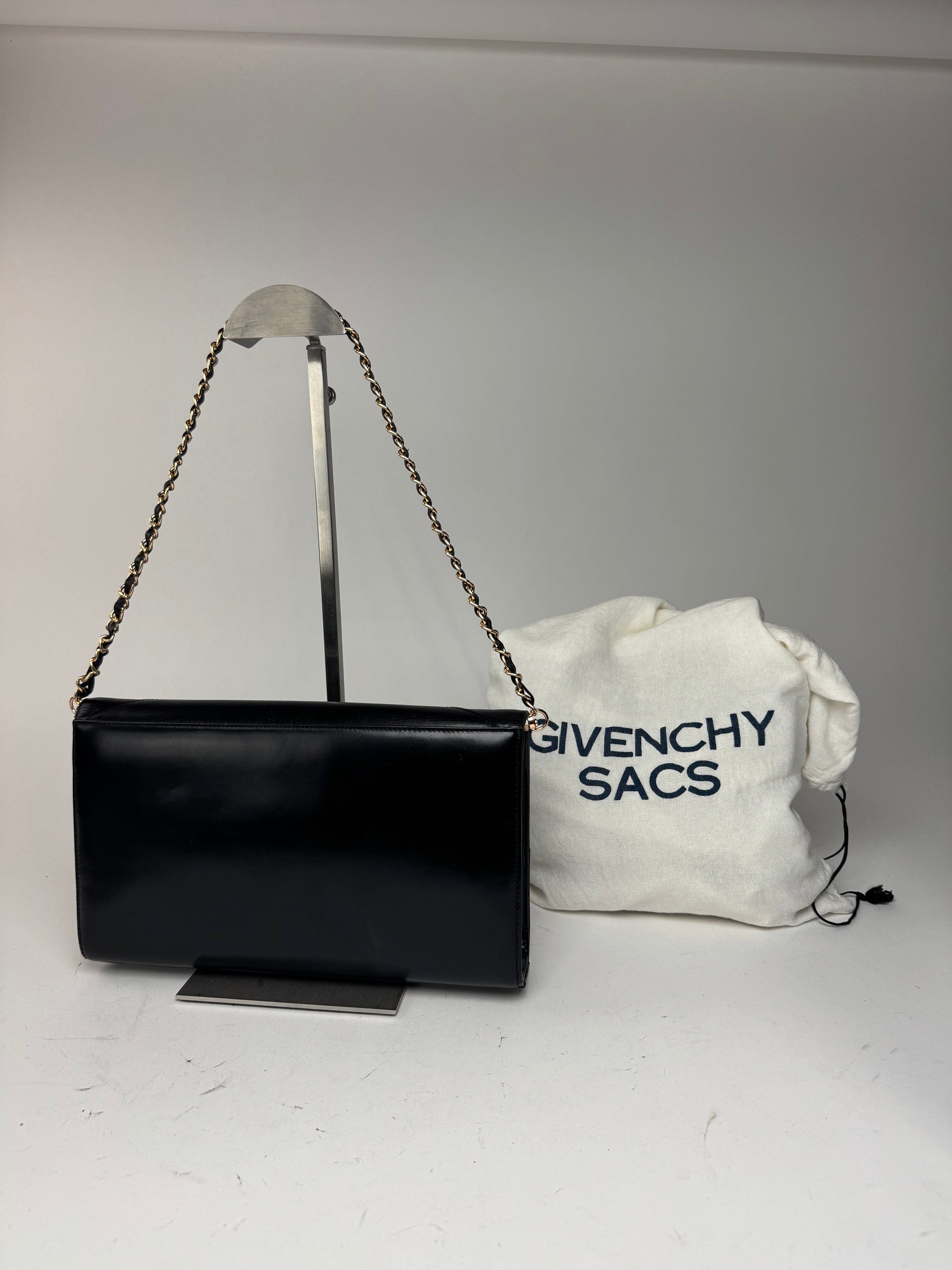 Sac GIVENCHY Vintage en cuir verni noir. Cet élégant sac à main en cuir noir brillant présente une silhouette structurée, une bandoulière et une poignée supérieure de rechange. Le devant est orné d'une plaque logo Givenchy en acier doré.