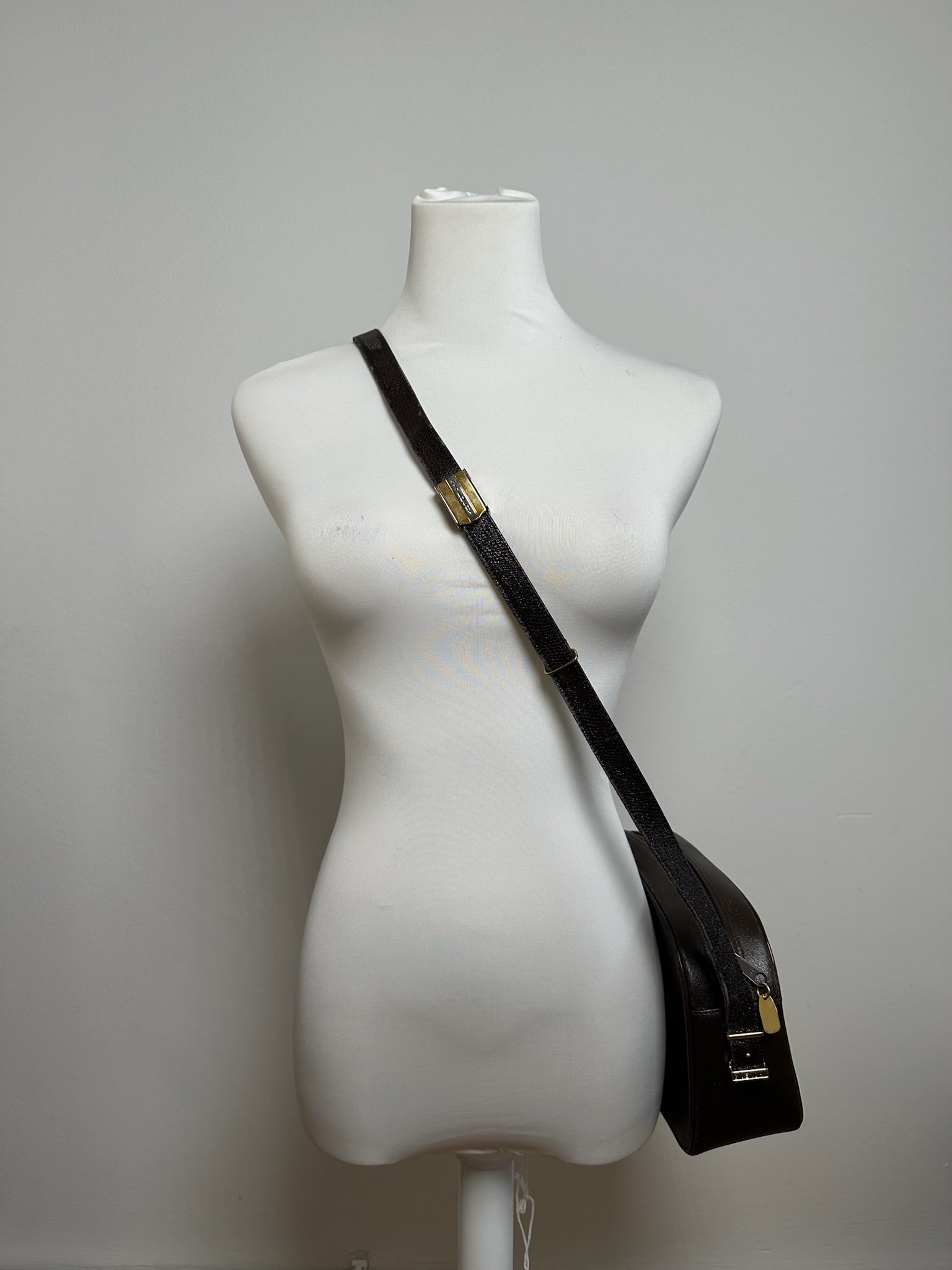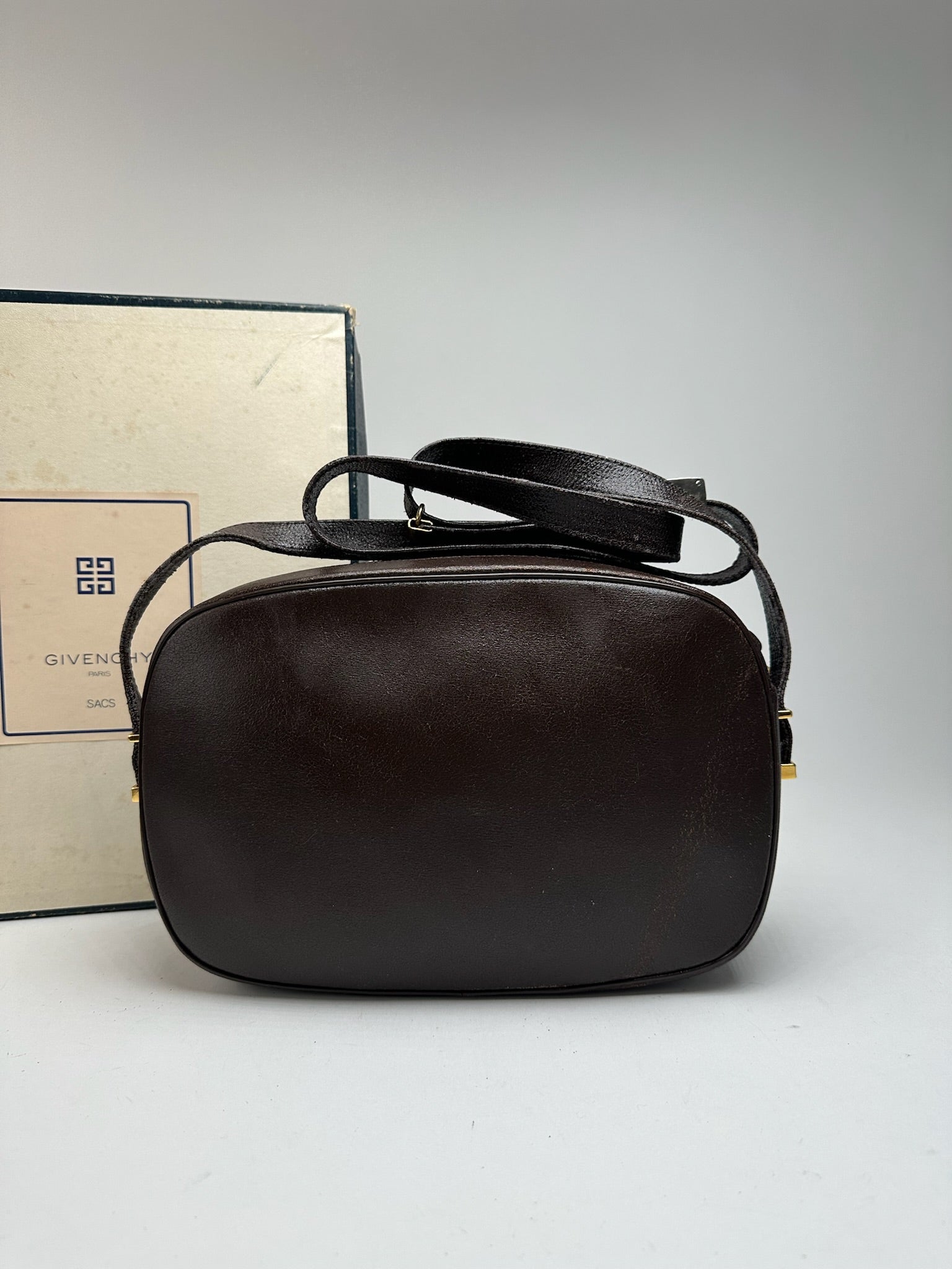 Sac à main vintage GIVENCHY 4G. Ce sac structuré est finement confectionné en cuir marron foncé et arbore une plaque logo GIVENCHY 4G en acier doré sur le devant. Il est doté d'une bandoulière légèrement réglable et d'accessoires dorés polis pour une silhouette intemporelle et raffinée.