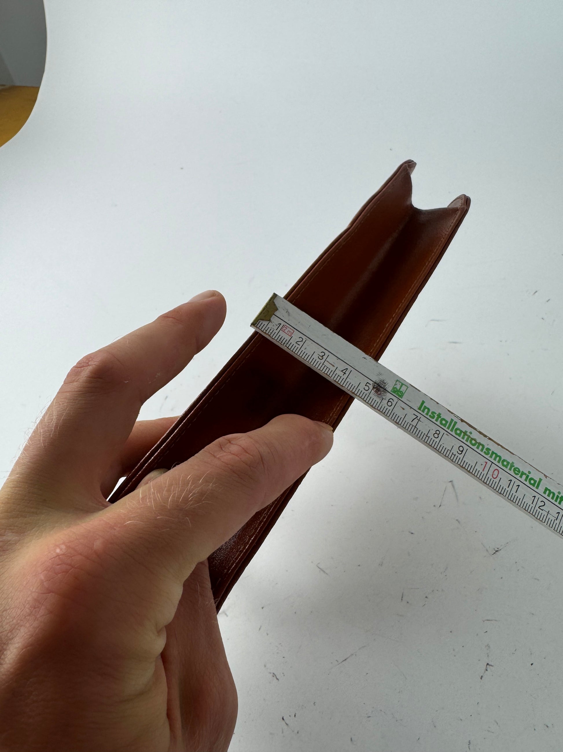 État : L'extérieur en cuir est bien conservé, avec des rayures superficielles visibles. La quincaillerie est brillante et présente de légères traces d'utilisation. L'intérieur, doublé de cuir orange assorti, est propre et intact.