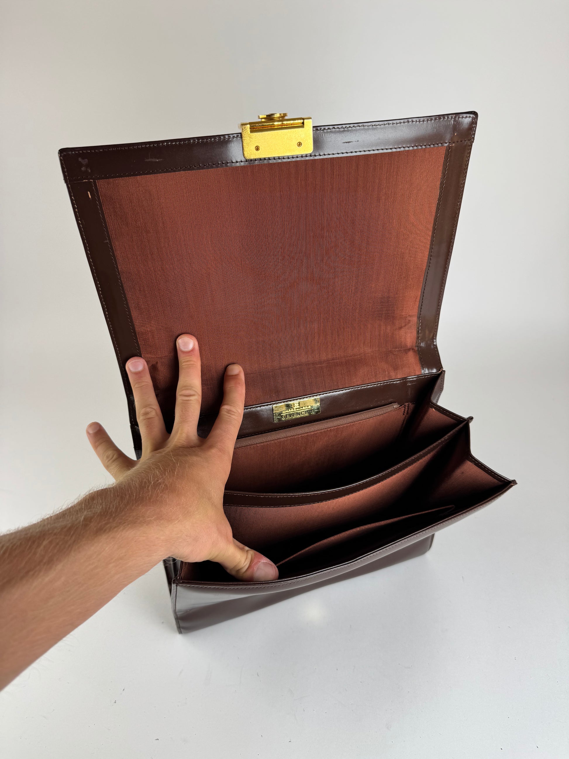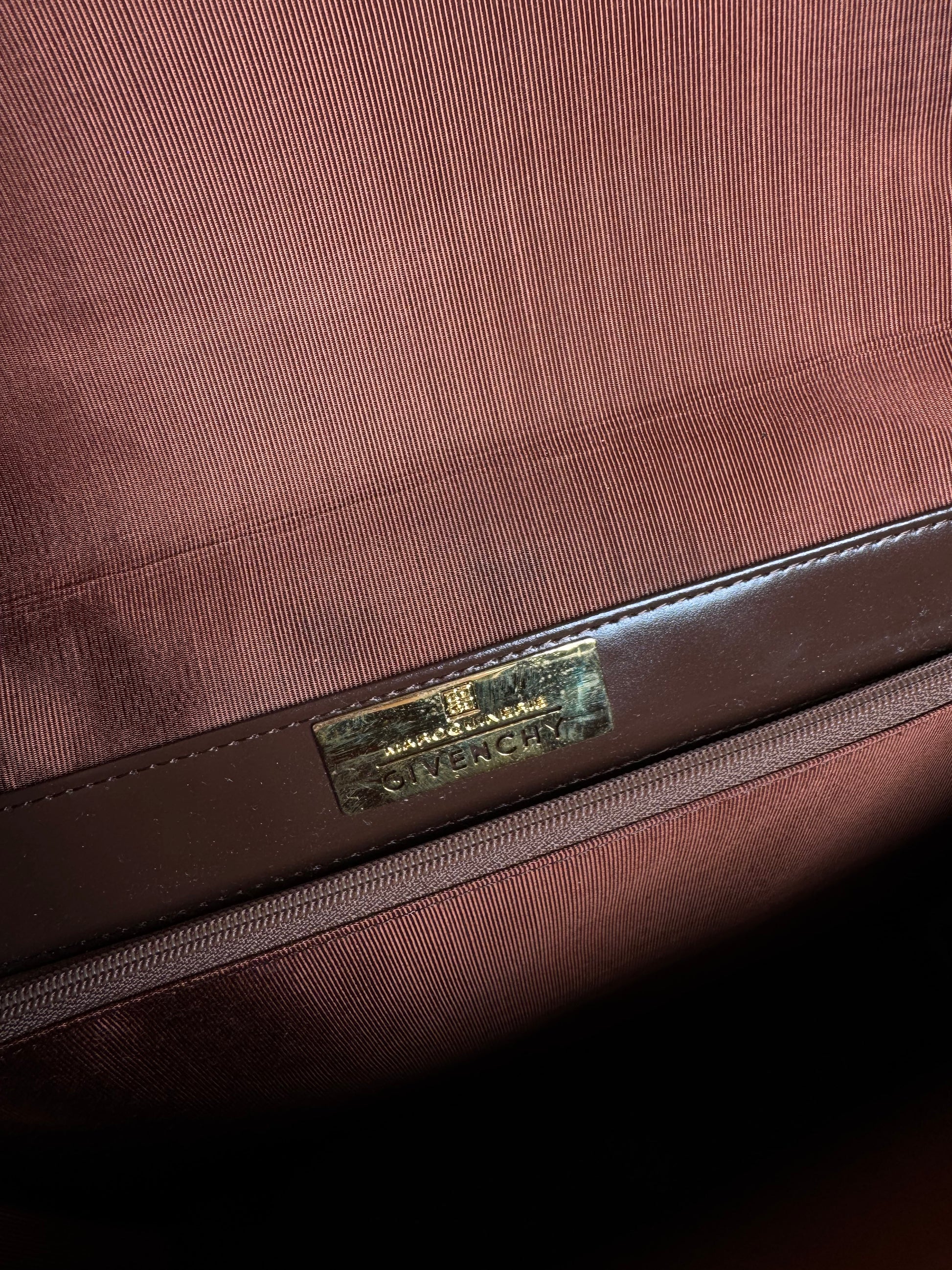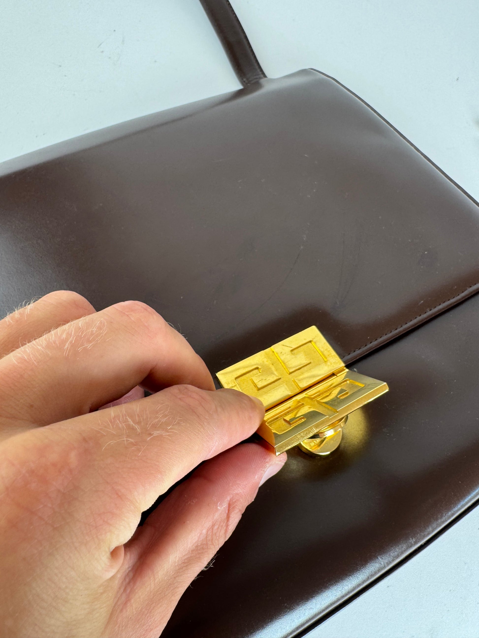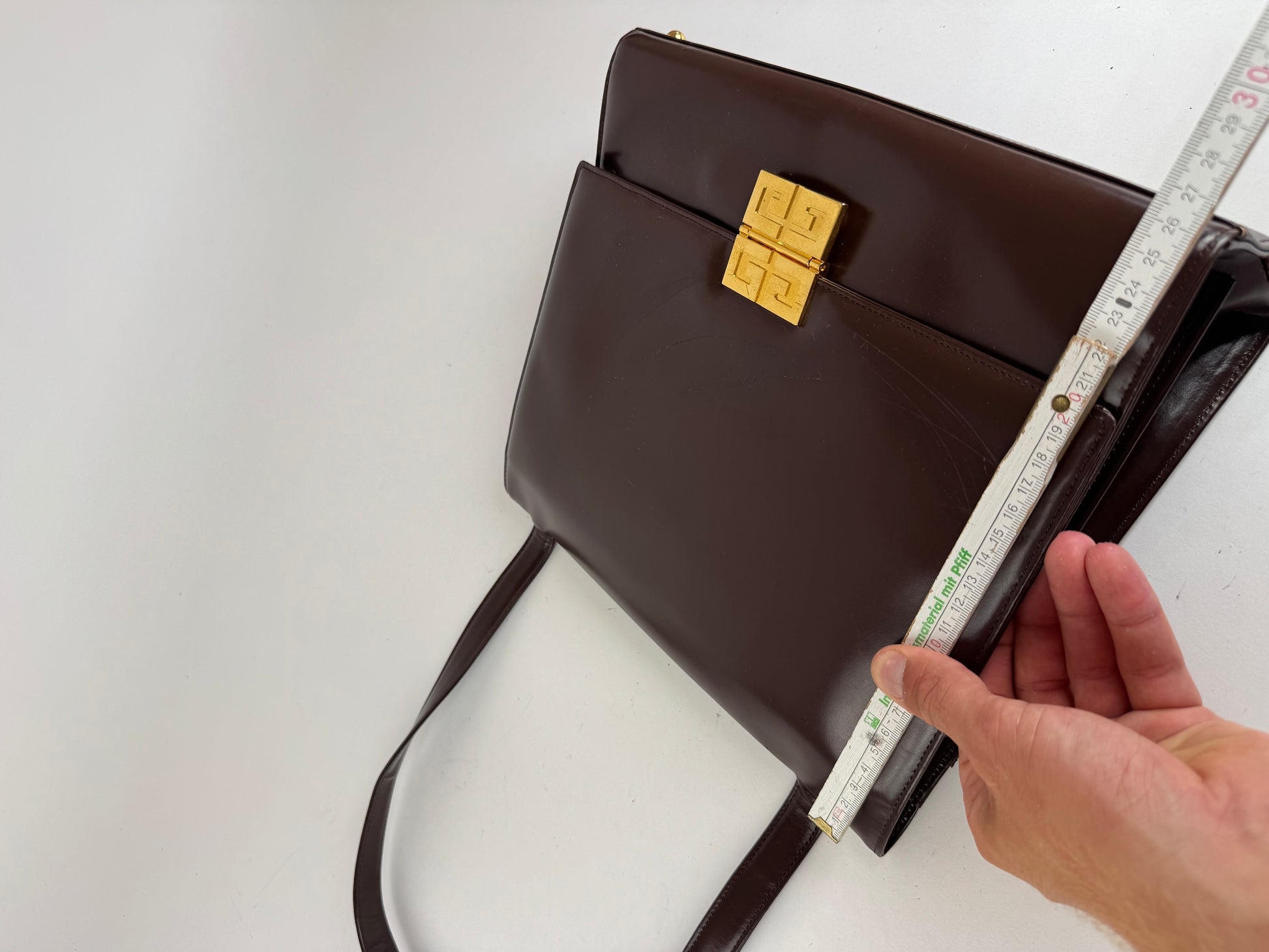 Sac à main GIVENCHY Vintage 4G. Ce sac à main vintage sophistiqué est confectionné en cuir verni marron. Il est doté d'une fermeture aimantée et d'une longue anse pour un porté épaule. Le modèle 4G, baptisé d'après les quatre « G » entrelacés de Givenchy, est une signature de la maison depuis son lancement à la fin du XXe siècle, symbolisant élégance et modernité. Le devant est orné du logo Givenchy en acier doré. L'intérieur est doublé de toile marron, une matière résistante et raffinée, traditionnellement utilisée par la marque pour son équilibre entre luxe et praticité.