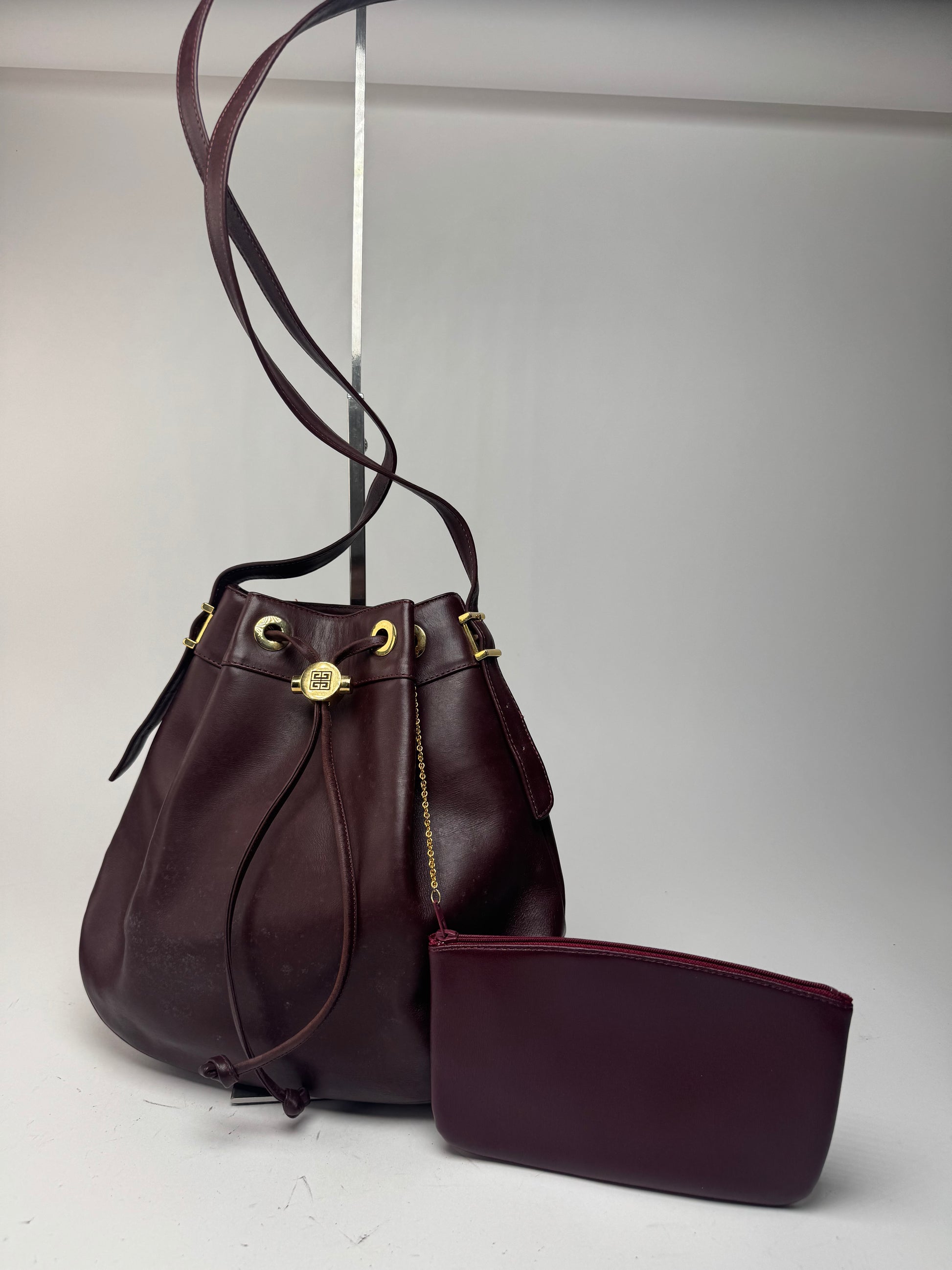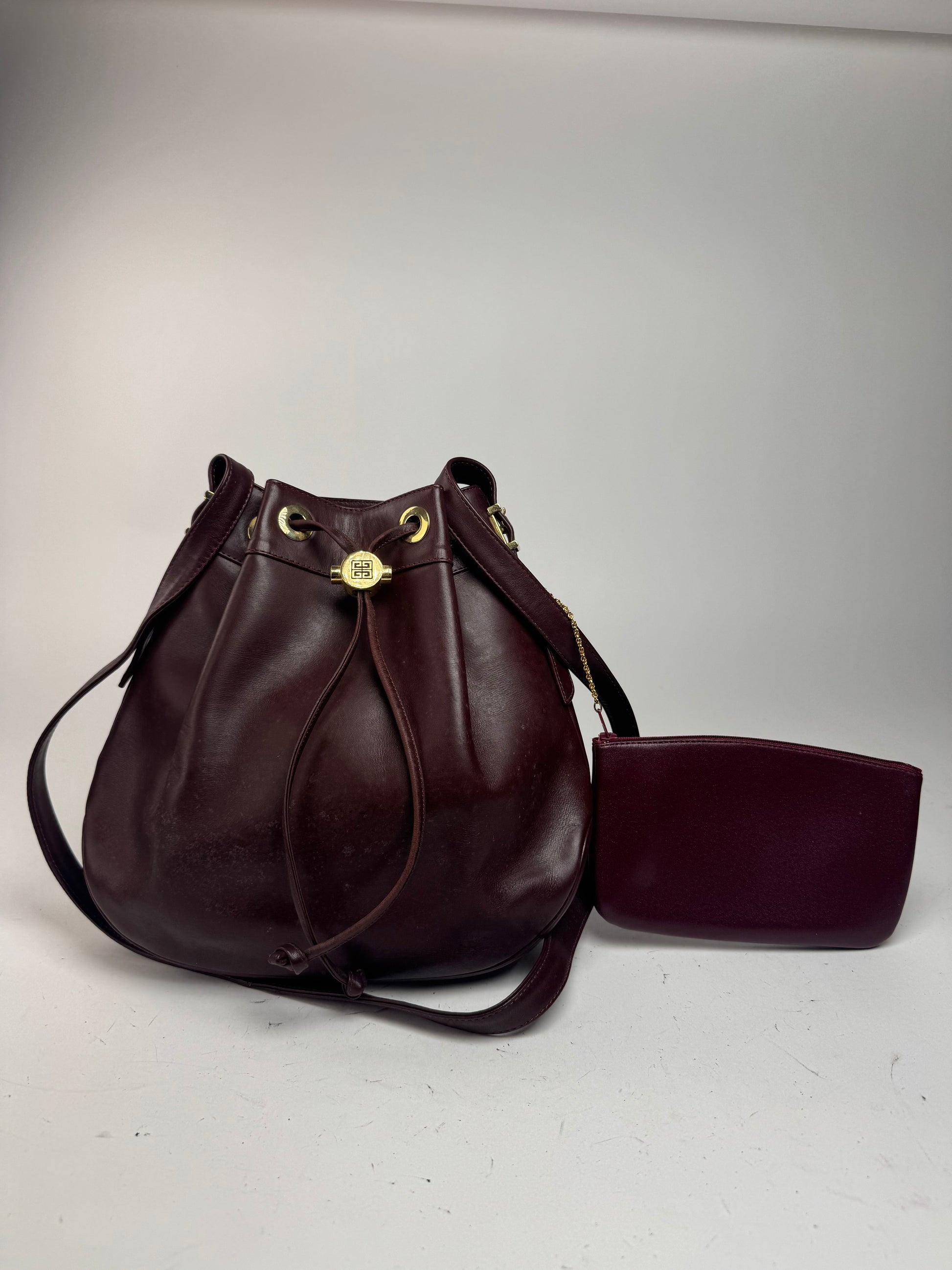 Sac seau GIVENCHY en cuir vintage. Cet élégant sac seau est confectionné en cuir lilas et doté d'une bandoulière réglable, d'un cordon de serrage avec un bouchon en acier doré gravé du logo Givenchy, ainsi que d'une mini-pochette assortie amovible sur une chaîne dorée. L'emblématique emblème Givenchy, un « G » en miroir formant une clé grecque, symbolise la symétrie et a été introduit au début des années 2000 pour incarner l'identité minimaliste de la marque.