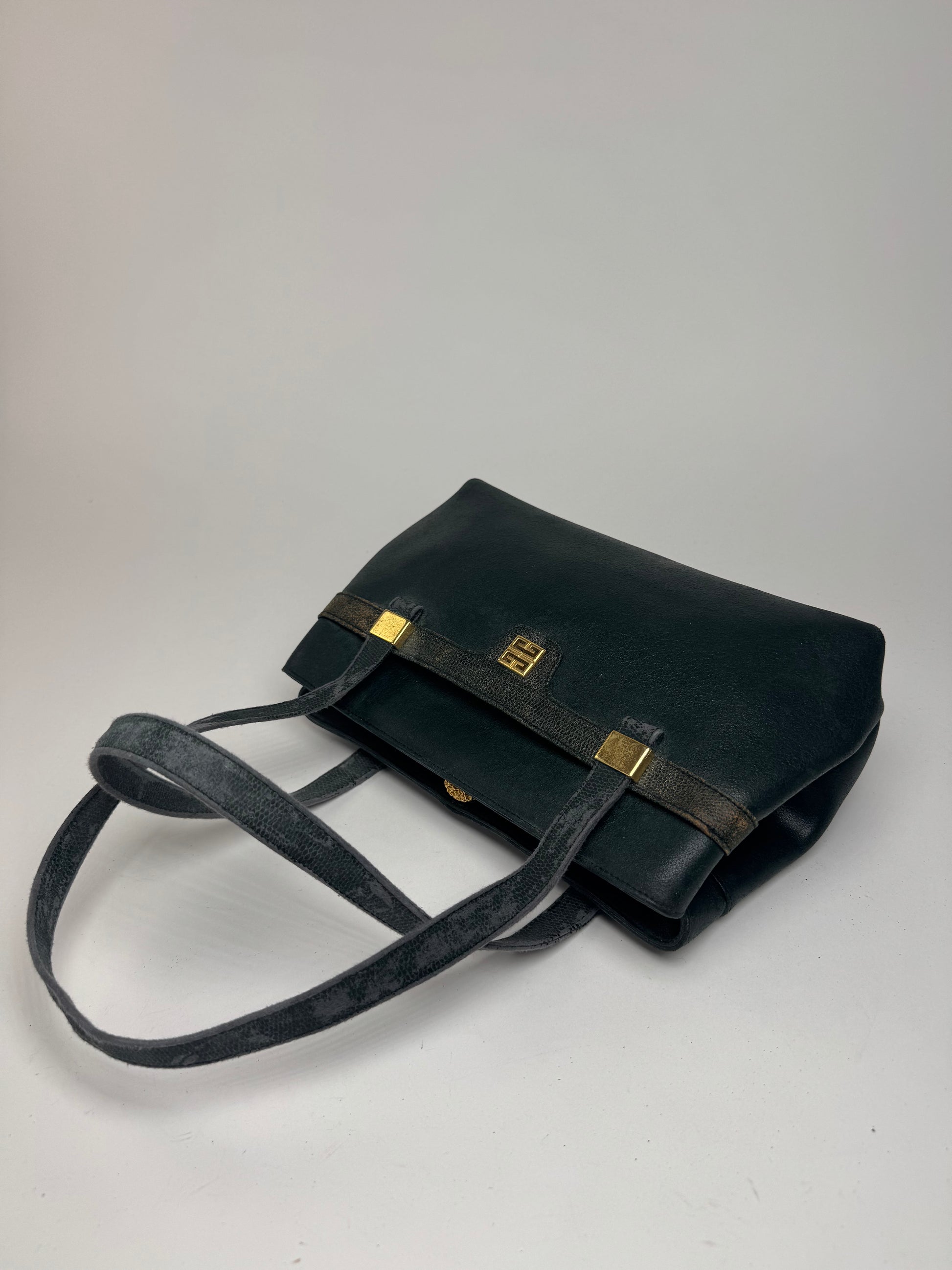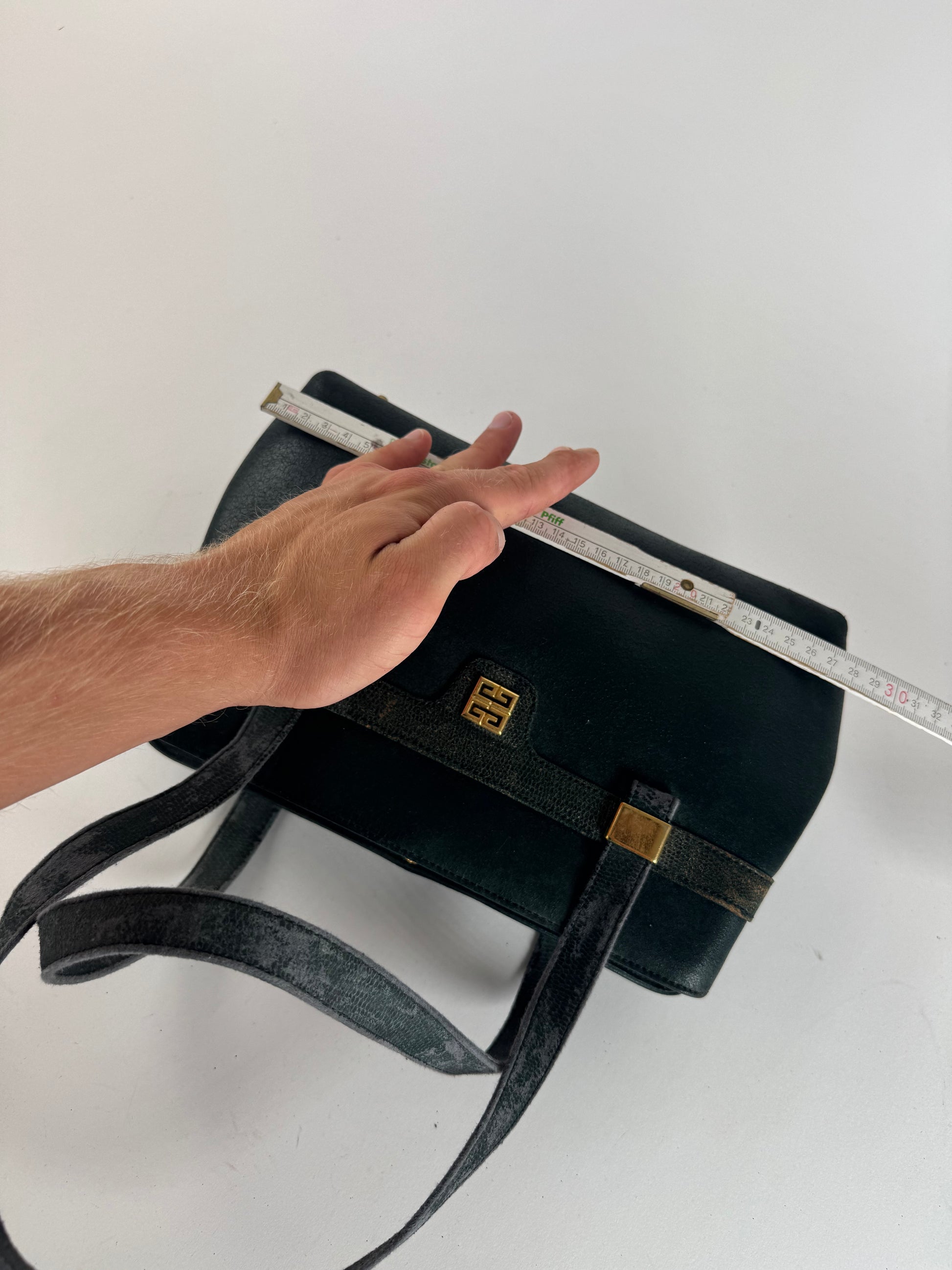 Ce sac à main chic est finement confectionné en cuir vert foncé à la texture strié et texturée. Sur le devant, on retrouve l'emblématique logo Givenchy 4G en acier doré, apparu dans les années 1970 comme un symbole audacieux de l'élégance structurée et de l'identité graphique de la maison. Doté d'un rabat et de deux longues anses, il est facile à porter à l'épaule.