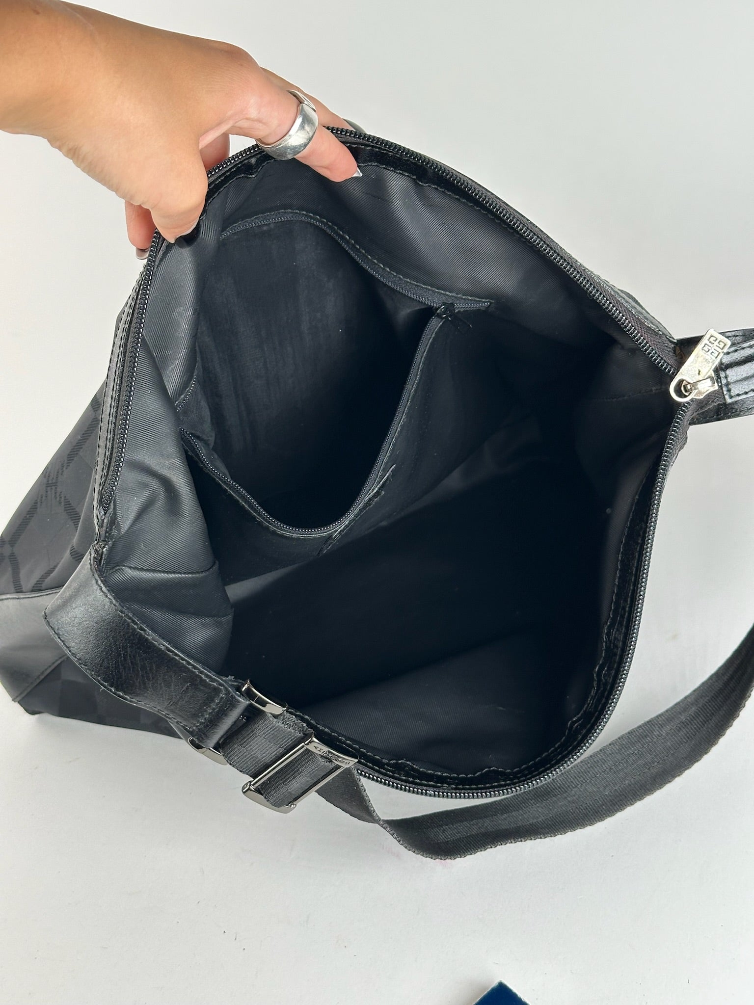Cet élégant sac bandoulière est confectionné en toile noire ornée du monogramme emblématique de Givenchy, apparu dans les années 1970 comme un symbole graphique audacieux de l'identité parisienne moderne de la maison. Il est doté d'une finition en cuir noir et d'une bandoulière réglable avec finitions en acier argenté. Il se ferme par une fermeture éclair sur le dessus et s'ouvre sur un intérieur doublé de polyester noir.