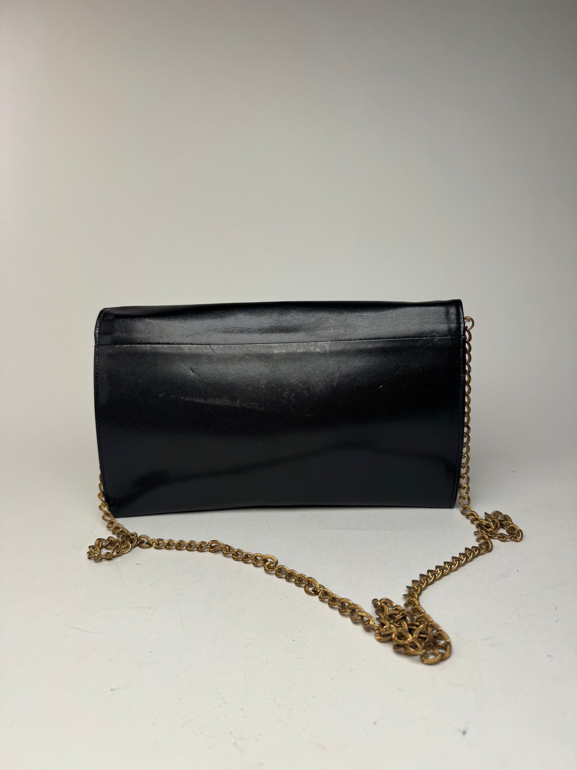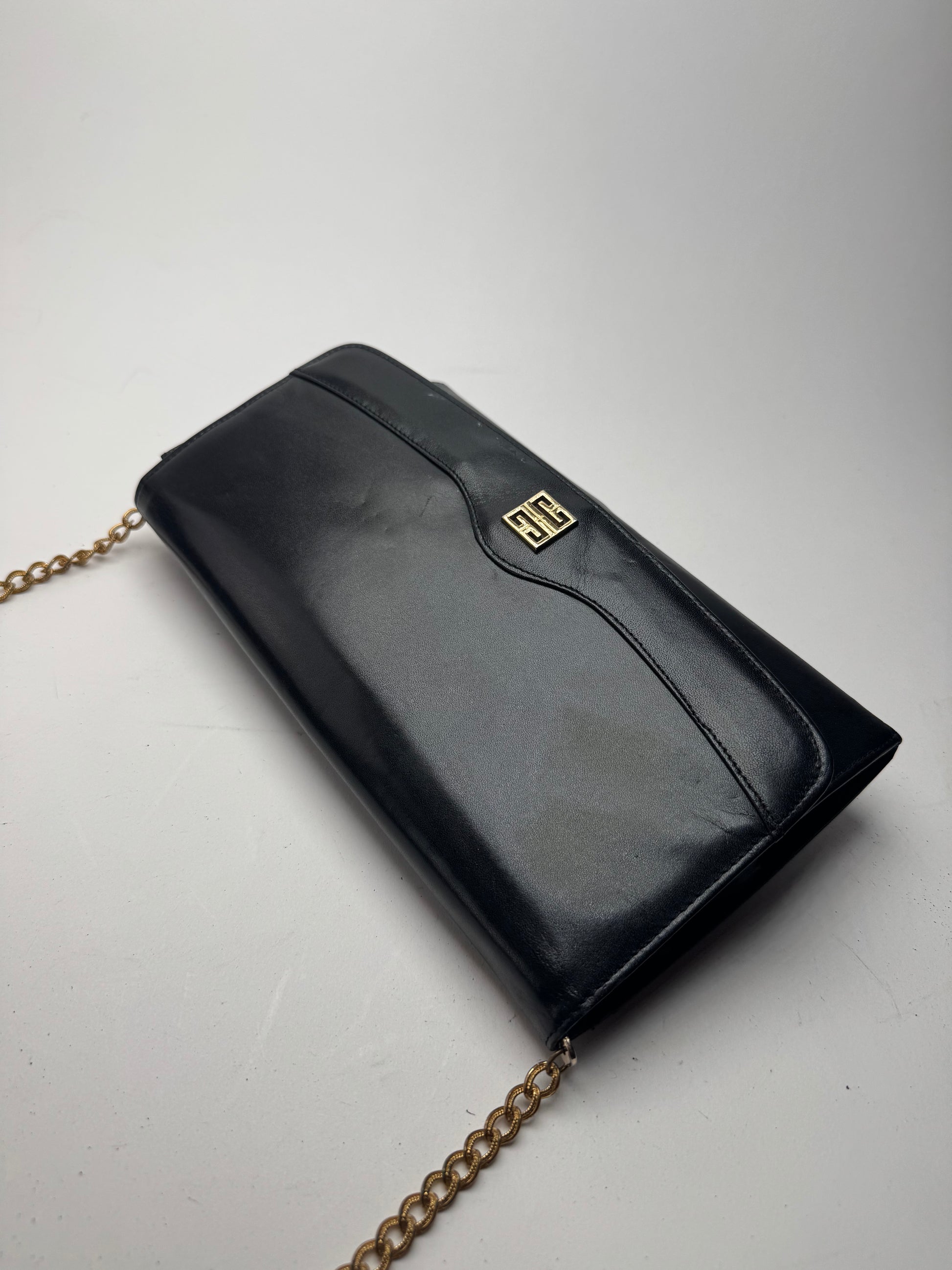 Sac bandoulière GIVENCHY Vintage Verni. Ce sac bandoulière unisexe vintage est finement confectionné en cuir verni noir et arbore un logo Givenchy en acier doré sur le devant. Il est doté d'une bandoulière chaîne en acier doré et d'une fermeture aimantée. Il s'ouvre sur une doublure intérieure rouge.