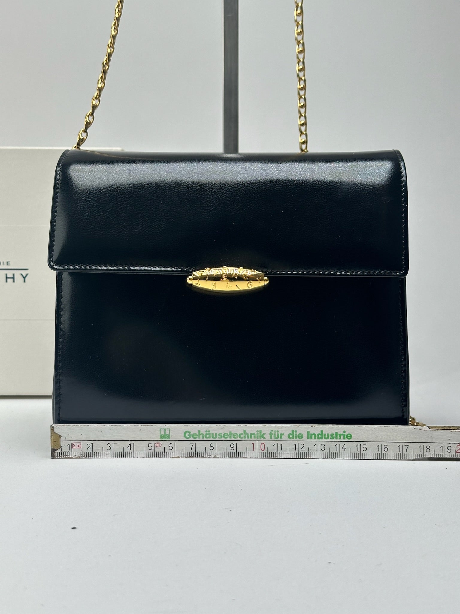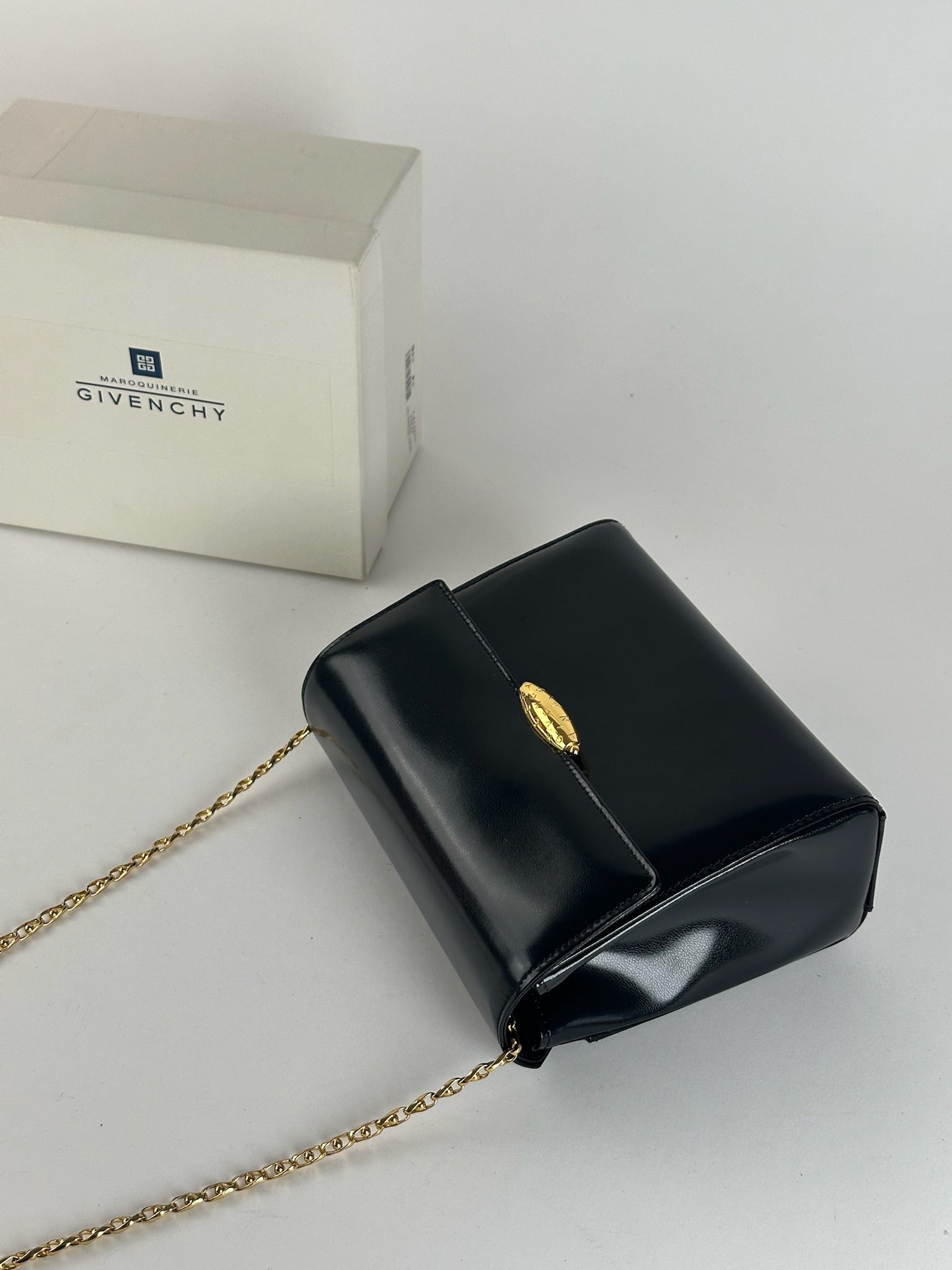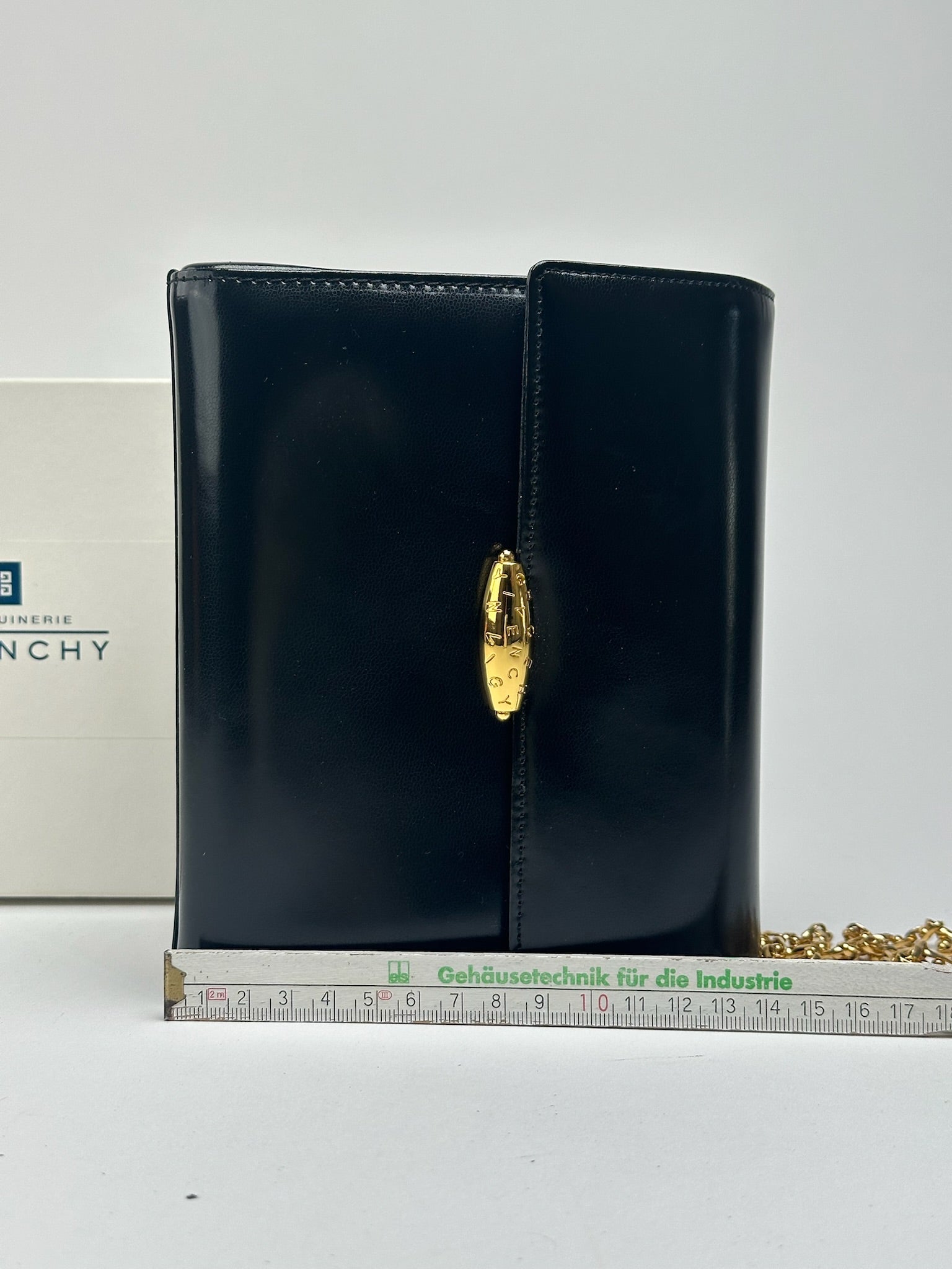 Sac bandoulière GIVENCHY Vintage en cuir verni. Cet élégant sac à main est finement confectionné en cuir verni noir avec des finitions en toile noire. Il est doté d'une bandoulière chaîne en acier doré qui peut se porter à l'épaule ou se transformer en poignée supérieure en ajustant la bandoulière. Il se ferme grâce à un rabat aimanté et offre une silhouette chic et structurée.