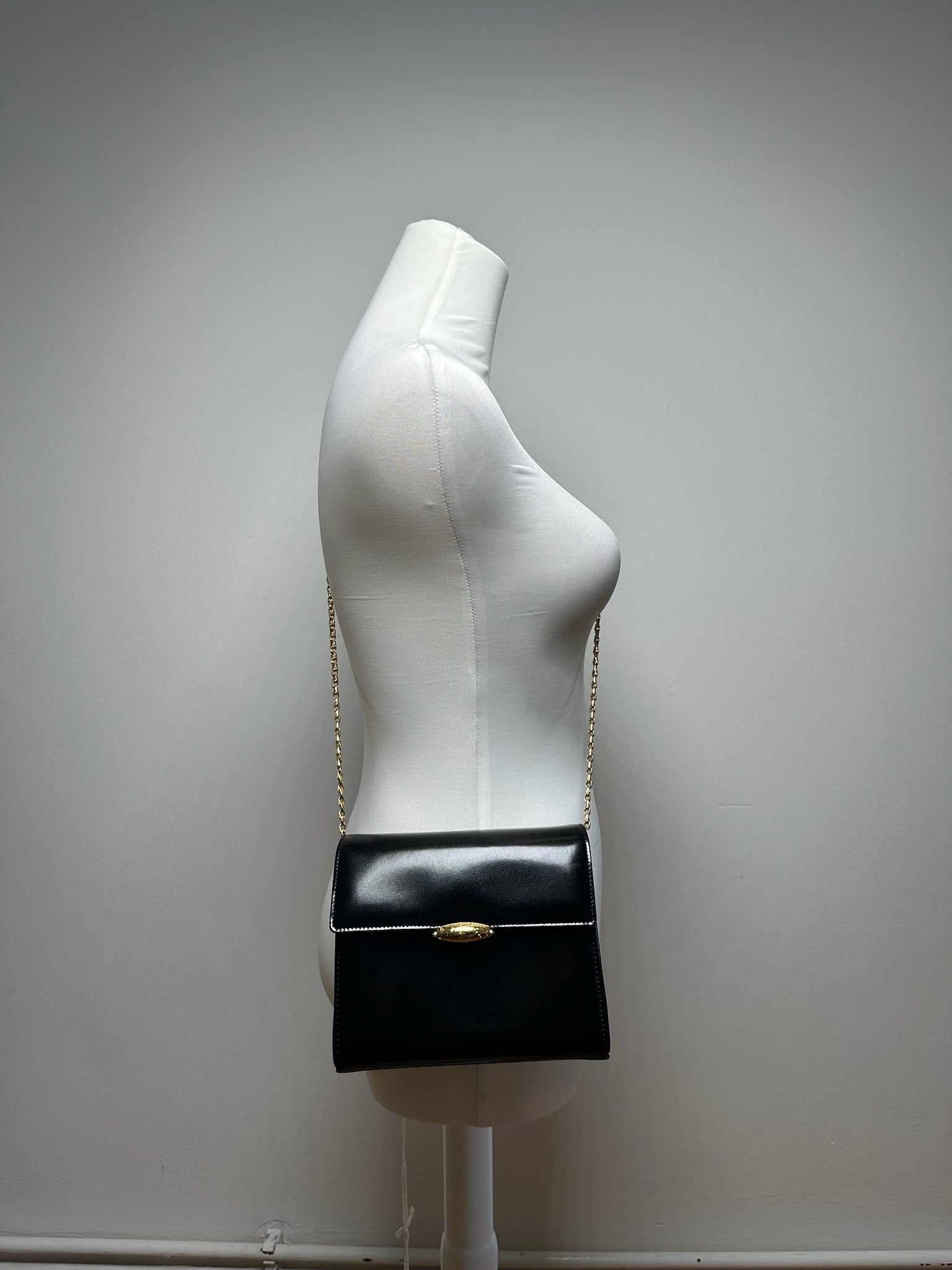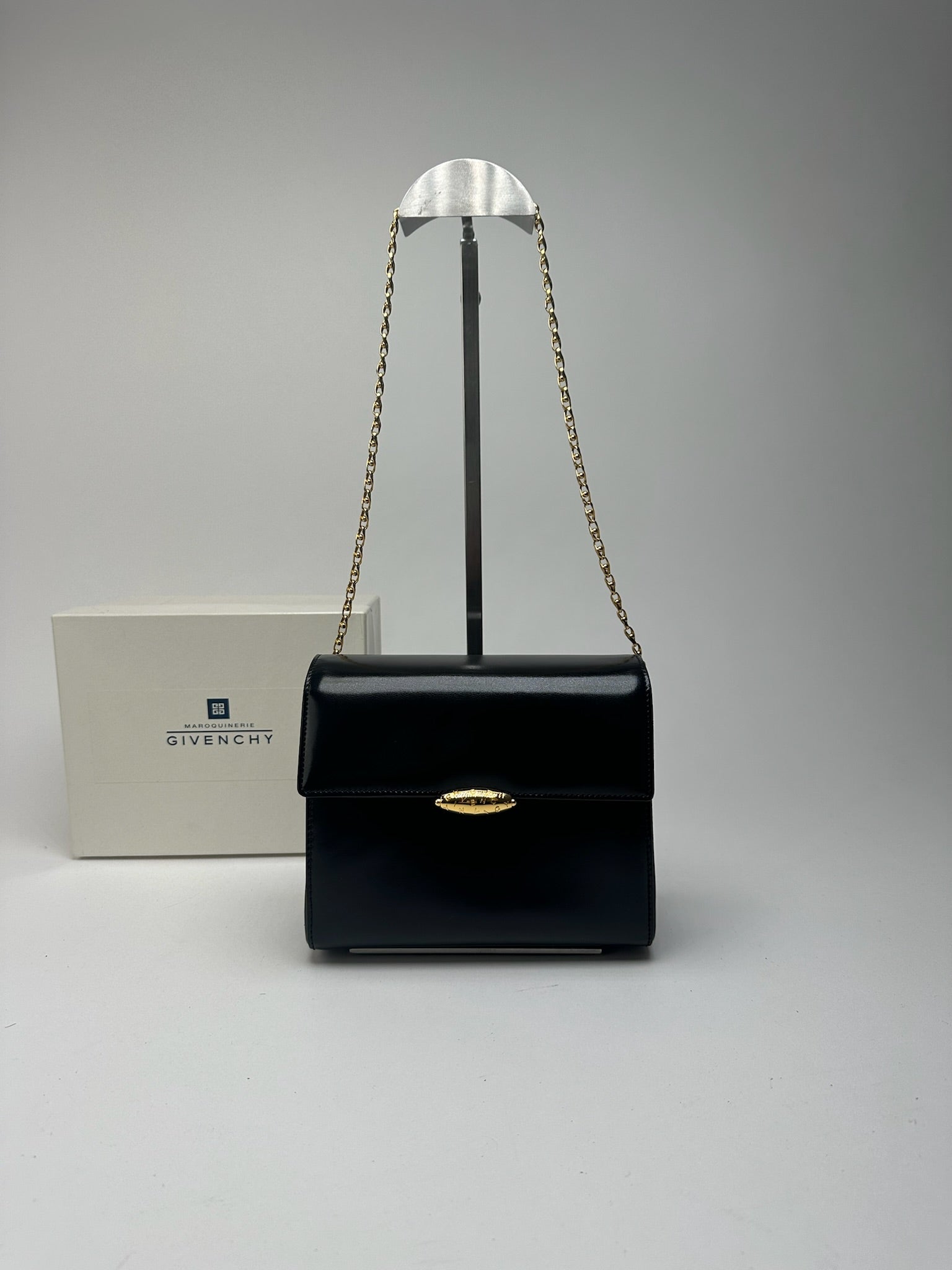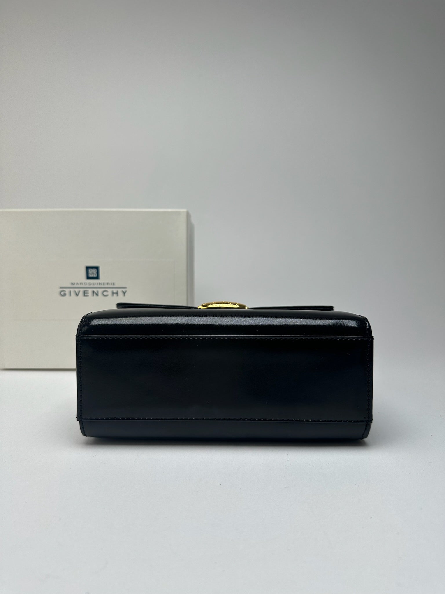 Sac bandoulière GIVENCHY Vintage en cuir verni. Cet élégant sac à main est finement confectionné en cuir verni noir avec des finitions en toile noire. Il est doté d'une bandoulière chaîne en acier doré qui peut se porter à l'épaule ou se transformer en poignée supérieure en ajustant la bandoulière. Il se ferme grâce à un rabat aimanté et offre une silhouette chic et structurée.