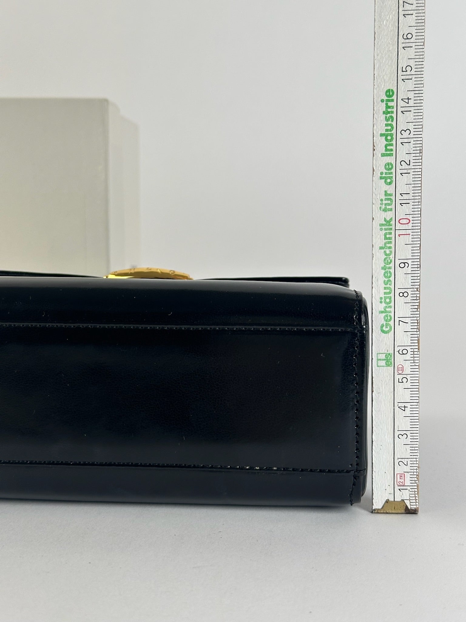État : L'extérieur en cuir verni est brillant et bien conservé, avec une légère usure du matériau. La garniture en toile et les accessoires dorés présentent de légères traces d'utilisation, mais restent en excellent état.