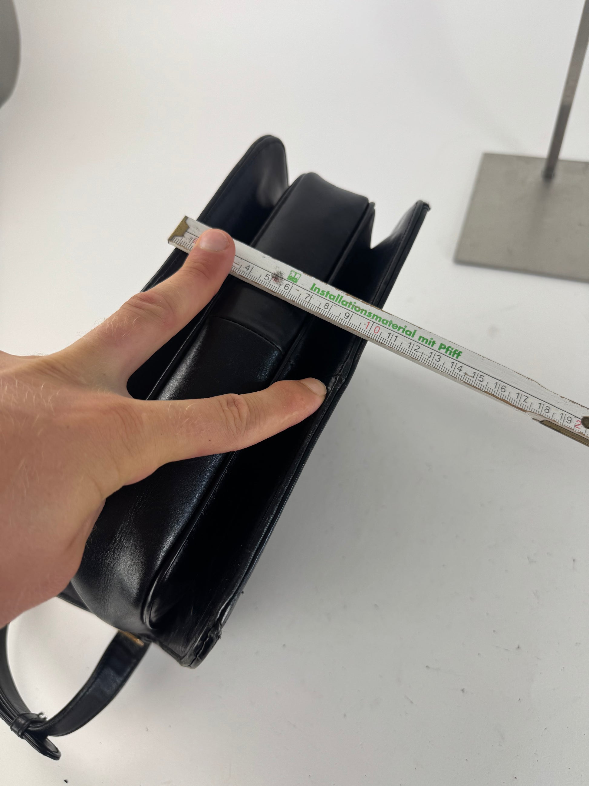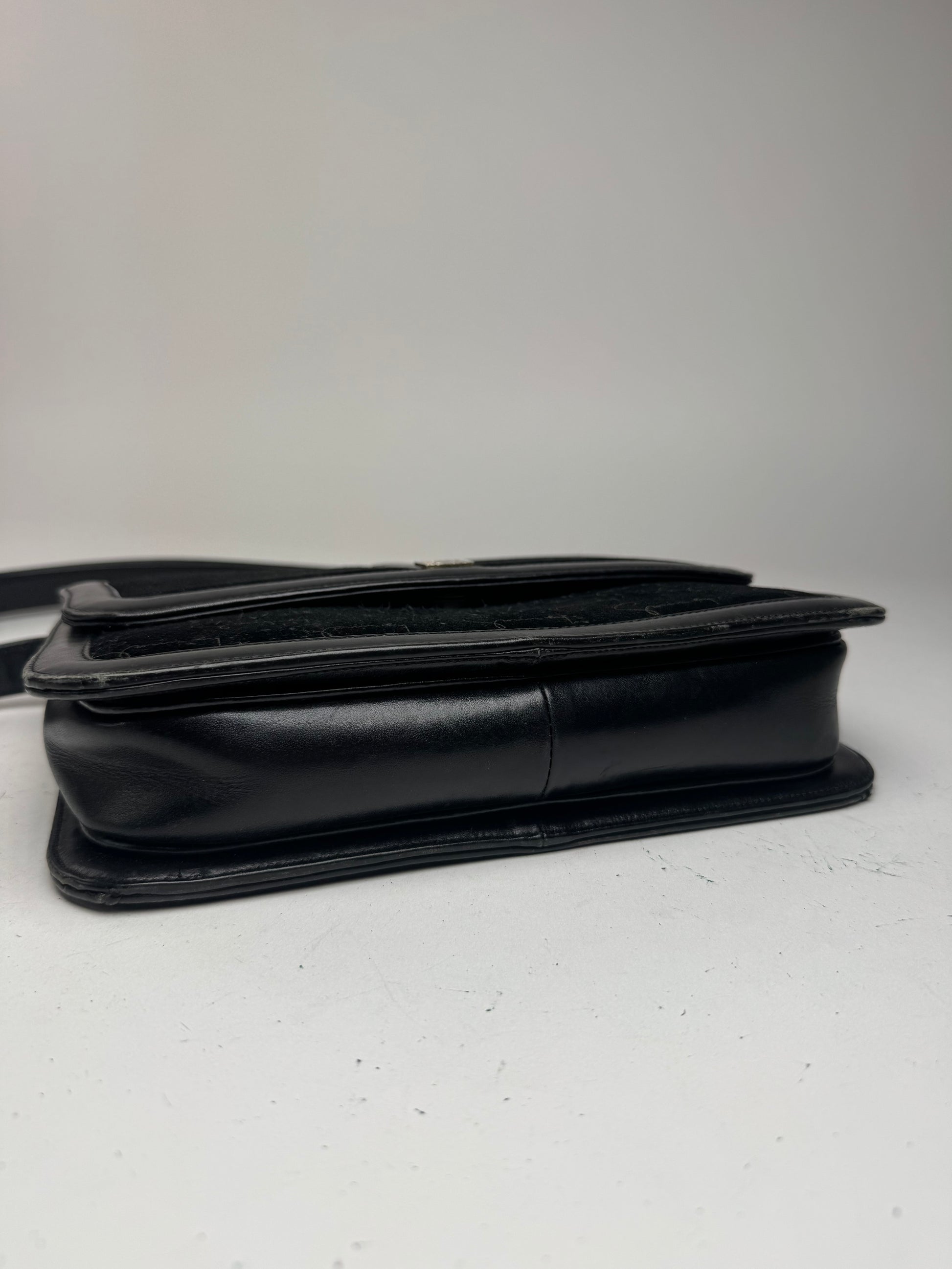 État : L'extérieur en cuir et laine est en très bon état, avec de légères traces d'usure. La sangle est réglable et fonctionnelle. Les finitions métalliques sont brillantes et présentent de légères rayures. La doublure intérieure en cuir présente quelques dommages, mais elle est globalement propre et utilisable.