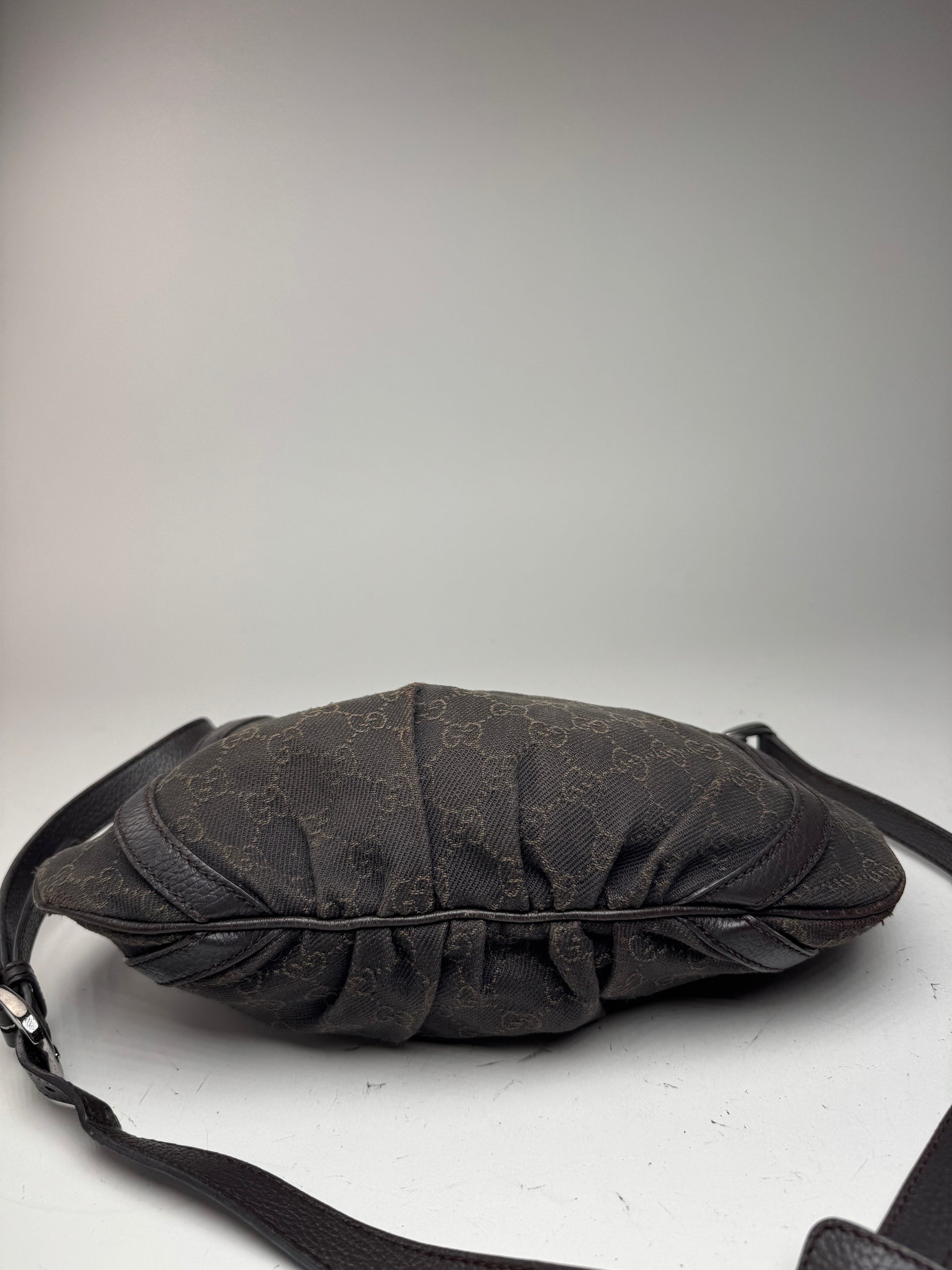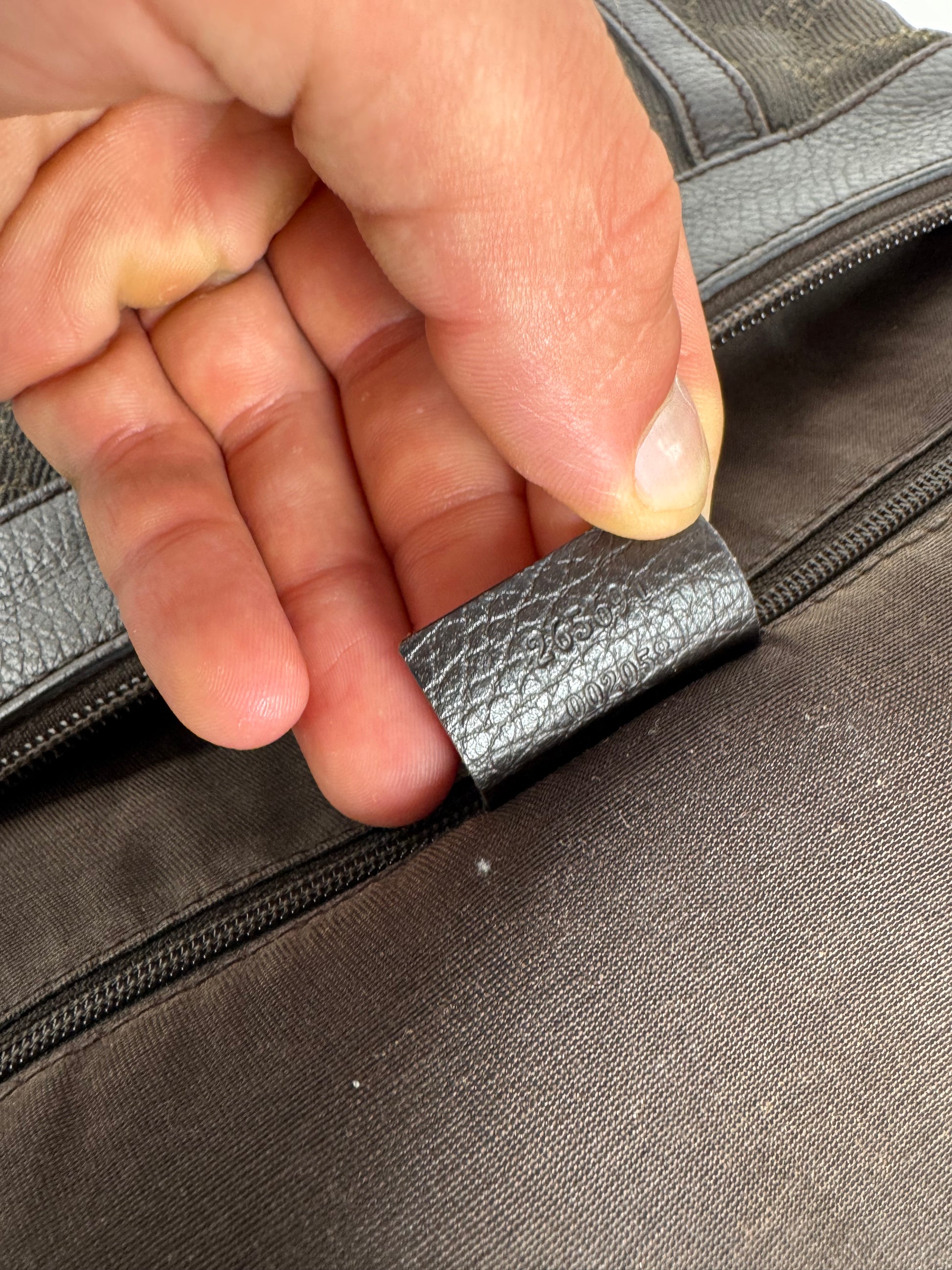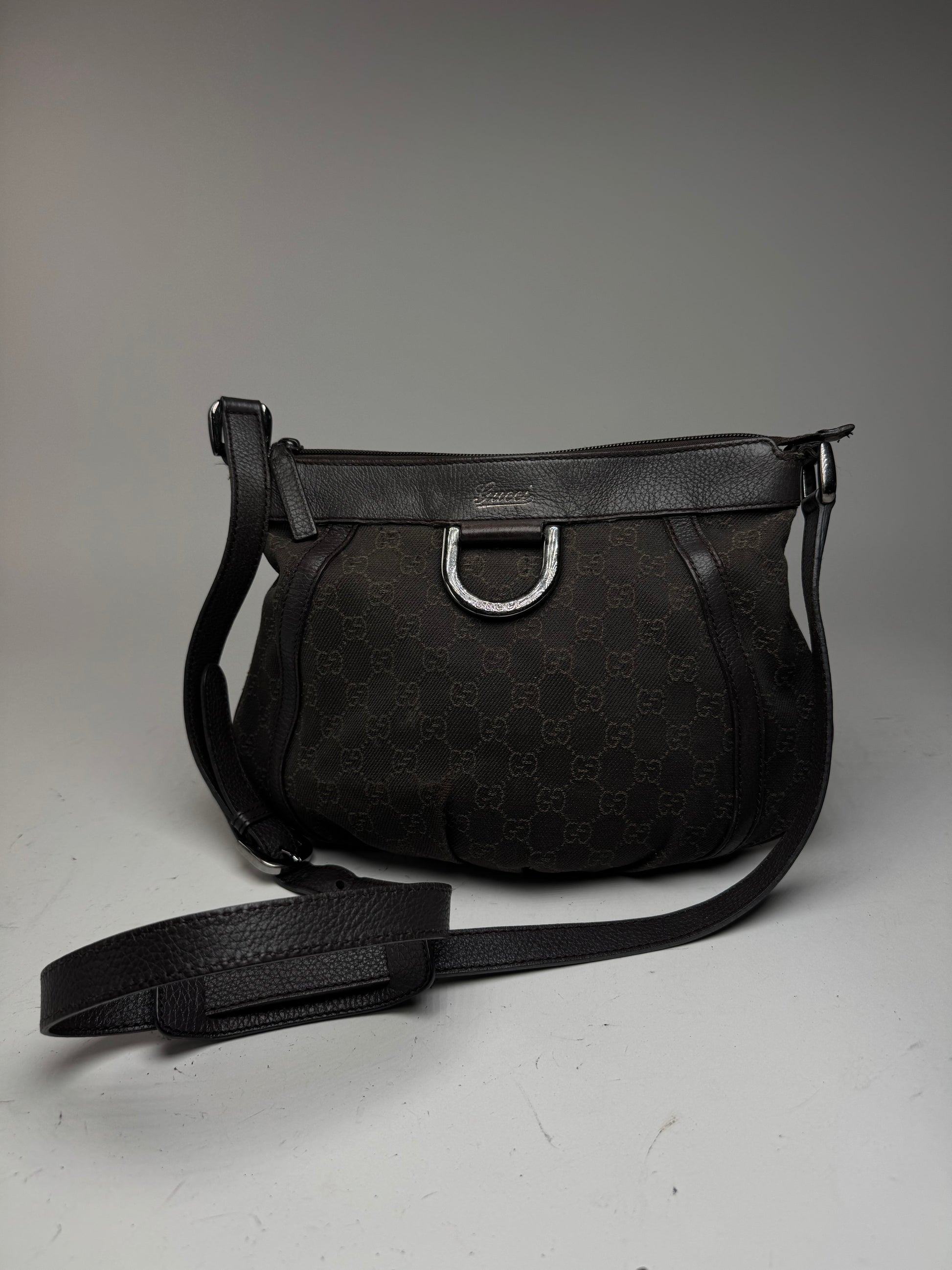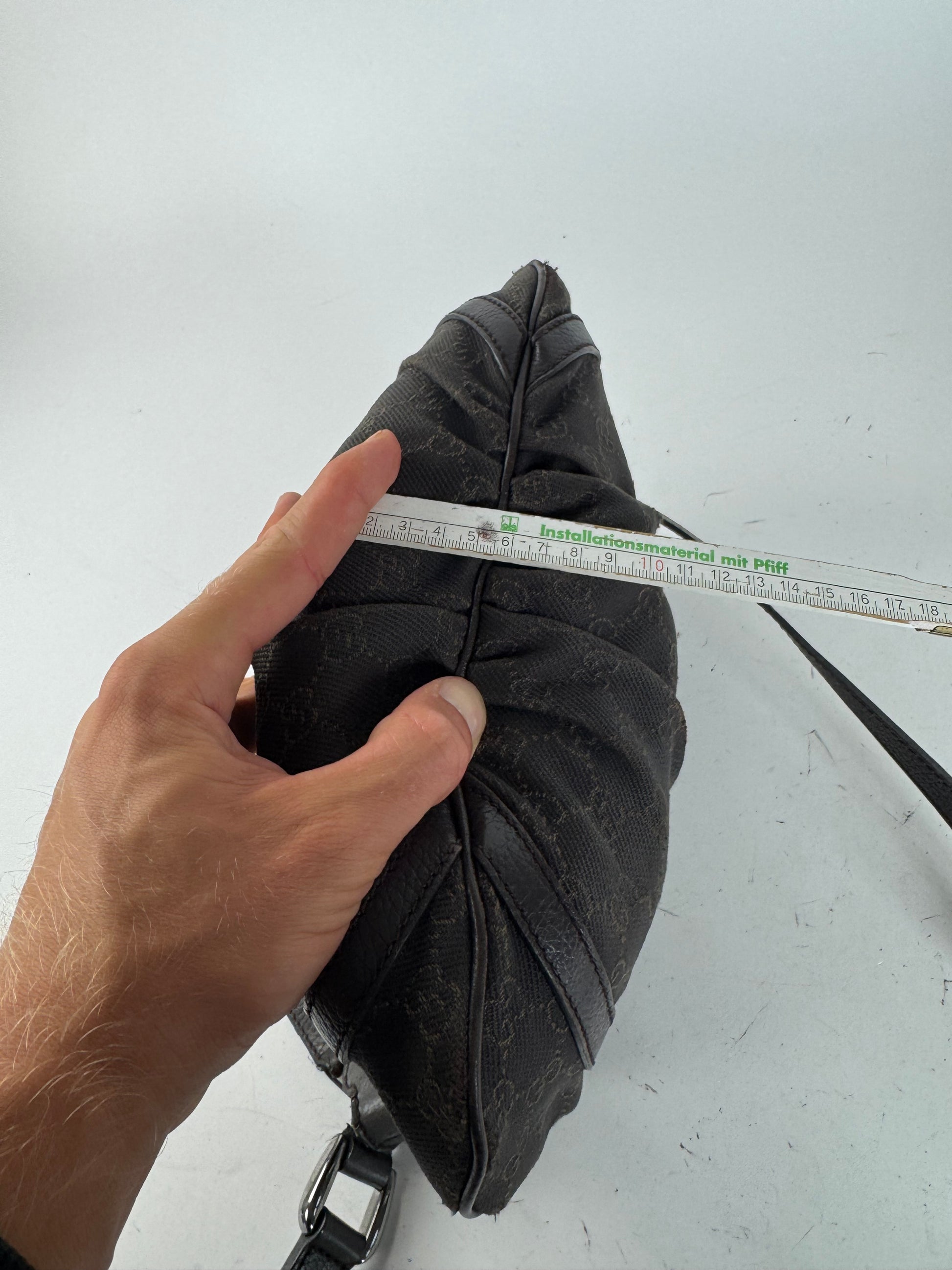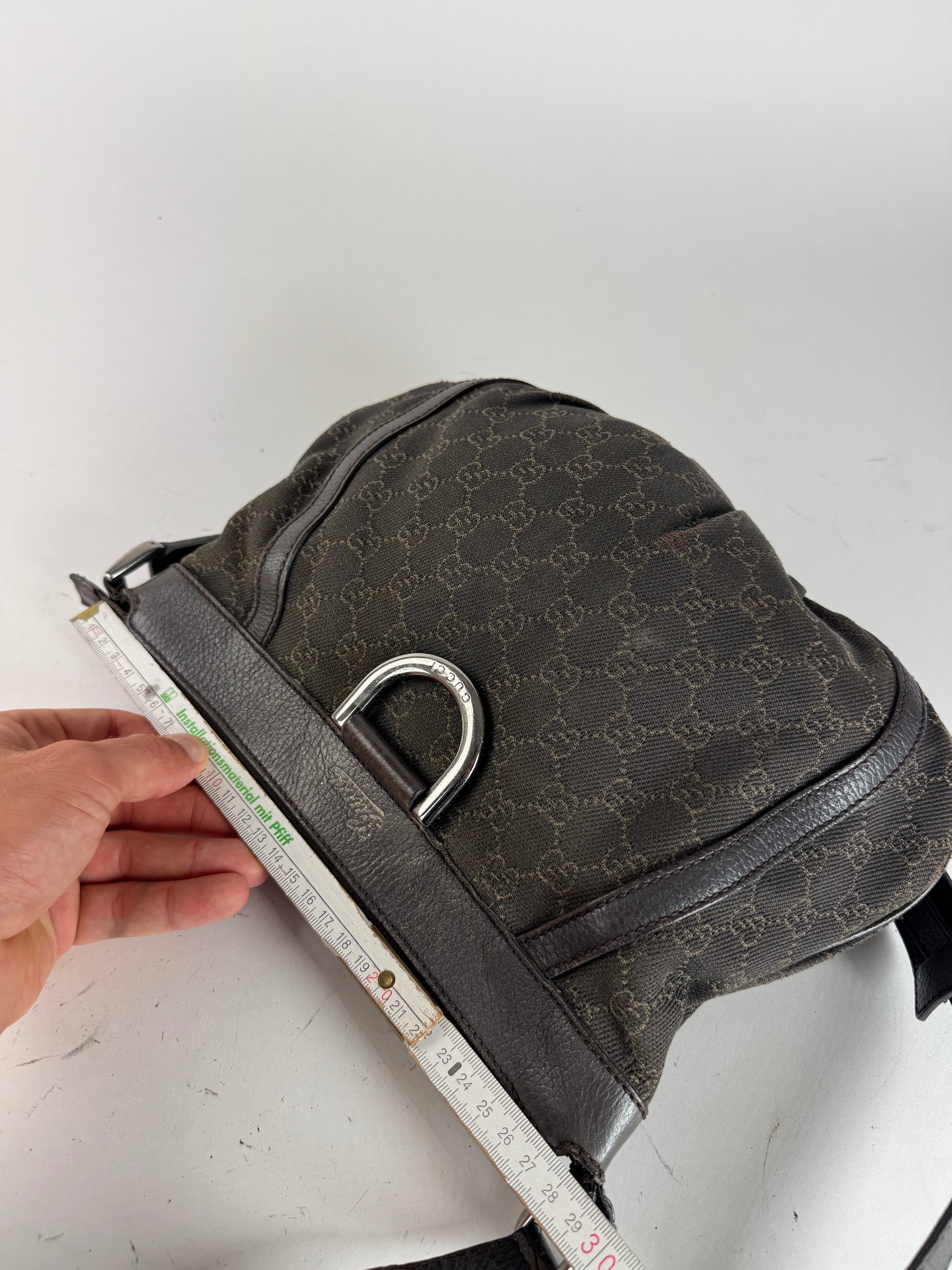 Sac bandoulière GUCCI Vintage D-Link Monogram. Ce sac unisexe est confectionné en toile monogrammée GG noire et arbore des finitions en cuir marron foncé ainsi qu'une bandoulière réglable. Les finitions en acier argenté apportent une touche d'élégance à sa silhouette structurée. La ligne D-Link est réputée pour son design minimaliste et fonctionnel, avec un clin d'œil subtil à l'héritage équestre de Gucci grâce à ses discrets maillons métalliques.