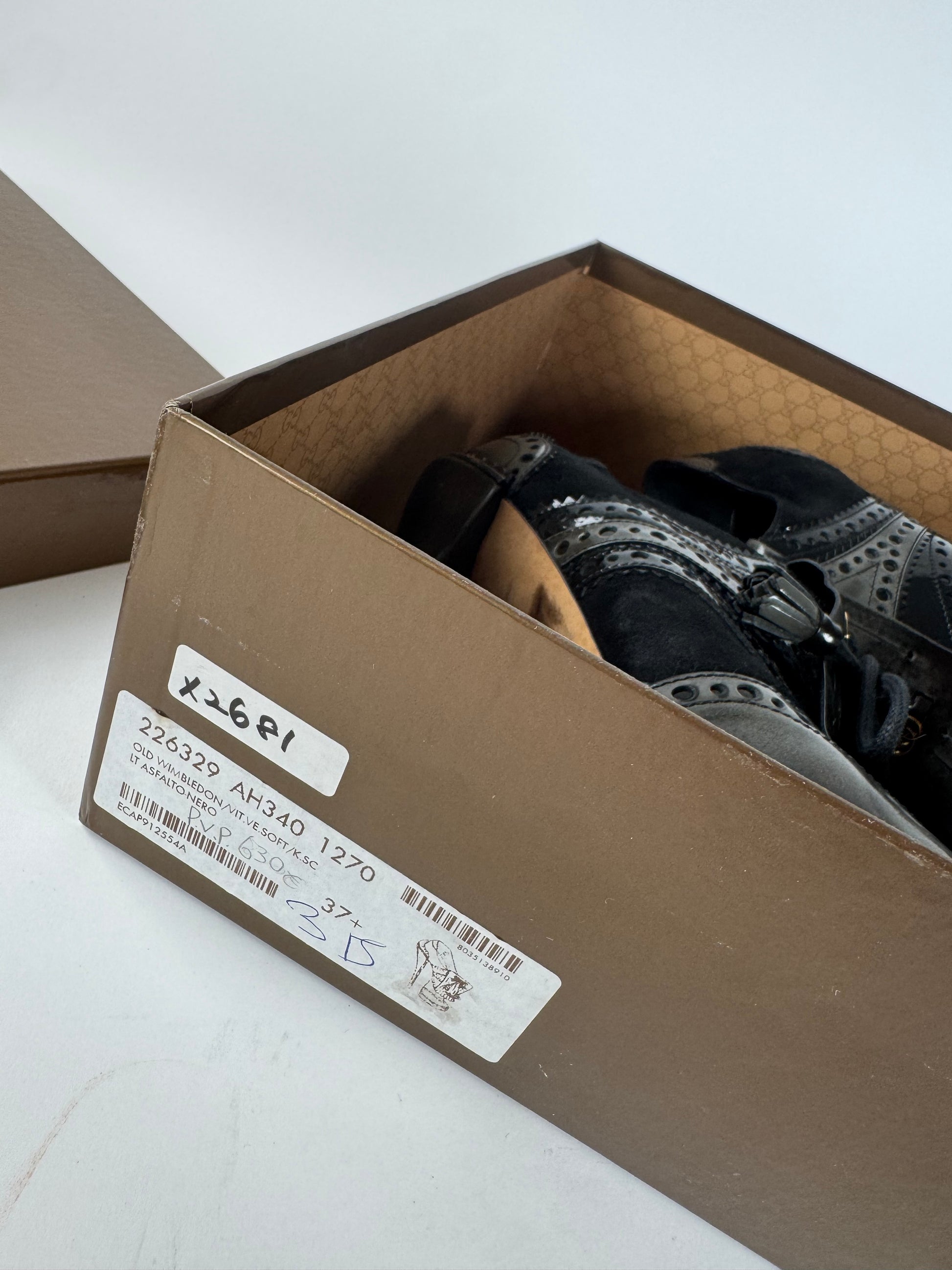 GUCCI Old Wimbledon Vintage Heeled Boots. These chic vintage heeled boots are finely crafted in a Budapest-inspired design combining black patent leather with black suede. The lace-up silhouette is finished with a polished gold-tone GG application at the front and a durable plastic sole. The Old Wimbledon style reflects Gucci’s longstanding love for classic menswear-inspired detailing, reinterpreted into bold, feminine footwear with a sleek high heel.