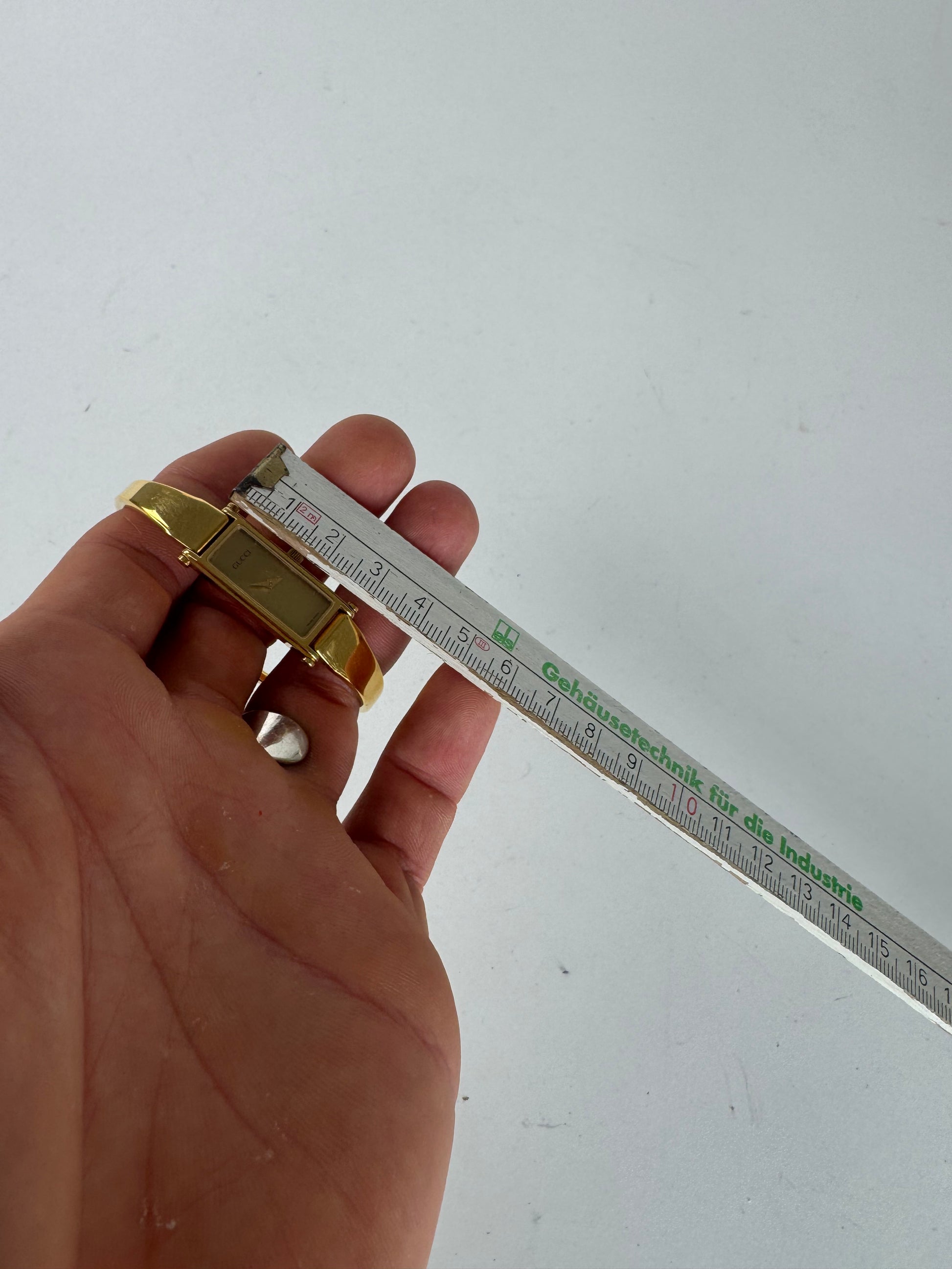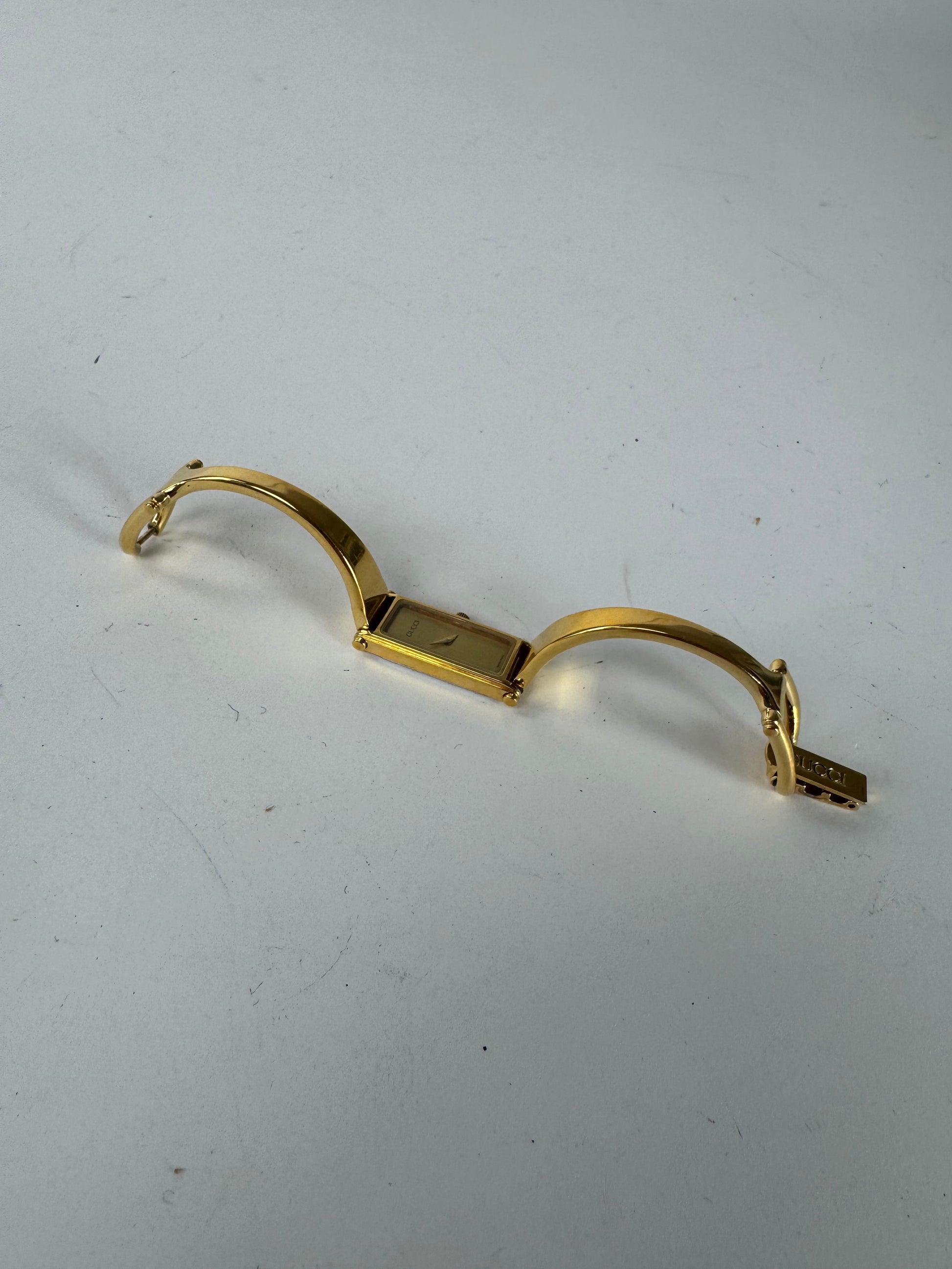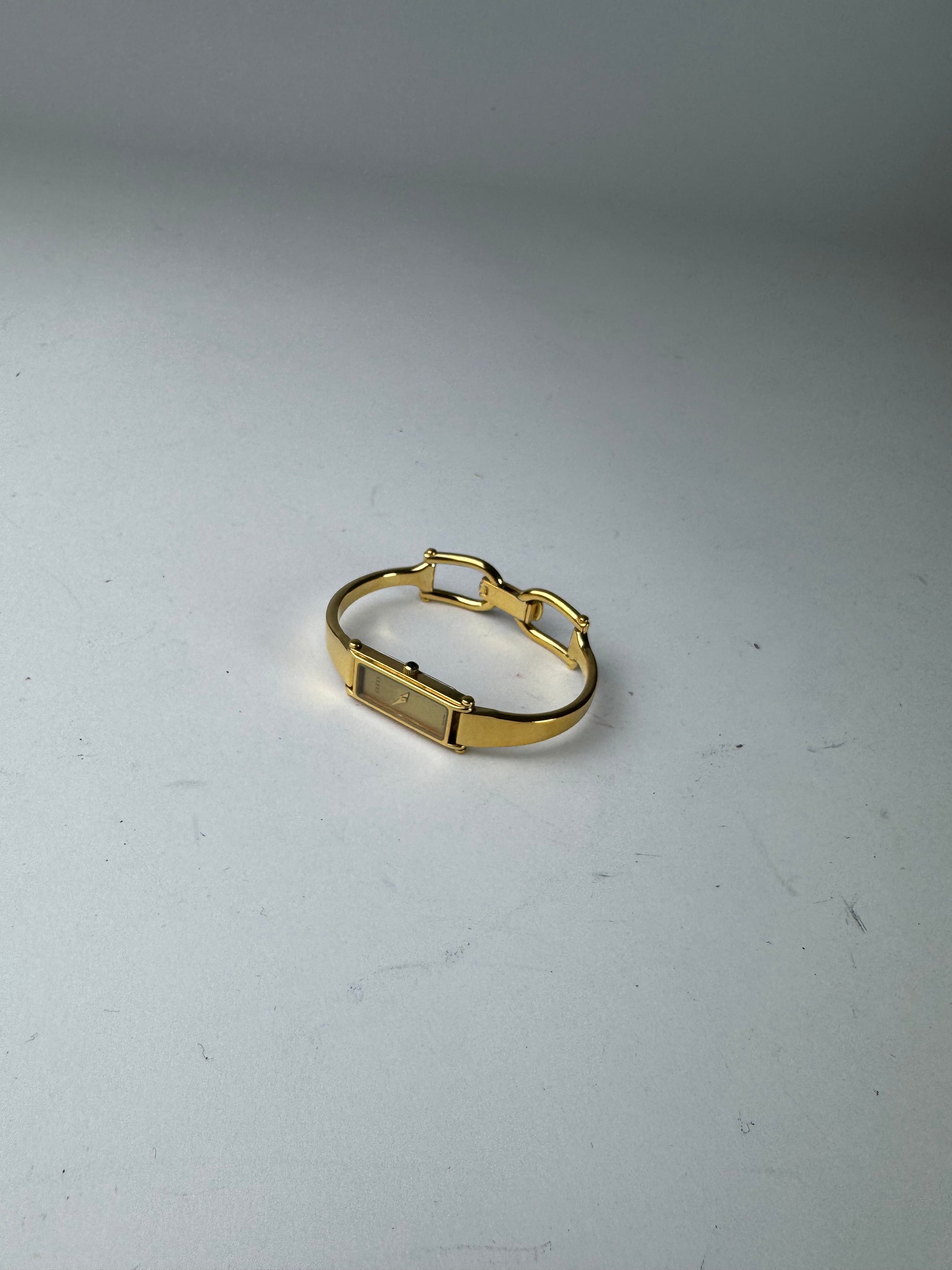 Montre Gucci Vintage Horsebit. Cette montre Gucci vintage Horsebit est fabriquée en acier inoxydable doré , avec un bracelet assorti, et arbore un cadran doré à l'élégance signature de la marque. De fabrication suisse , cette montre à quartz étanche offre une précision de chronométrage grâce à sa pile remplacée . Le dessous du boîtier a été remplacé , ce qui explique son bon état général.