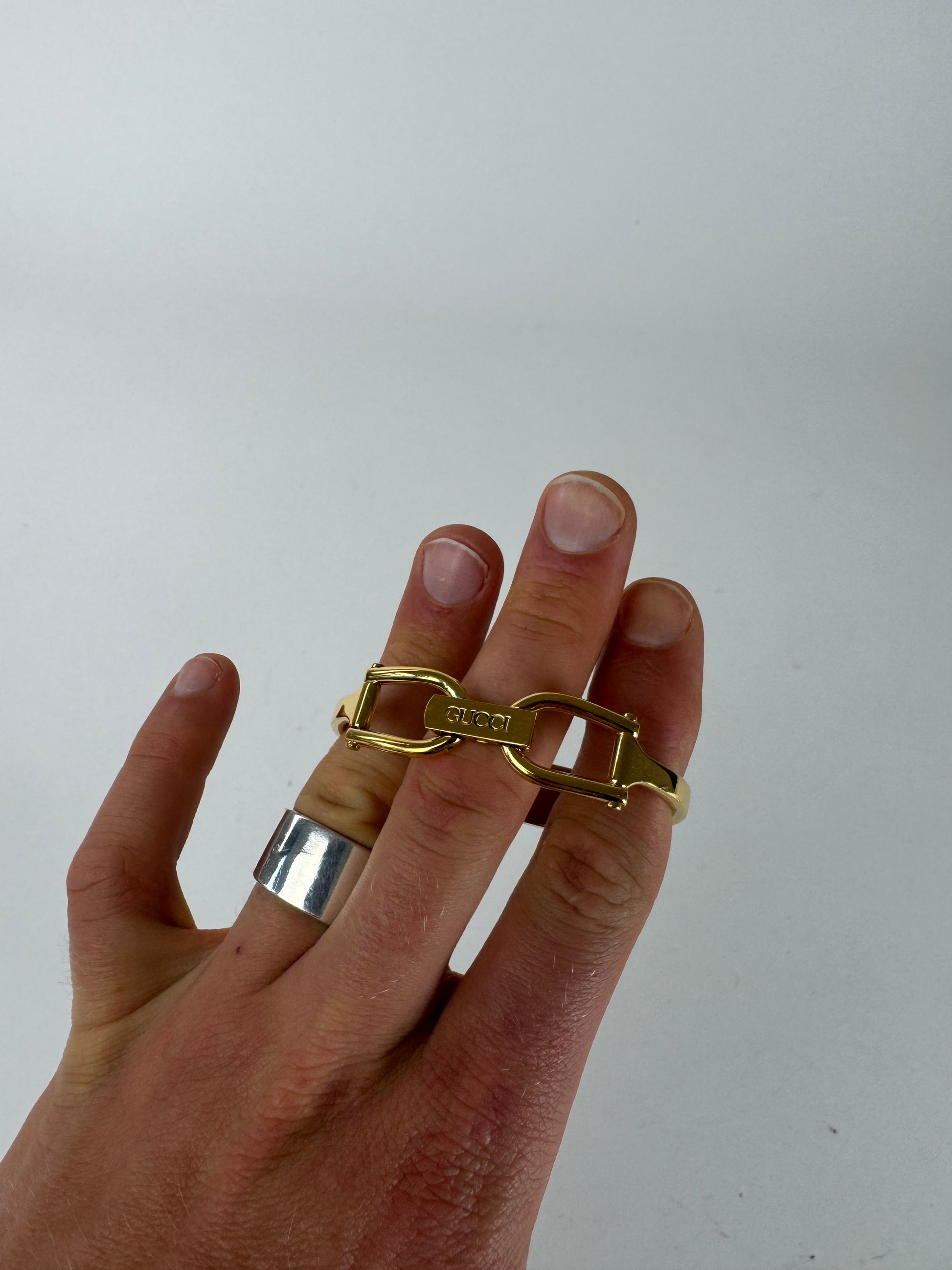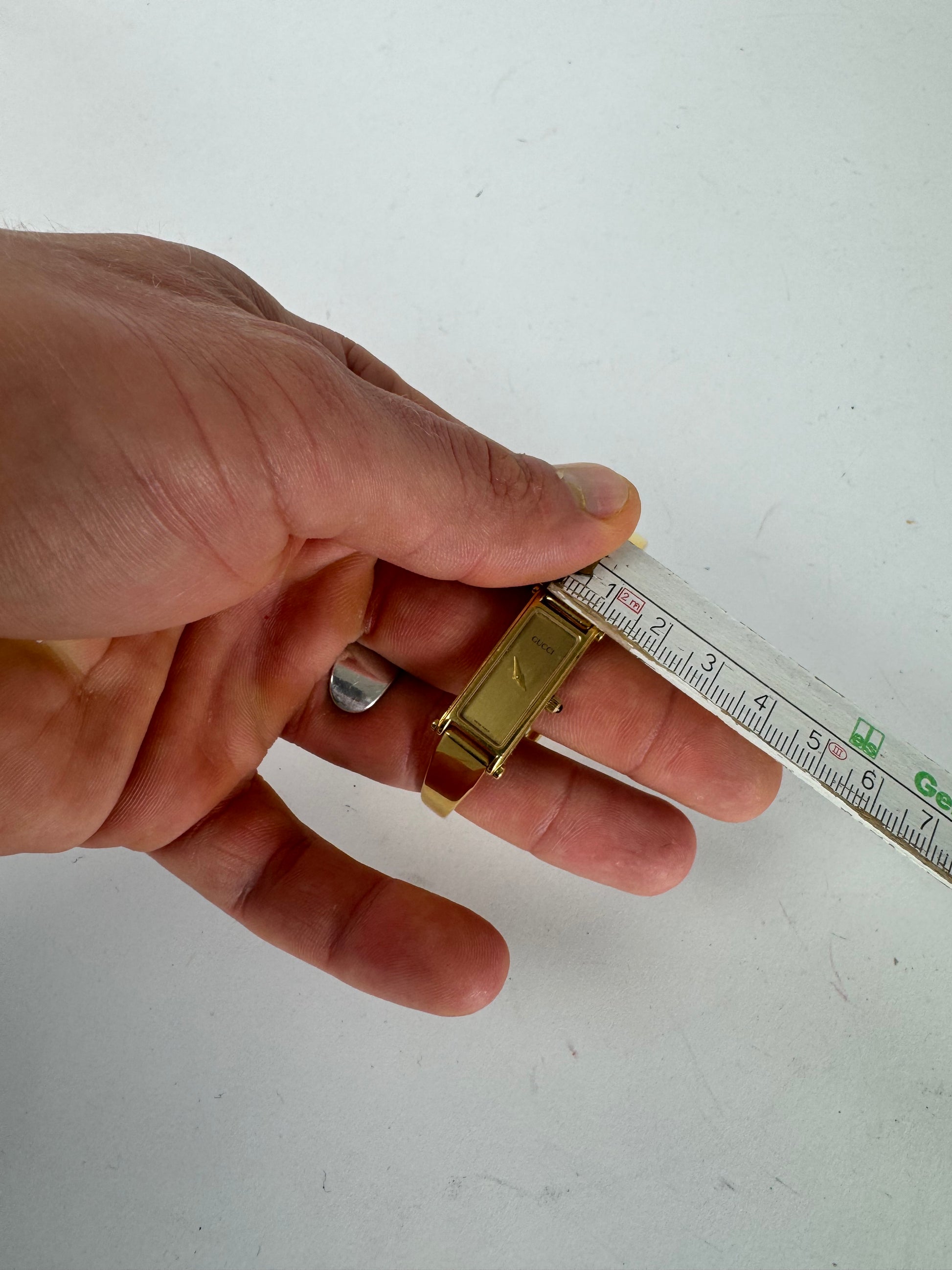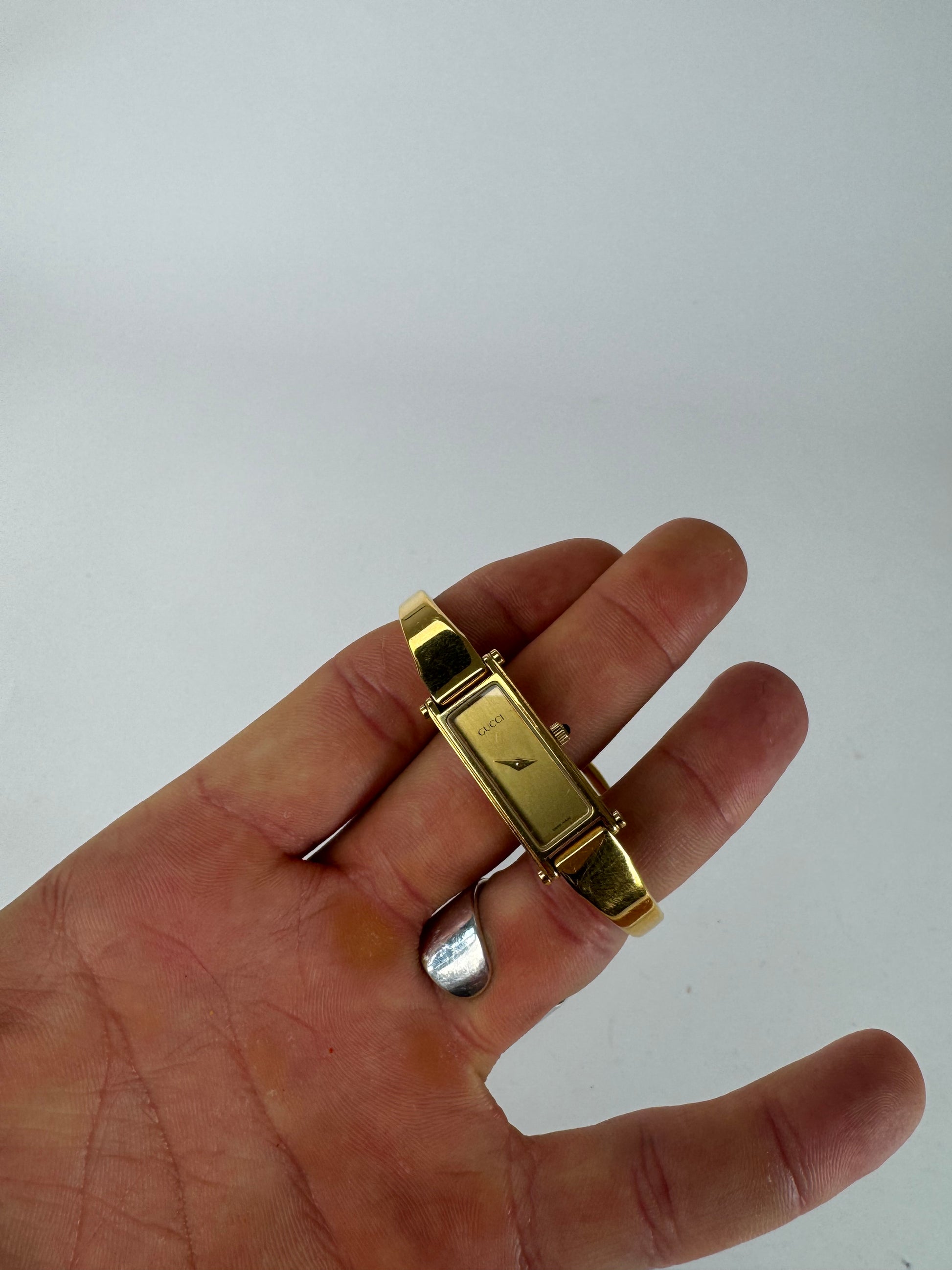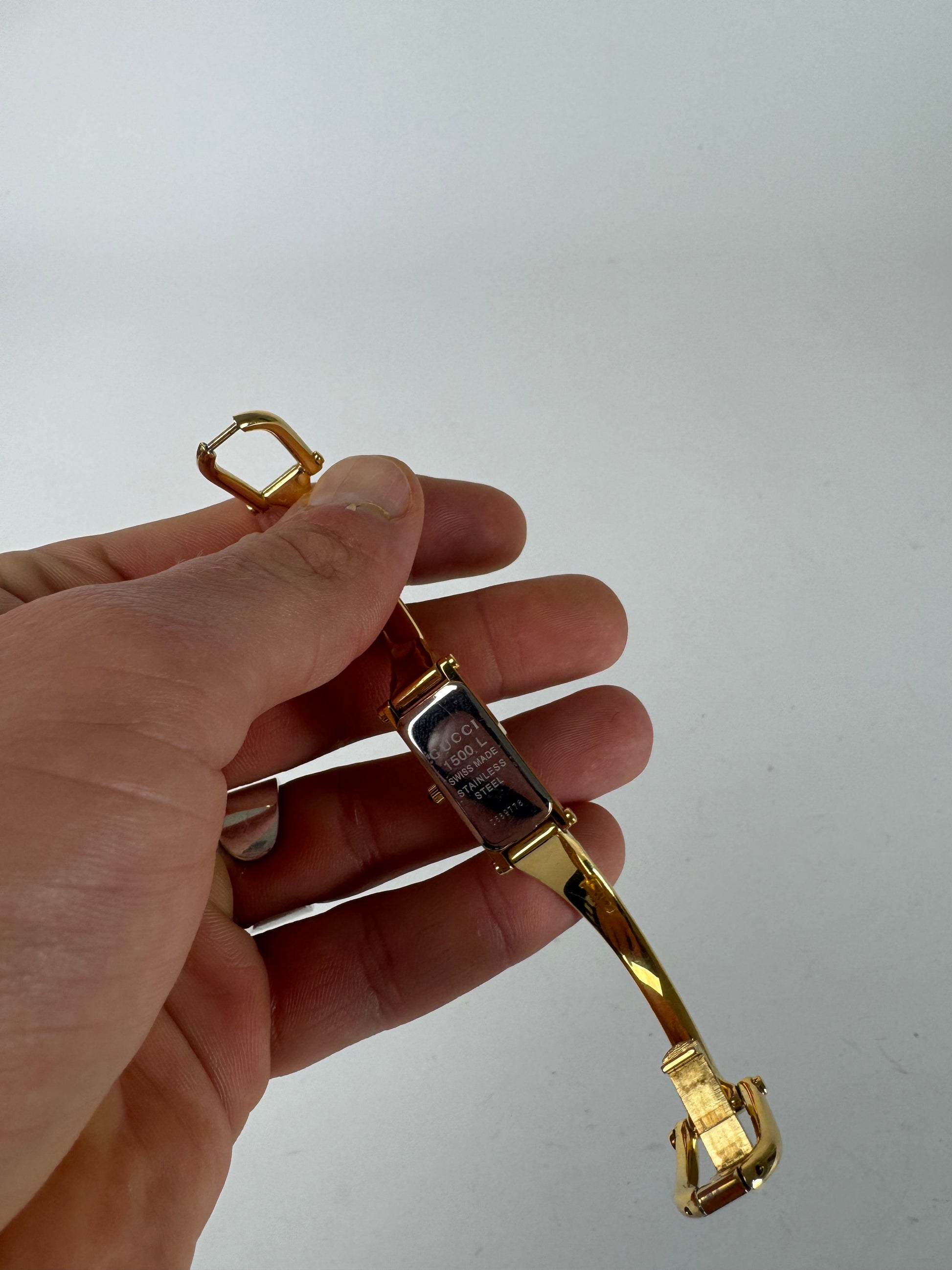 Montre Gucci Vintage Horsebit. Cette montre Gucci vintage Horsebit est fabriquée en acier inoxydable doré , avec un bracelet assorti, et arbore un cadran doré à l'élégance signature de la marque. De fabrication suisse , cette montre à quartz étanche offre une précision de chronométrage grâce à sa pile remplacée . Le dessous du boîtier a été remplacé , ce qui explique son bon état général.