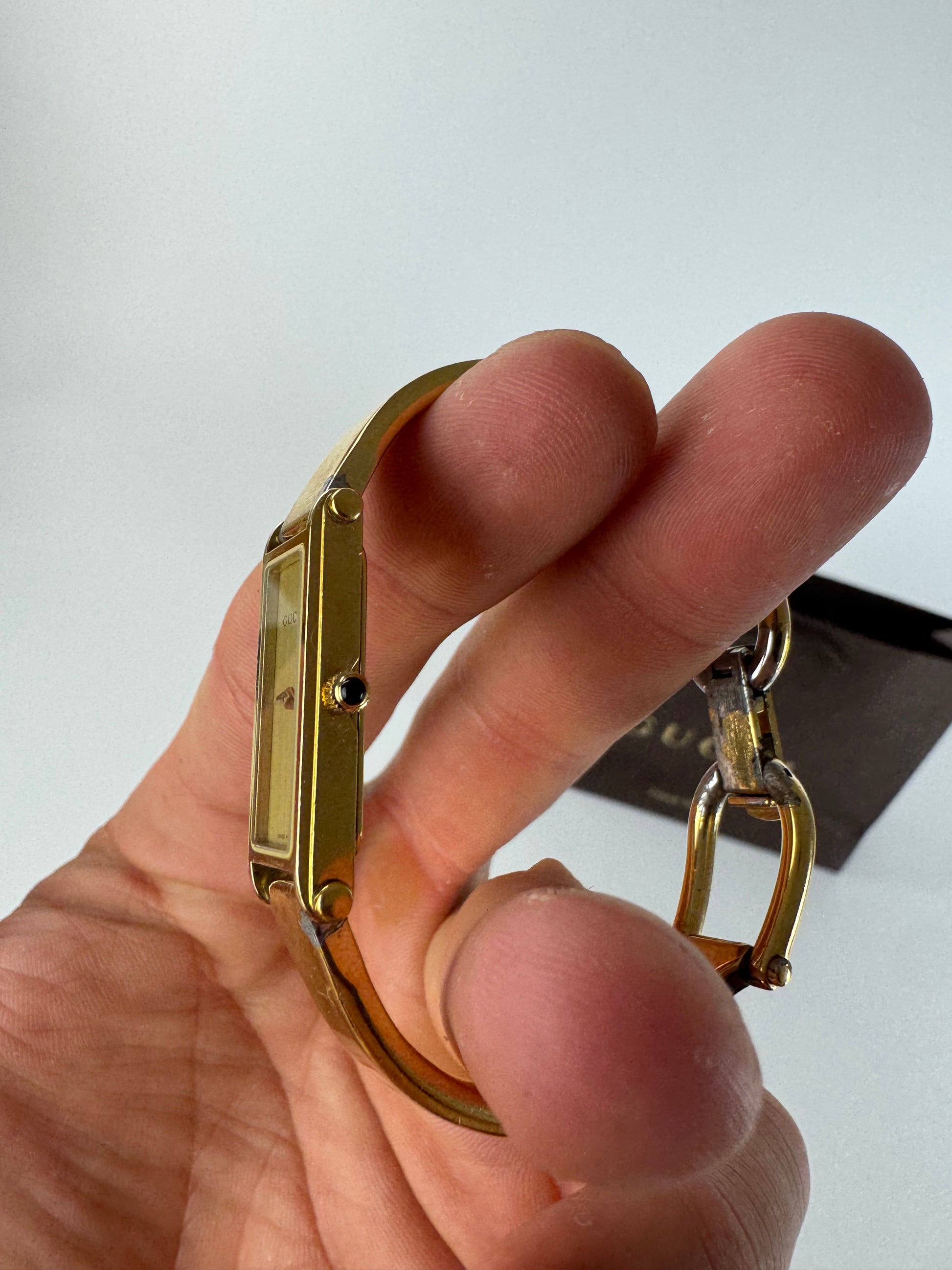 Cette élégante montre est finement ouvragée en acier doré et arbore le motif signature Gucci Horsebit. Son cadran doré est rehaussé d'aiguilles dorées assorties. Elle est animée par un mouvement à quartz et arbore une silhouette fine et sophistiquée.