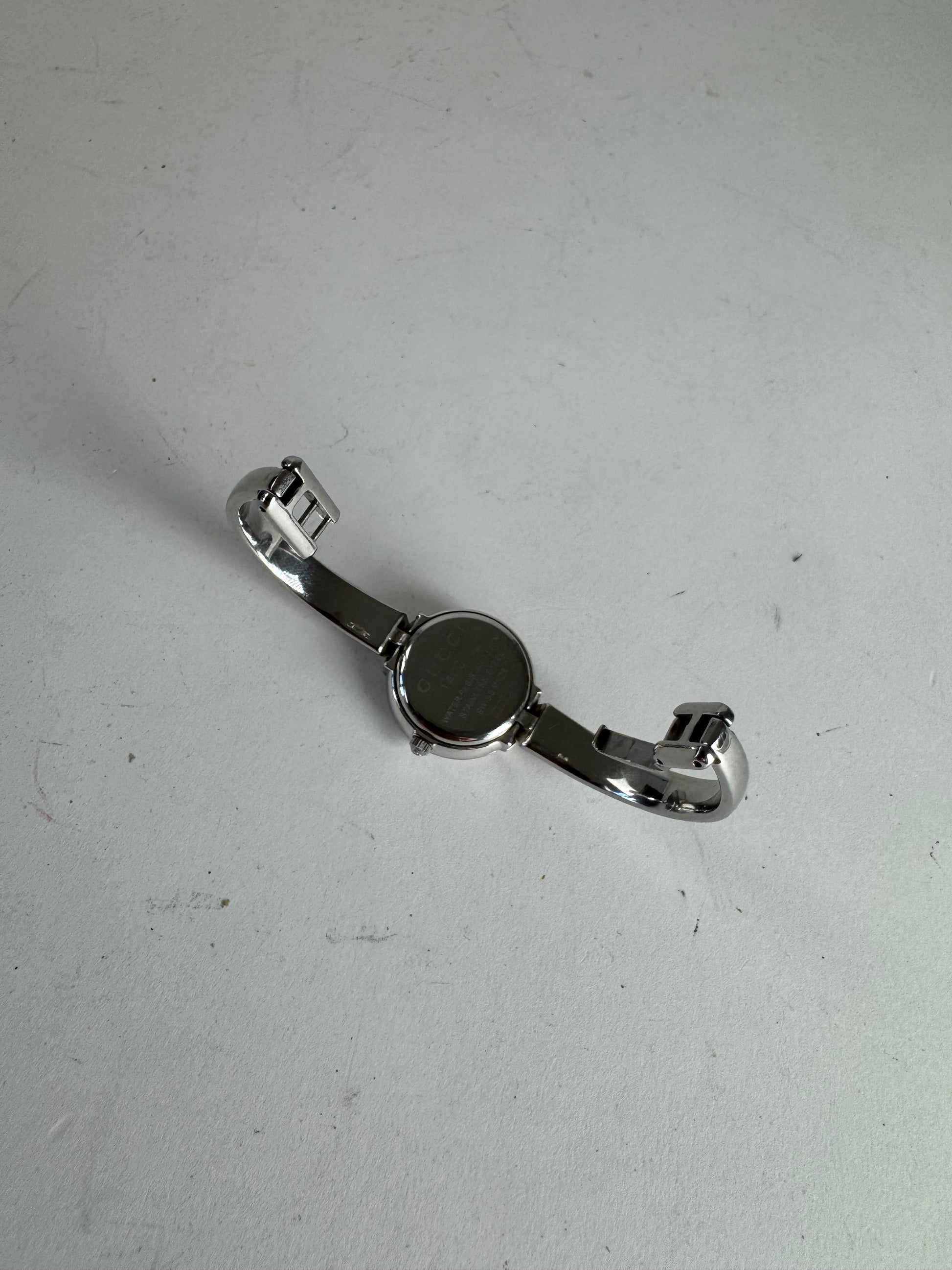 Montre vintage GUCCI. Ce garde-temps chic est finement confectionné en acier inoxydable argenté avec un cadran blanc. Il est doté d'un mouvement à quartz de fabrication suisse et est étanche.
