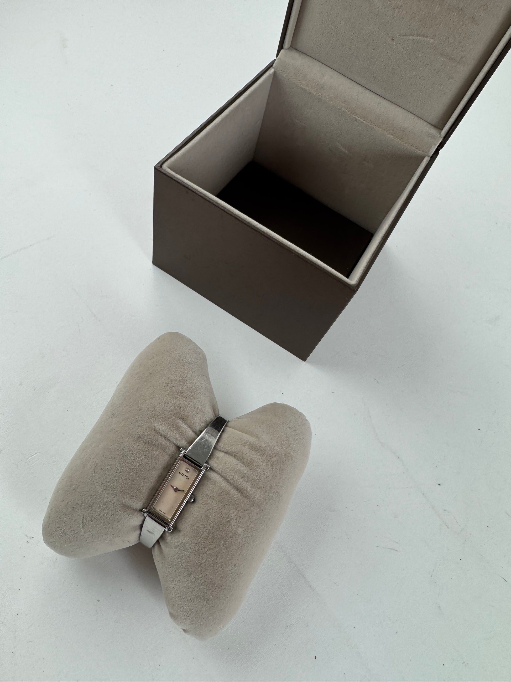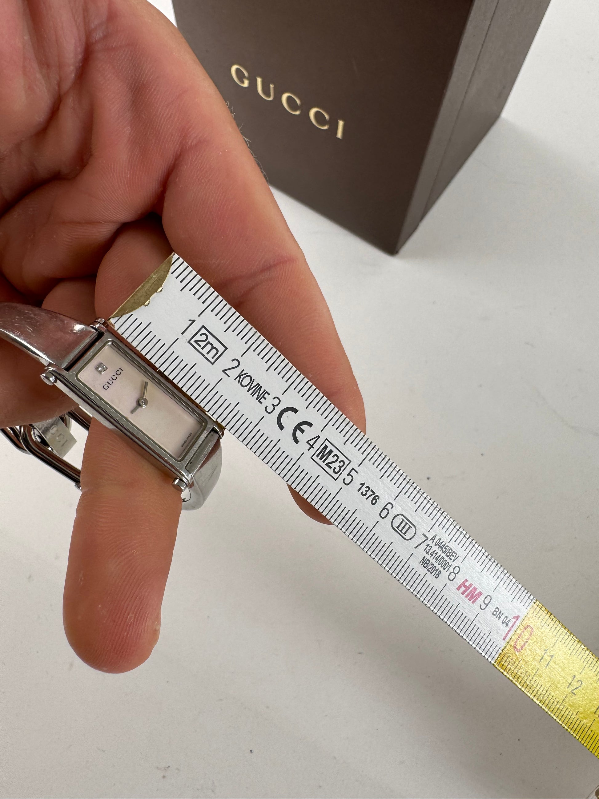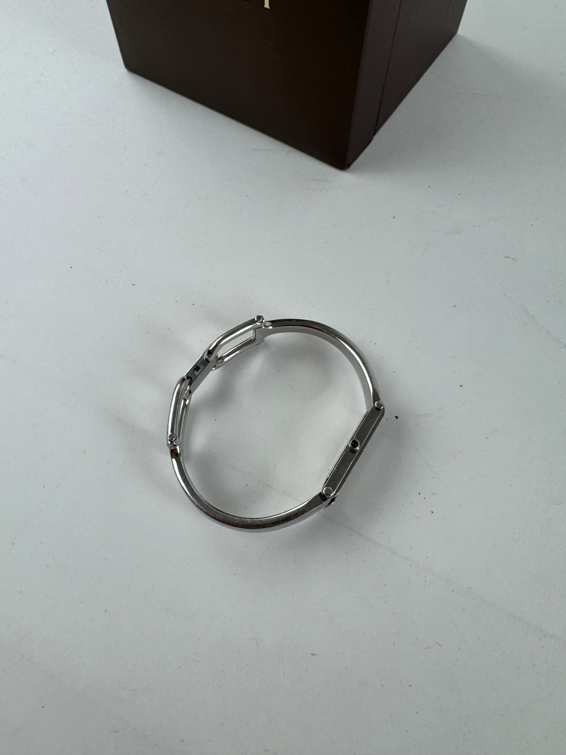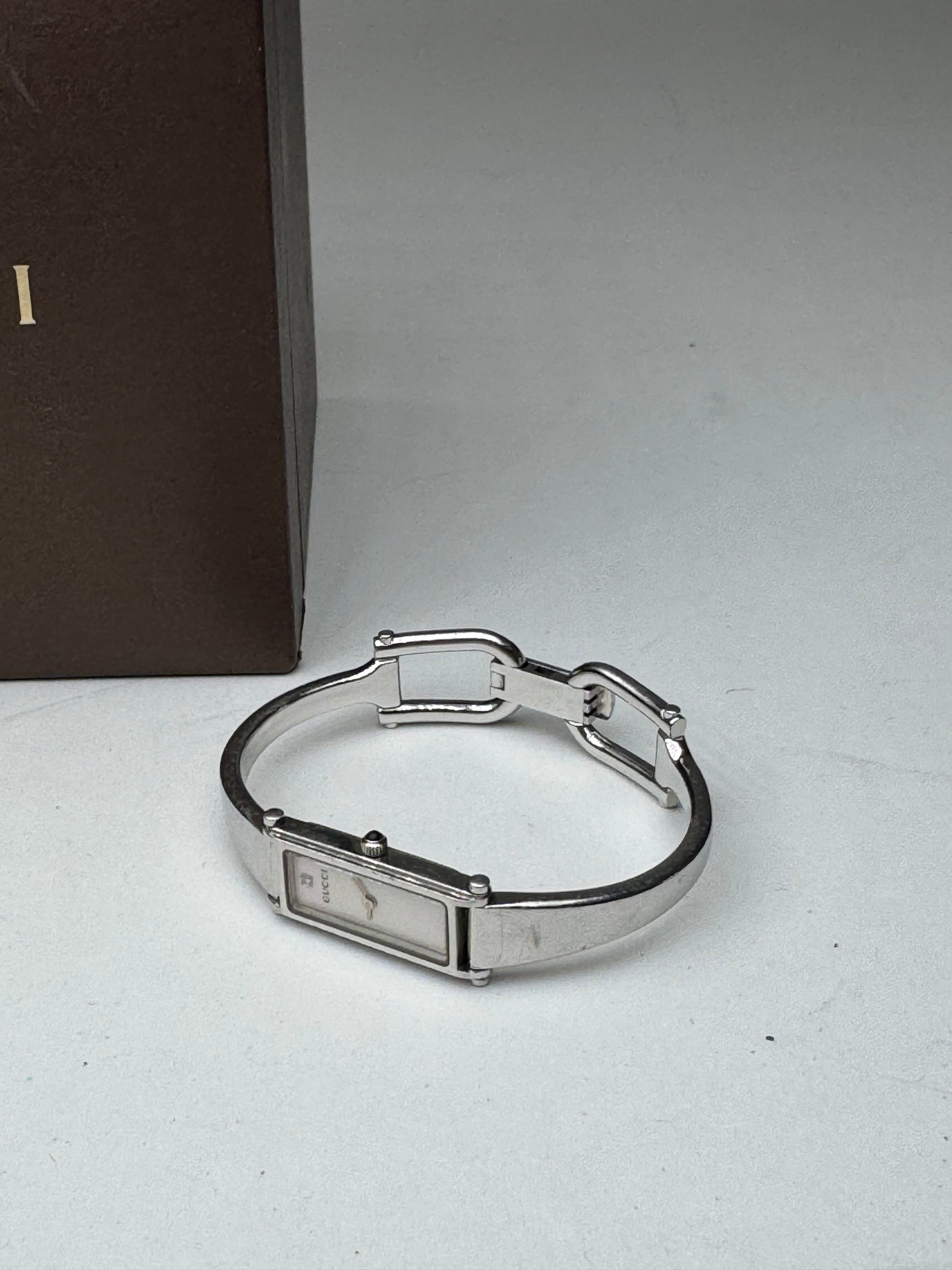 Montre à quartz GUCCI Horsebit argent et acier. Cette élégante montre est confectionnée dans un mélange d'argent et d'acier inoxydable, avec un cadran blanc et des aiguilles argentées assorties. Le bracelet et le fermoir sont également en argent et en acier inoxydable, créant un style cohérent et raffiné. Le boîtier mesure 2,5 cm de haut et 1 cm de large, avec un diamètre réglable de 6 à 6,5 cm. La montre est à quartz et sa pile a été récemment remplacée. Fabriquée en Suisse.