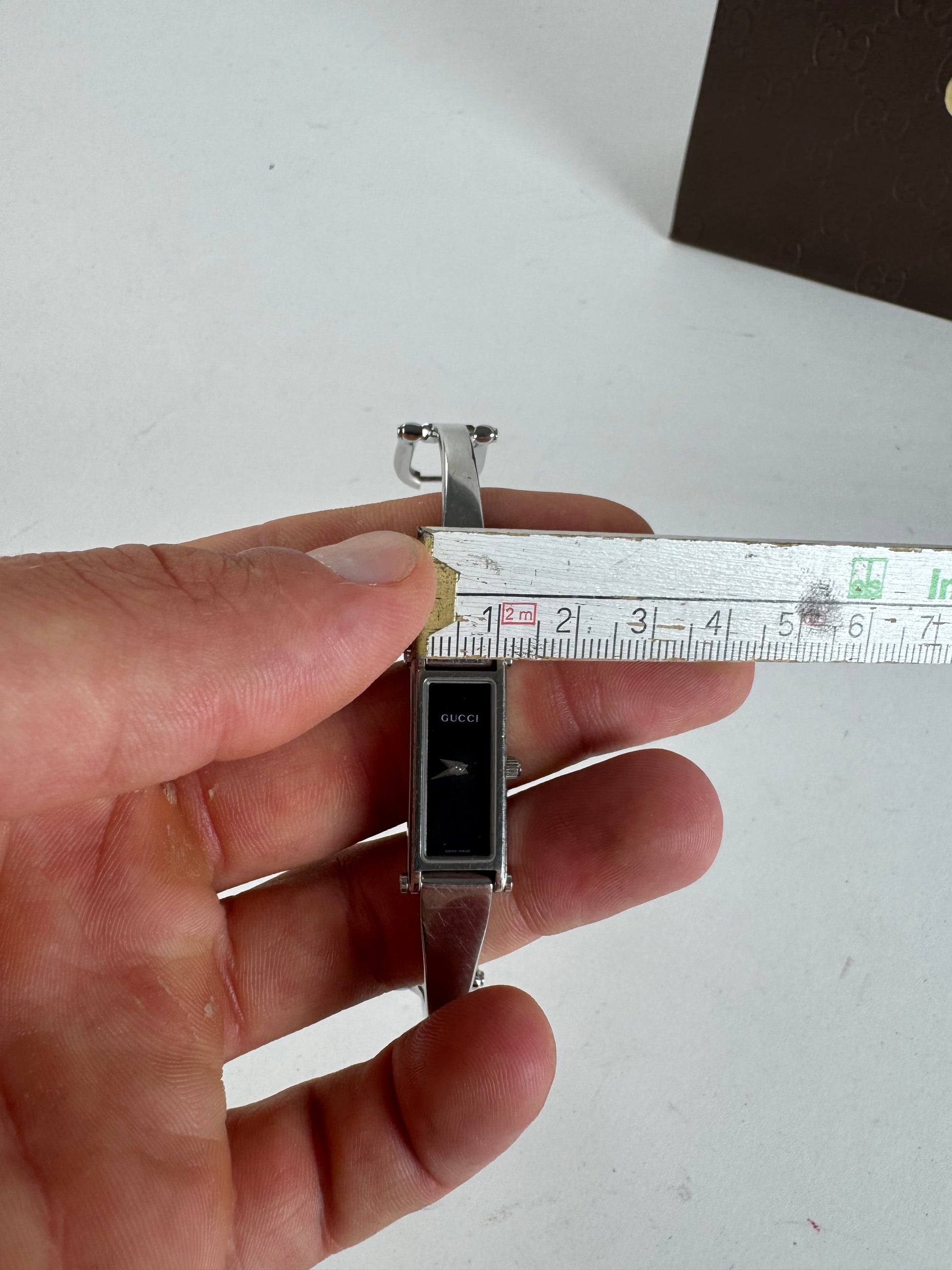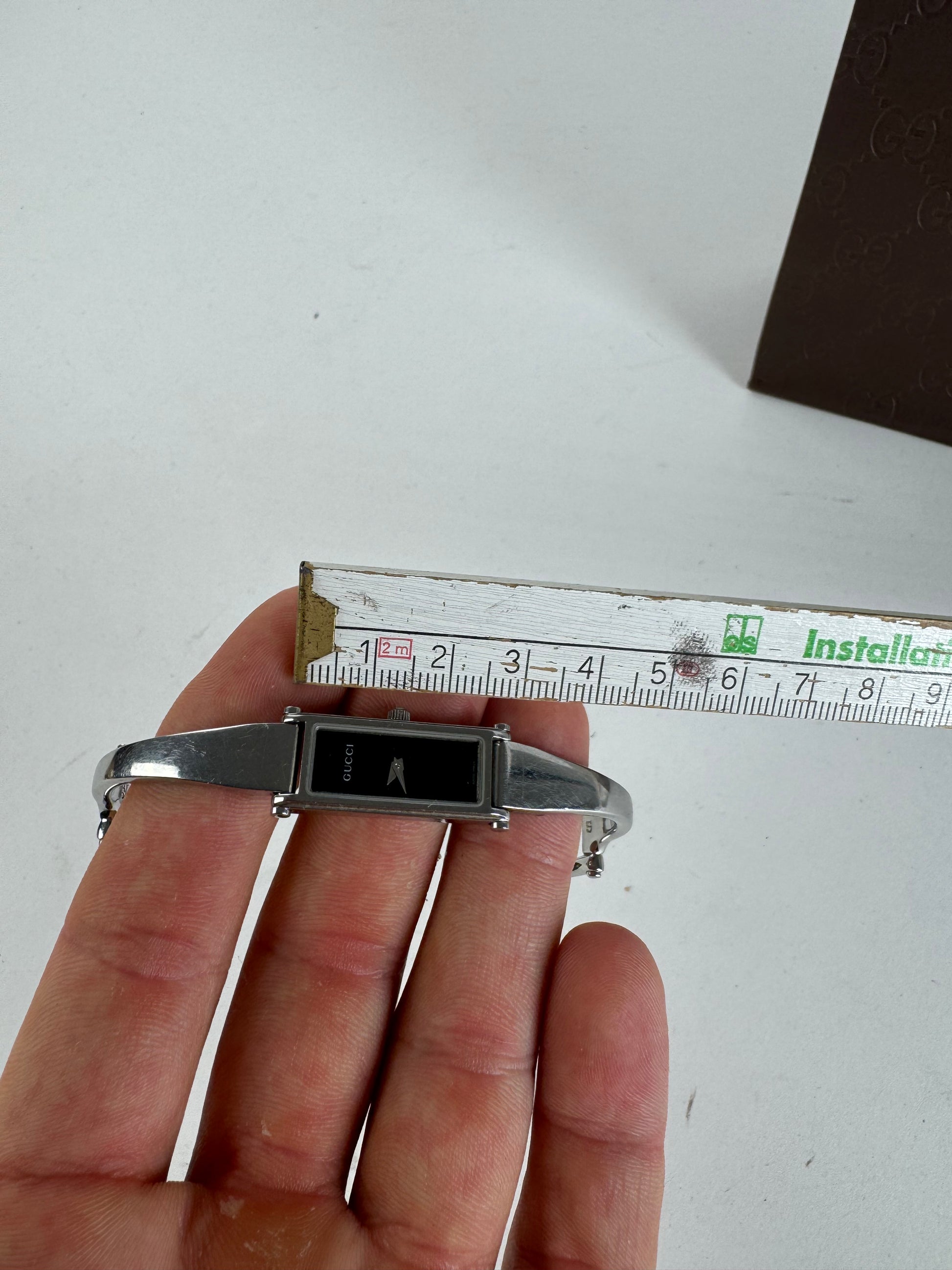 Montre GUCCI Vintage Mors en acier argenté. Cette élégante montre vintage est entièrement réalisée en acier argenté, avec son bracelet emblématique style Mors. Elle arbore un cadran noir avec des aiguilles en acier argenté et des détails minimalistes. La référence 1500L gravée au fond du boîtier l'identifie comme faisant partie de la collection classique de montres rectangulaires pour femme de Gucci. Introduit dans les années 1950, le motif Mors s'inspire de l'héritage équestre et est devenu l'un des symboles les plus intemporels du luxe intemporel et du savoir-faire italien de Gucci.