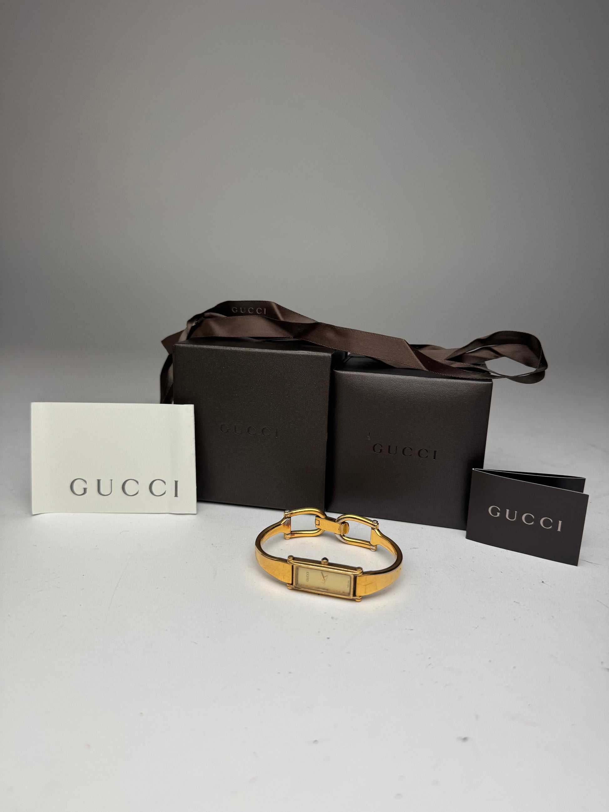 This sophisticated vintage timepiece is finely crafted of gold-tone steel and features Gucci’s iconic Horsebit design — a symbol introduced in the 1950s that embodies the brand’s heritage of equestrian elegance and Italian craftsmanship. The watch showcases a matching gold dial with golden hands and operates on a precise quartz movement. The battery has been recently replaced, ensuring reliable performance.