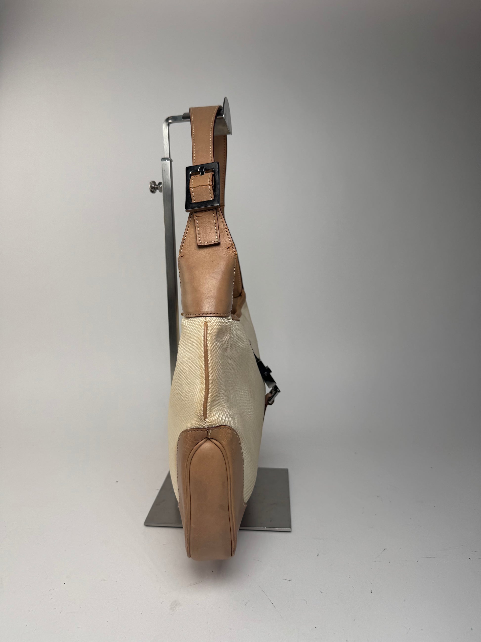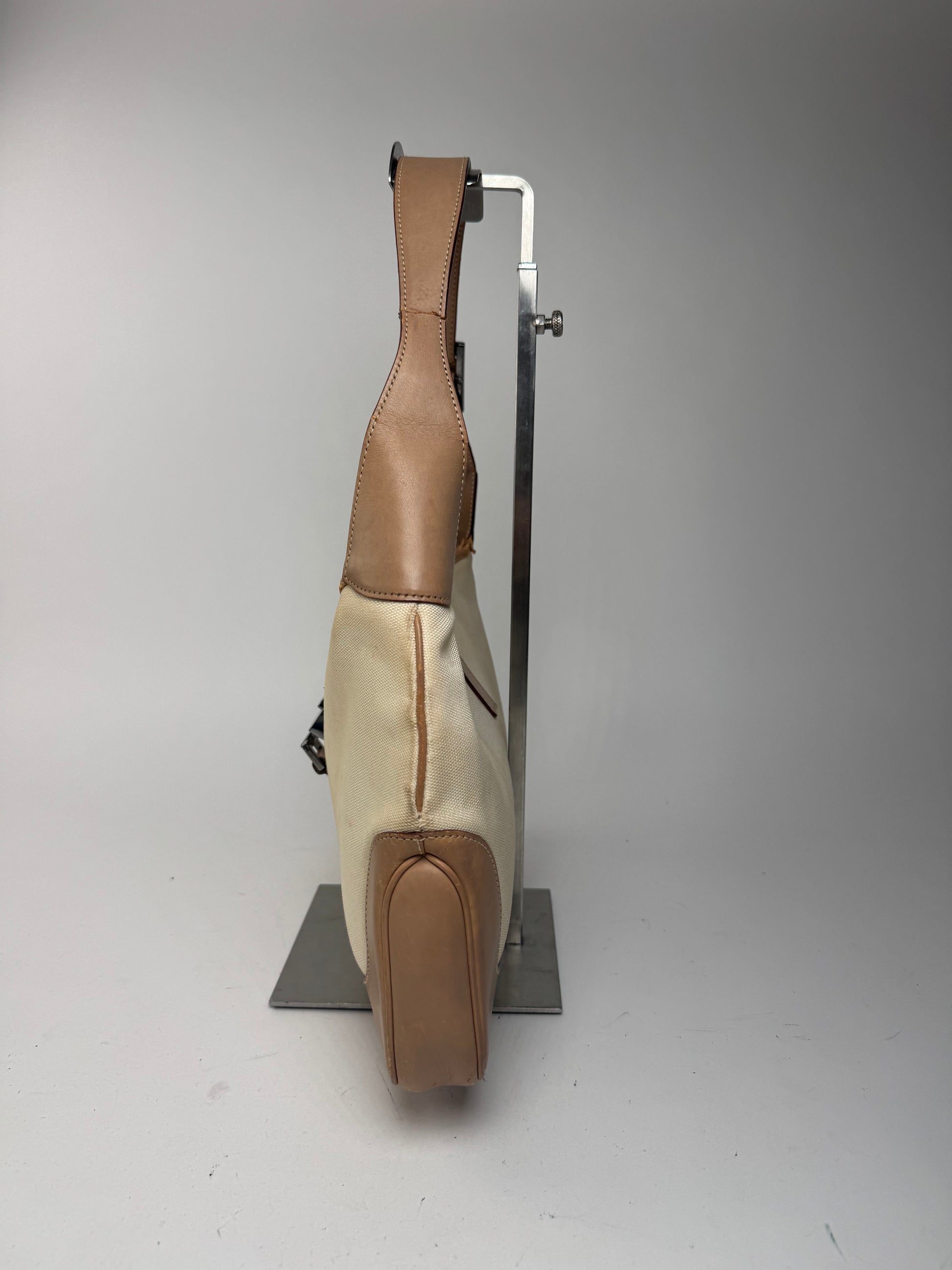 Cet élégant sac à main est finement confectionné en cuir beige-marron avec des empiècements en toile beige. Il est doté d'accessoires en acier argenté et de la silhouette emblématique du sac hobo Jackie. Lancé dans les années 1960 et baptisé en hommage à Jackie Kennedy, le sac Jackie est rapidement devenu l'un des modèles les plus emblématiques de Gucci, incarnant une élégance naturelle et un style intemporel. L'intérieur est doublé en polyester beige-marron avec un imprimé logo Gucci.