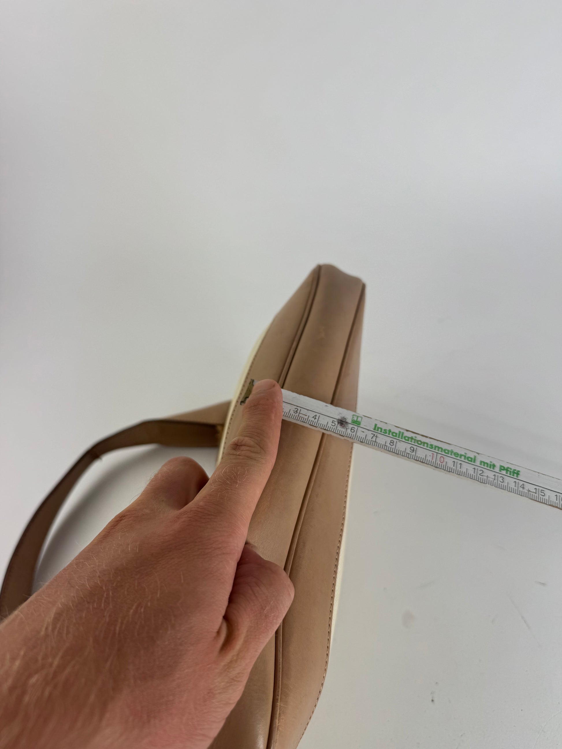 État : L'extérieur en cuir et en toile présente de légères taches. La bandoulière est fragile et présente des signes d'usure. Les finitions argentées restent brillantes, avec de légères rayures. La doublure intérieure avec logo est propre et a été peu utilisée.