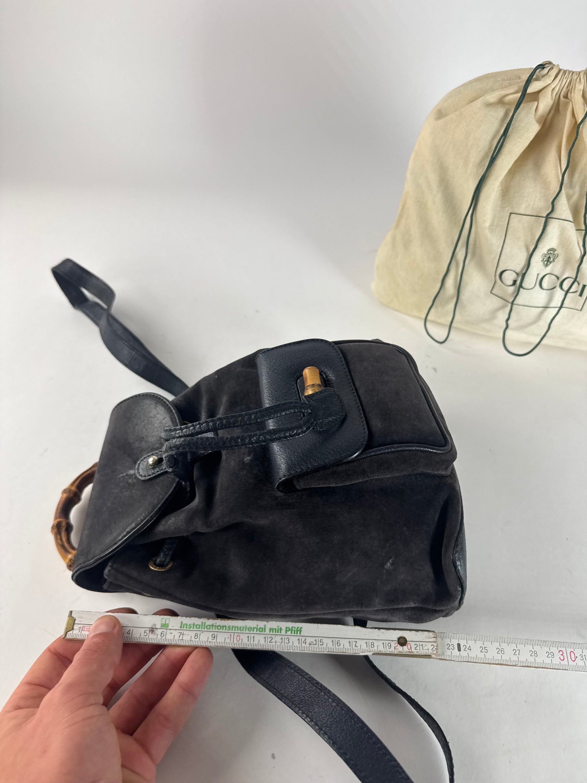 GUCCI Vintage Suede Bamboo Backpack. This iconic vintage backpack is finely crafted of black suede leather with black leather trimming. The design features a distinctive bamboo top handle and a brown bamboo turn-lock closure on the small front pocket, a signature Gucci detail. Accented with gold-tone steel hardware, the backpack opens to a navy patterned canvas interior. Likely dating from the 1990s, it reflects Gucci’s timeless craftsmanship and design heritage.